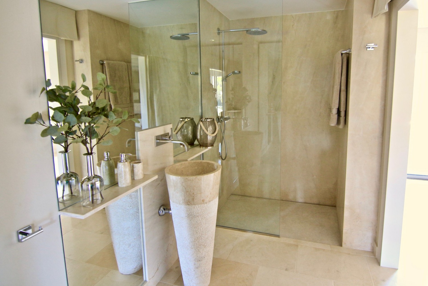 First floor: 1 master suite with bathroom, dressing room and lounge with open fireplace, 2 further bedrooms, each with bathroom en suite.