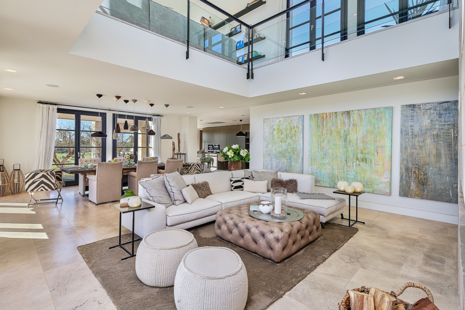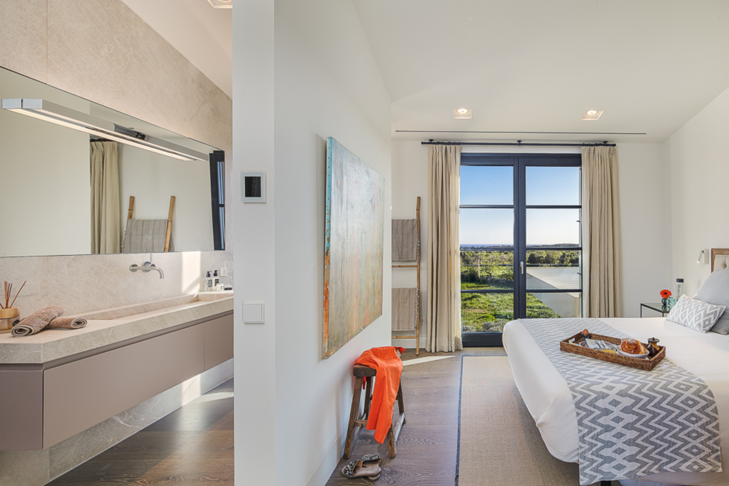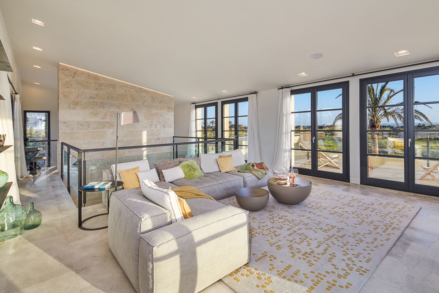 On the upper floor of this living area you find an open, light-flooded living room on the gallery with a spectacular all-round view. Towards the South-side you can enjoy a panoramic sea view and towards the North-side the splendiferous view to the village Santanyi and further to the undulating Mallorcan landscape. Westwards you have the pleasure of experiencing breath-taking sunsets.