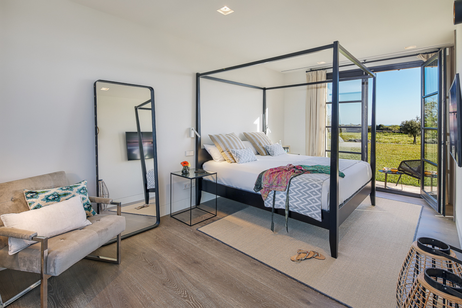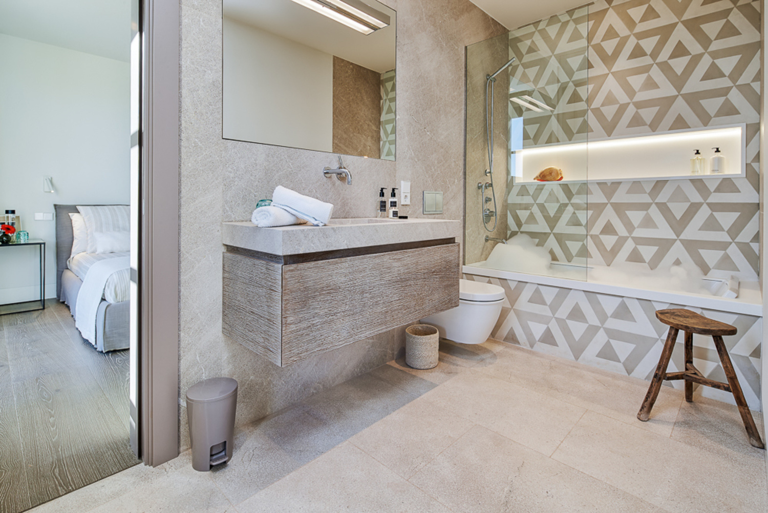 On the upper floor of the sleeping area you find the master bedrooms with a bathroom en suite with bathtub and a further bedroom with bathroom en suite.