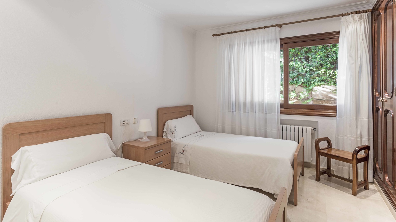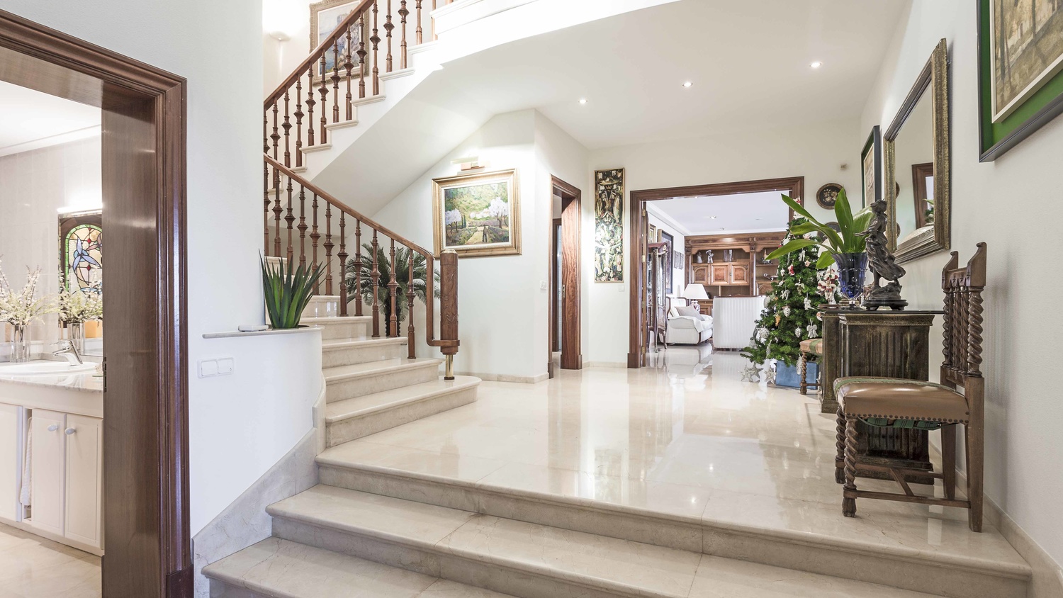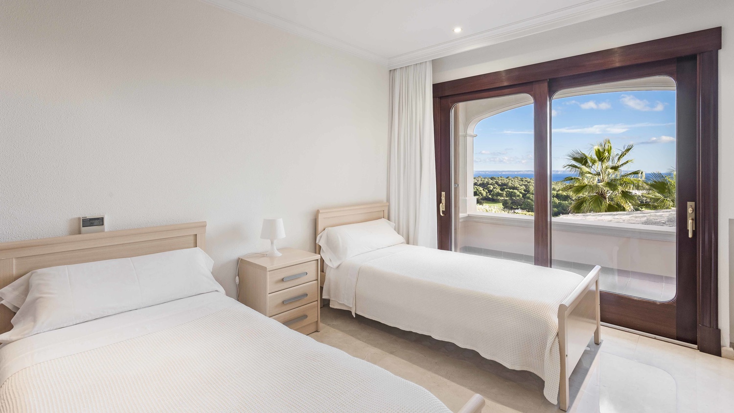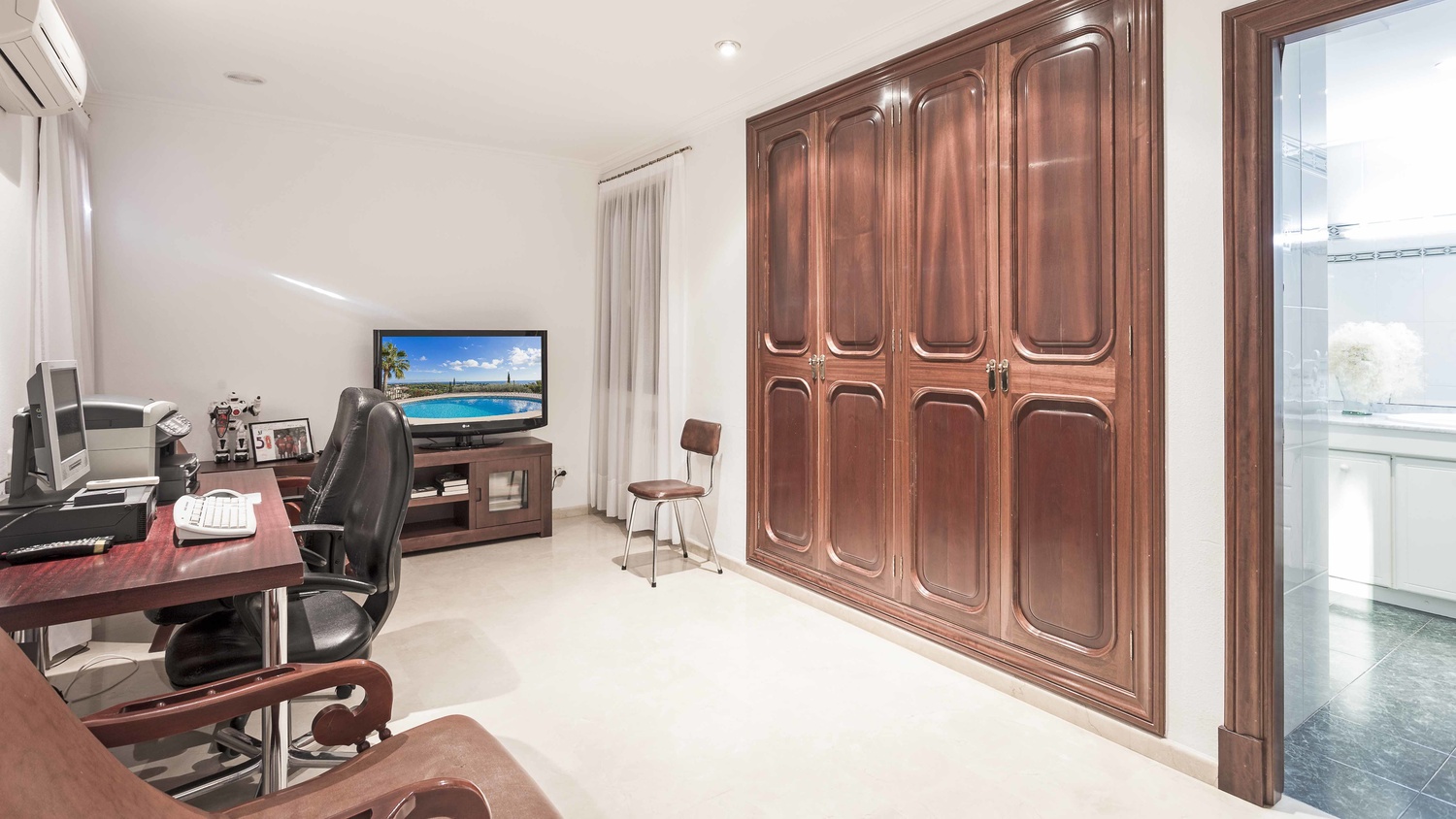 On the ground level is a main entrance with double high ceilings, a generous living-dining room, which leads to the lovely pool area, from where you can enjoy one of the best views of Bendinat. Furthermore, there is a separate fully equipped kitchen with an adjacent side room, which is currently being used as a sitting room, further there is an office with a en-suite bathroom, a laundry room and a guest cloakroom.
