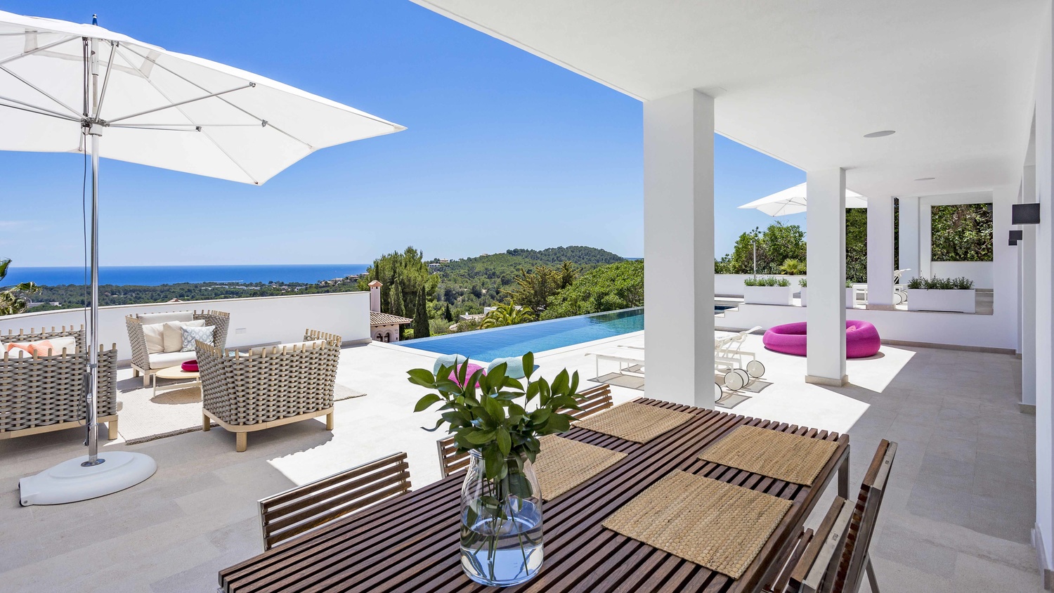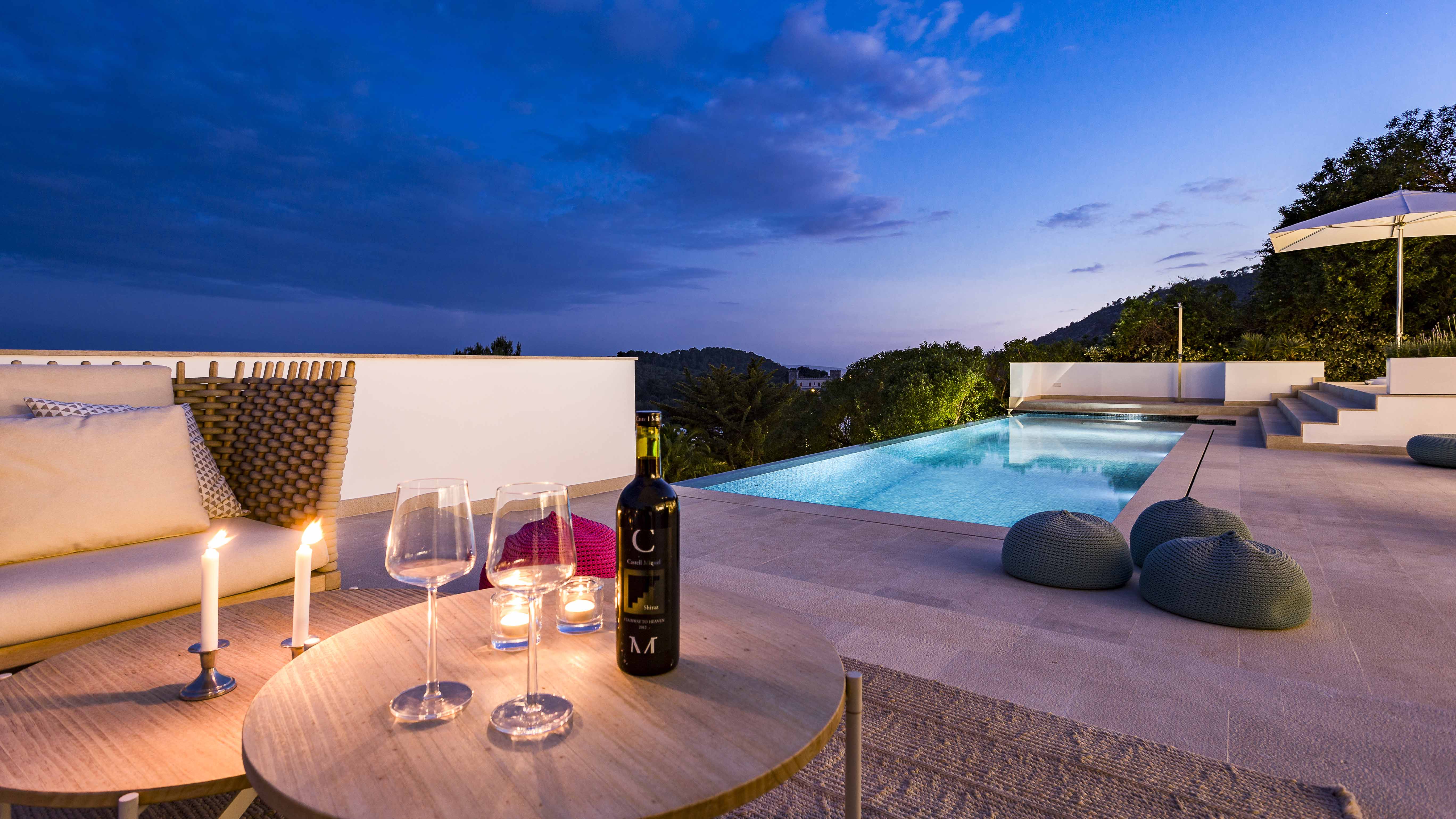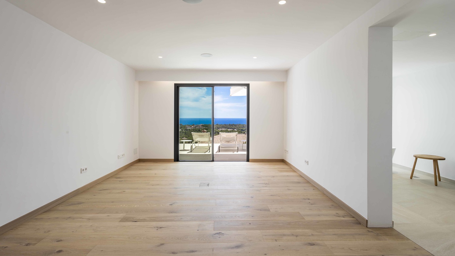 Ground floor: entrance hall, bright living-dining area with open kitchen, several utility rooms, guest toilet, master bedroom with en-suite bathroom, Turkish bath and dressing room. All rooms have large double-glazed windows with direct access to the terrace and the 12-meter infinity pool.