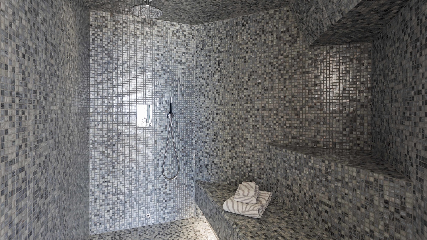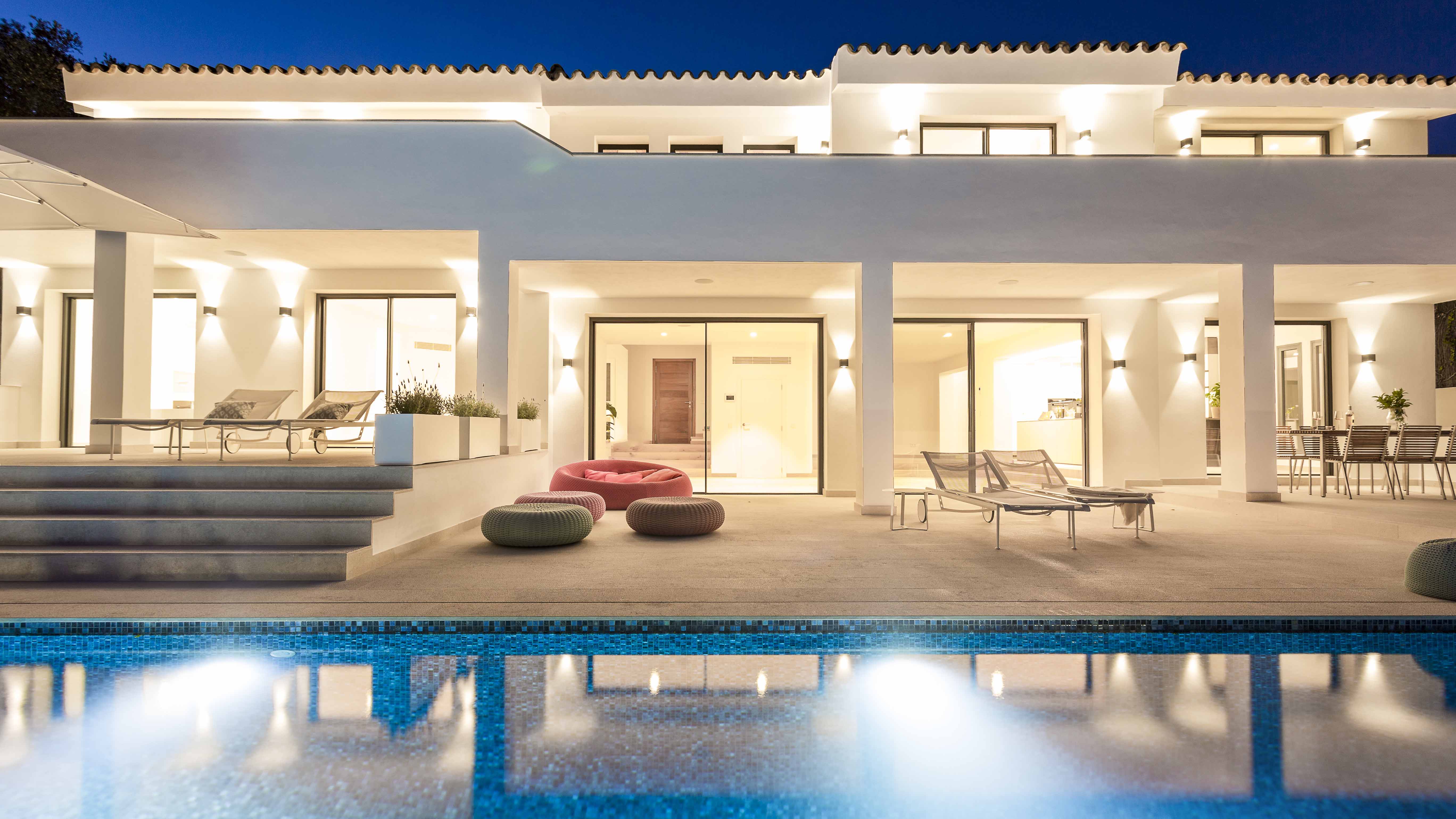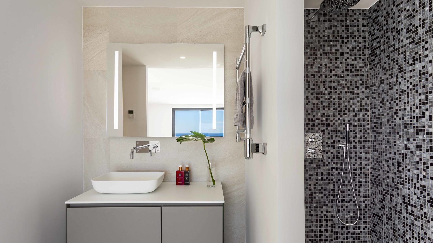 Ground floor: entrance hall, bright living-dining area with open kitchen, several utility rooms, guest toilet, master bedroom with en-suite bathroom, Turkish bath and dressing room. All rooms have large double-glazed windows with direct access to the terrace and the 12-meter infinity pool.
