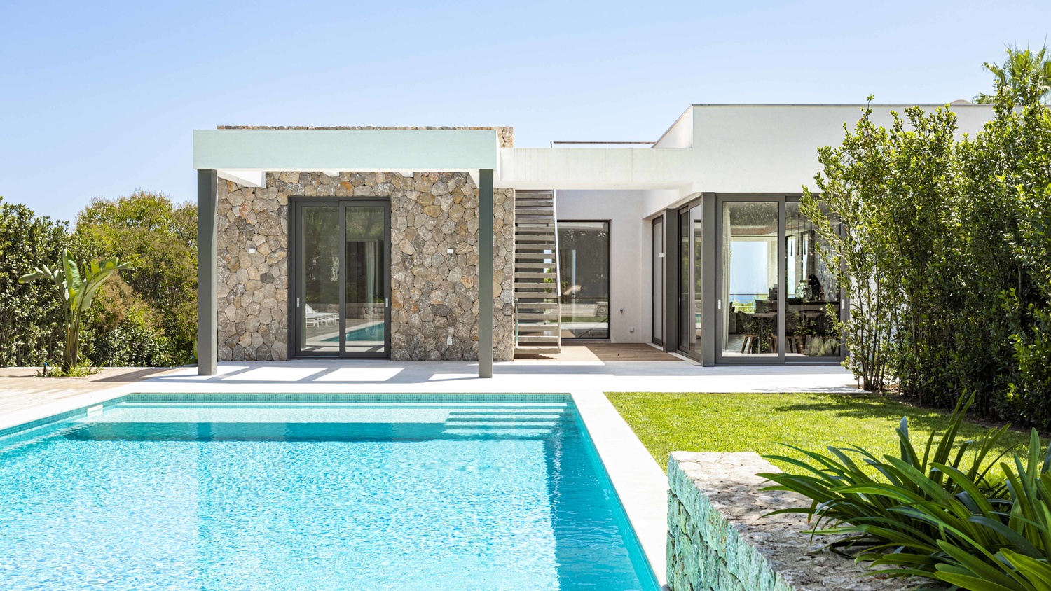 First floor: a guest bedroom with en-suite bathroom and the master bedroom with large en-suite bathroom and dressing area. The entire facade offers sea views. On one side of this floor there is a large living room of about 55 m2 and on the other side you can find the kitchen open to the dining room of about 43 m2. This floor boasts an 82 m2 pool as well.