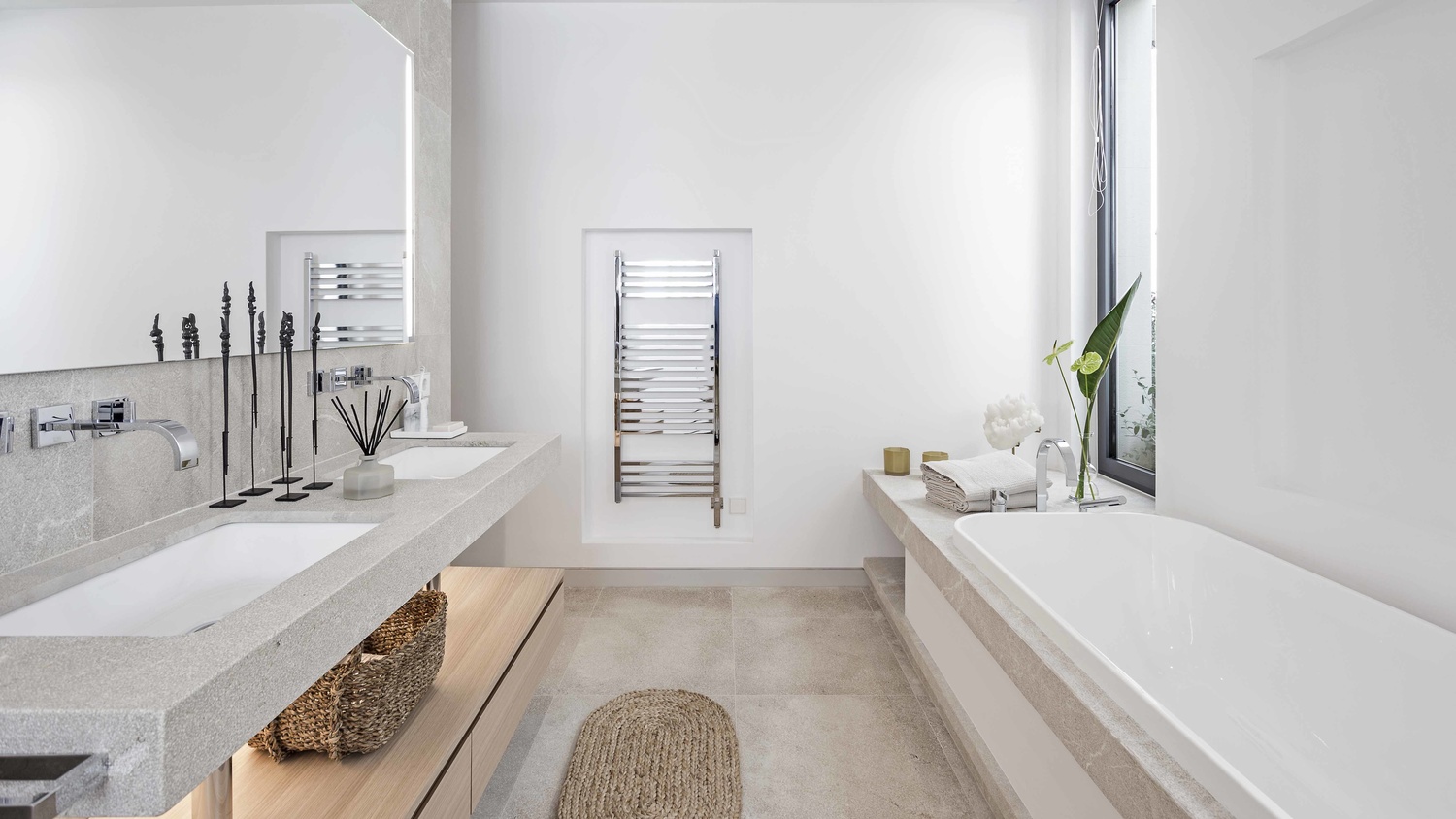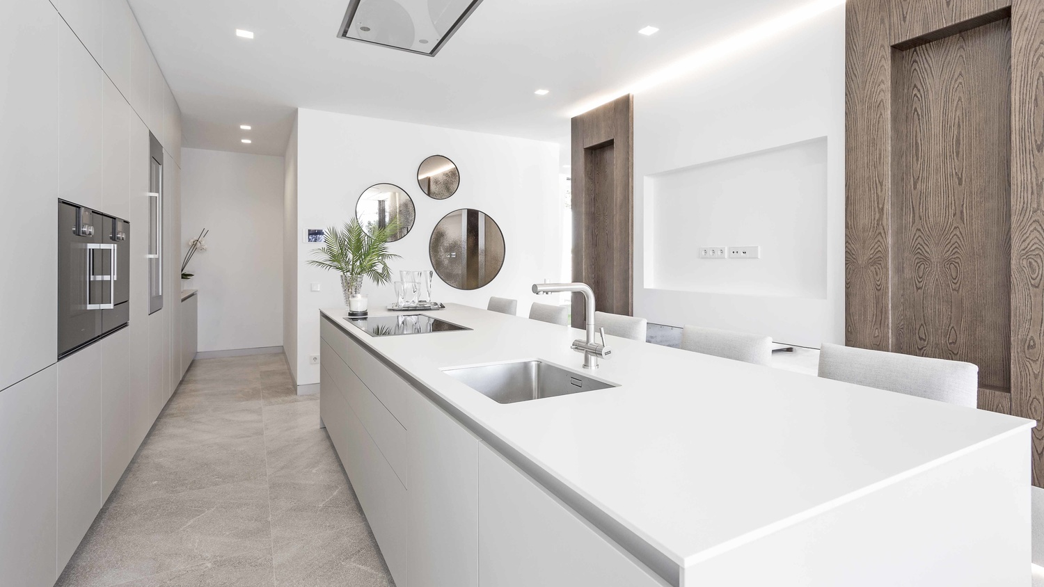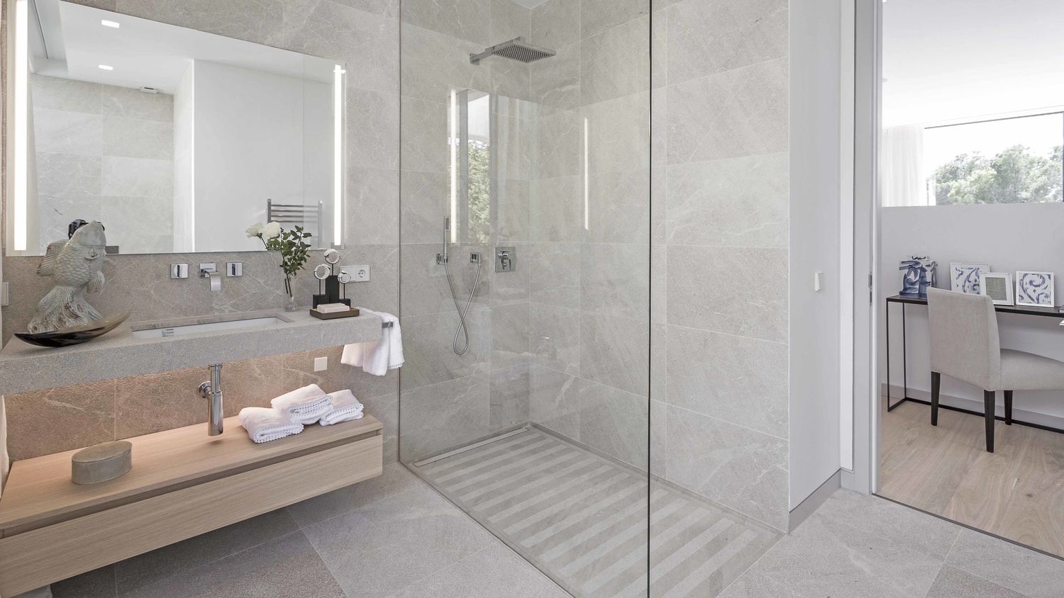 On the ground floor of 220 m2, there is one bedroom with bathroom en-suite and dressing room, and the generously proportioned living room, which opens towards two terraces, one of them indoor and the other one outside and both with panoramic views to the sea. Large sliding panorama windows let a lot of daylight brighten up this area. Further, there is a spacious designer kitchen with high-end kitchen appliances, a dining room and a guest toilet. The area of the terraces has a total of approximately 133 m2 plus a pool of 55 m2.