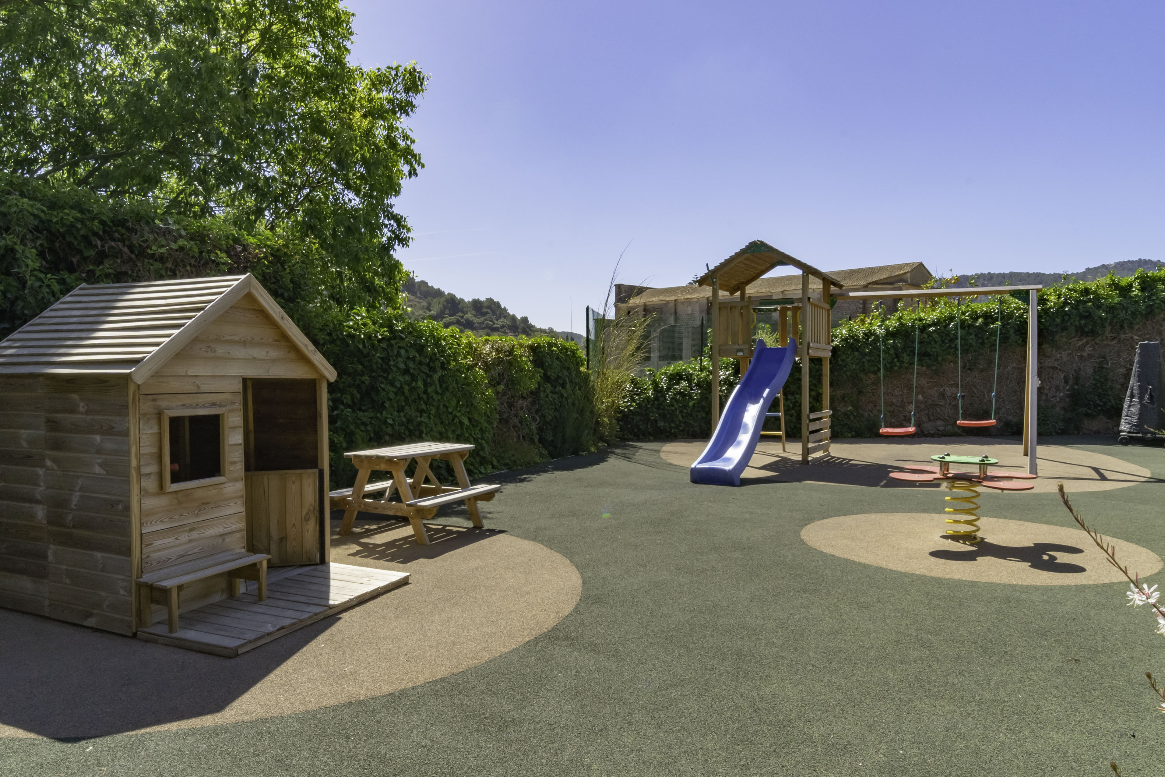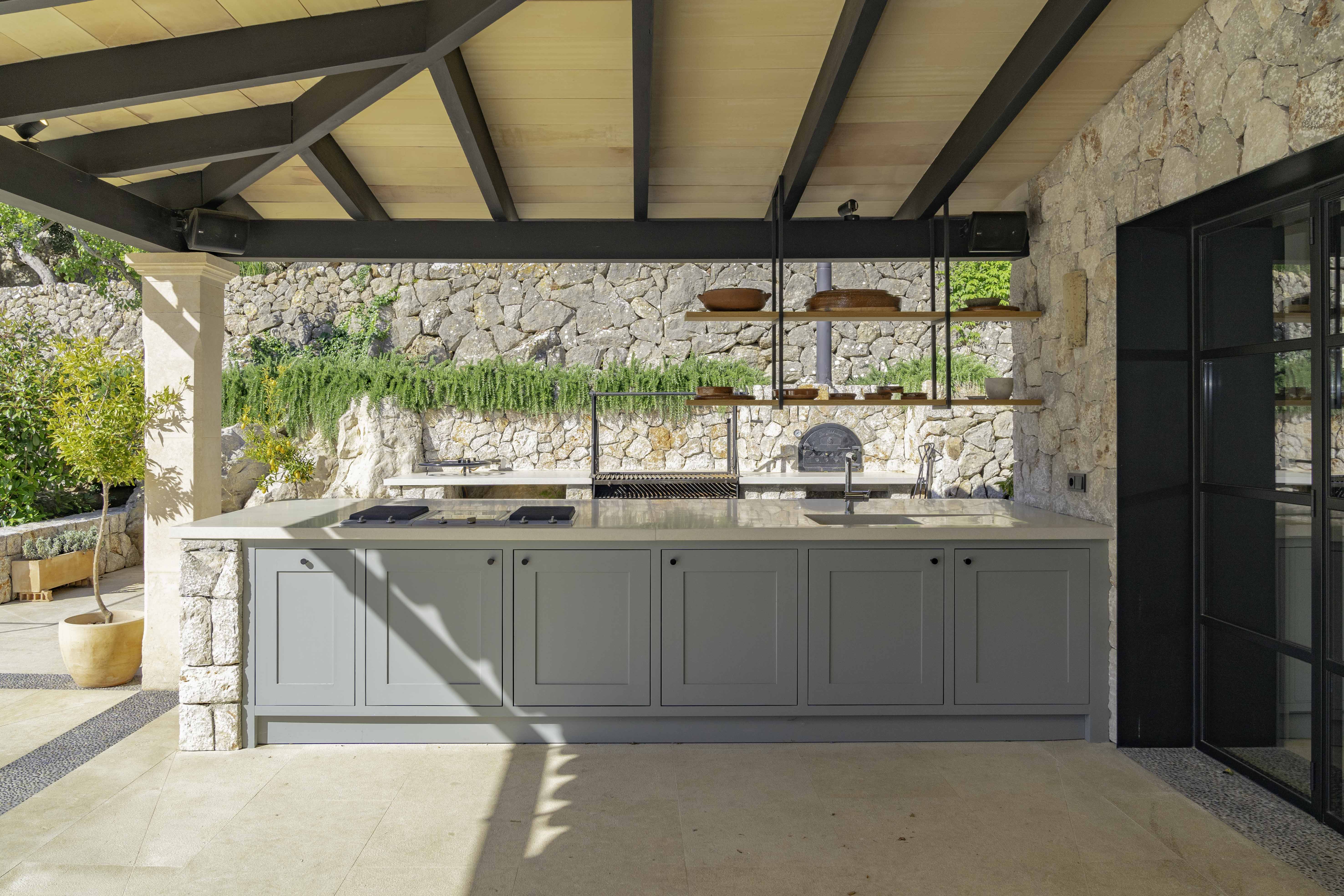 The plot is divided into several spacious terraces with a grass area below. There are beautiful stone walls all around the house as well as a playground and a chillout terrace with jacuzzi, perfect for taking in the stunning surroundings. The wide driveway of the property leads to a carport for three cars. There is a second access to the property where further four cars can be parked. The inviting pool area features a fully equipped bar, a summer kitchen, and both open and covered terraces.