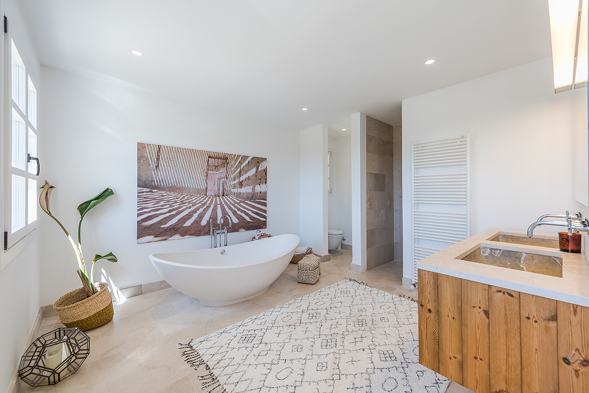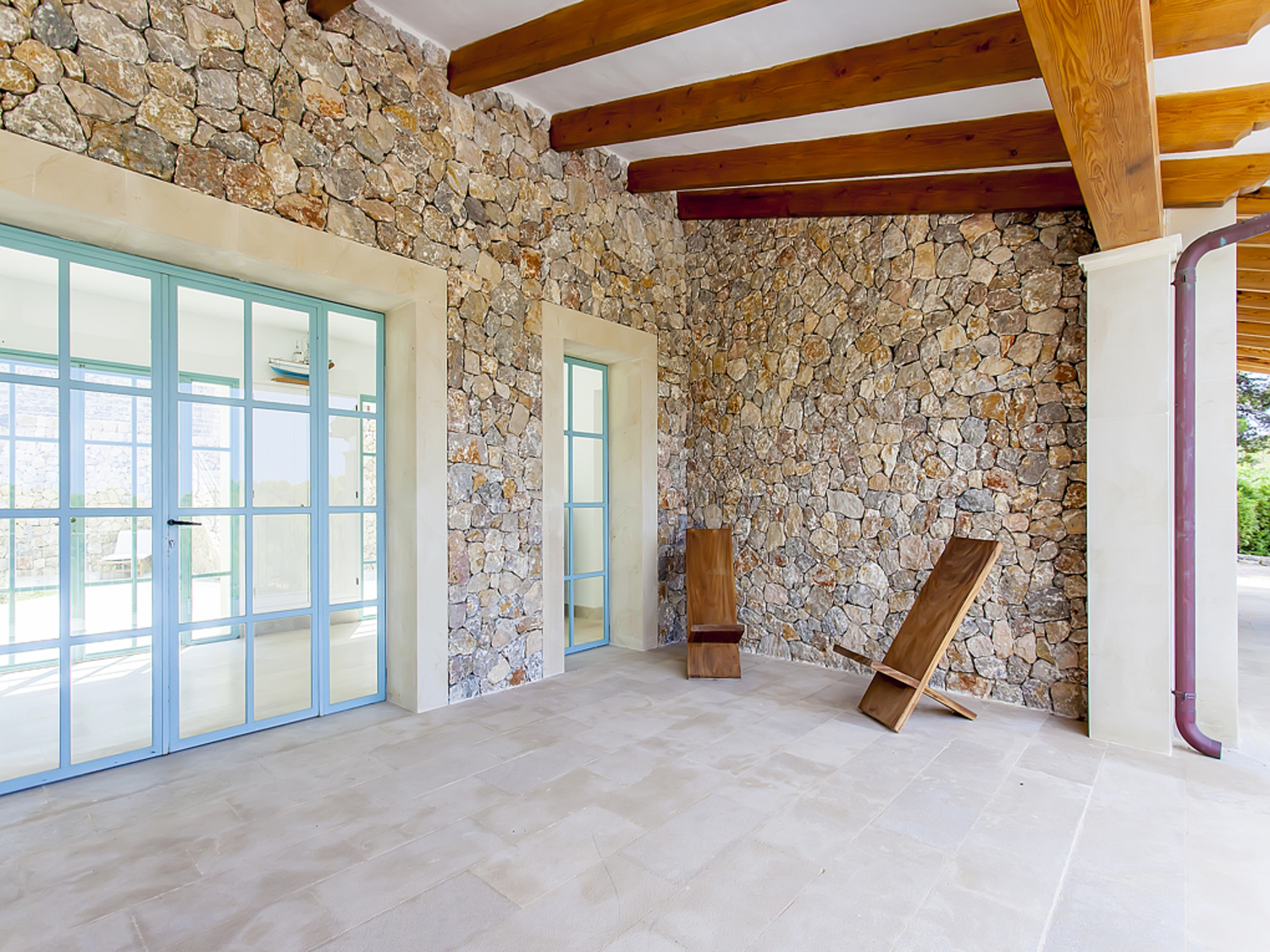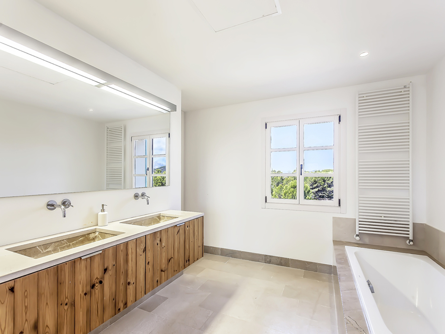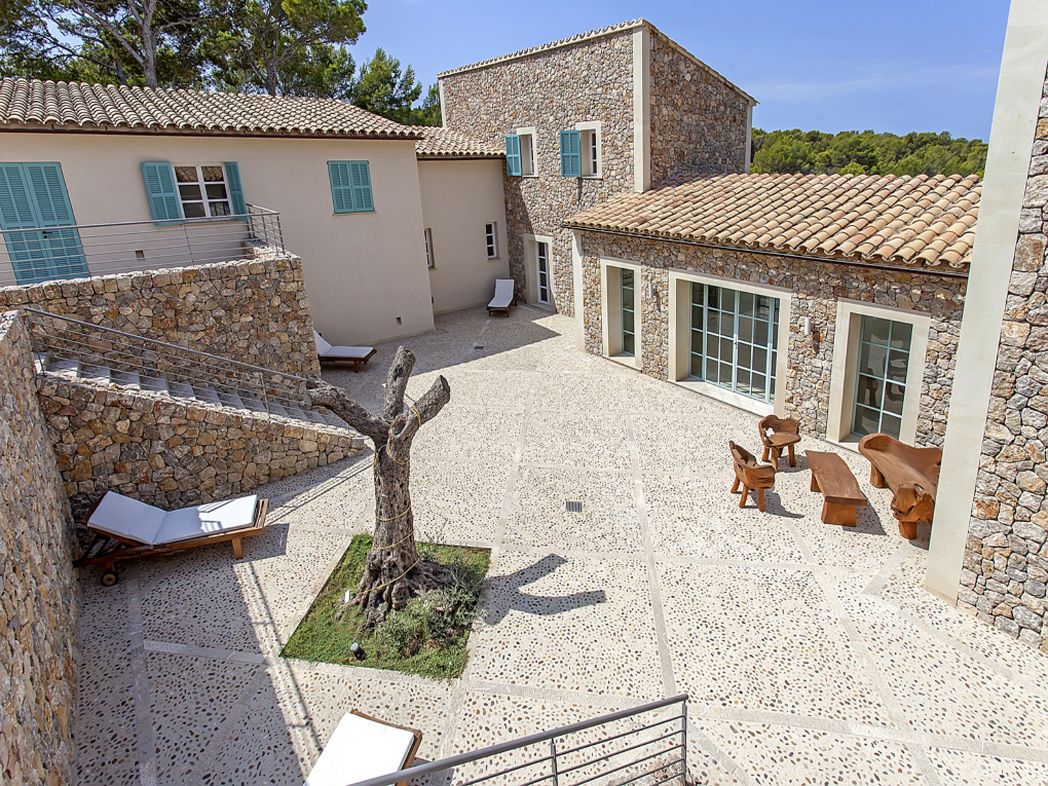 In the main house you can find the inviting living area with a fireplace and an ultra-modern, open kitchen with dining room. In the south and east wings there are 4 bedrooms and 3 bathrooms as well as an additional guest apartment. Son Massot has large glass doors on both outer sides of the main house which makes the property extremely light-flooded and provides you with fantastic views to the outside area. Particularly noteworthy is the meticulous interior design which combines seamlessly with the natural elements.