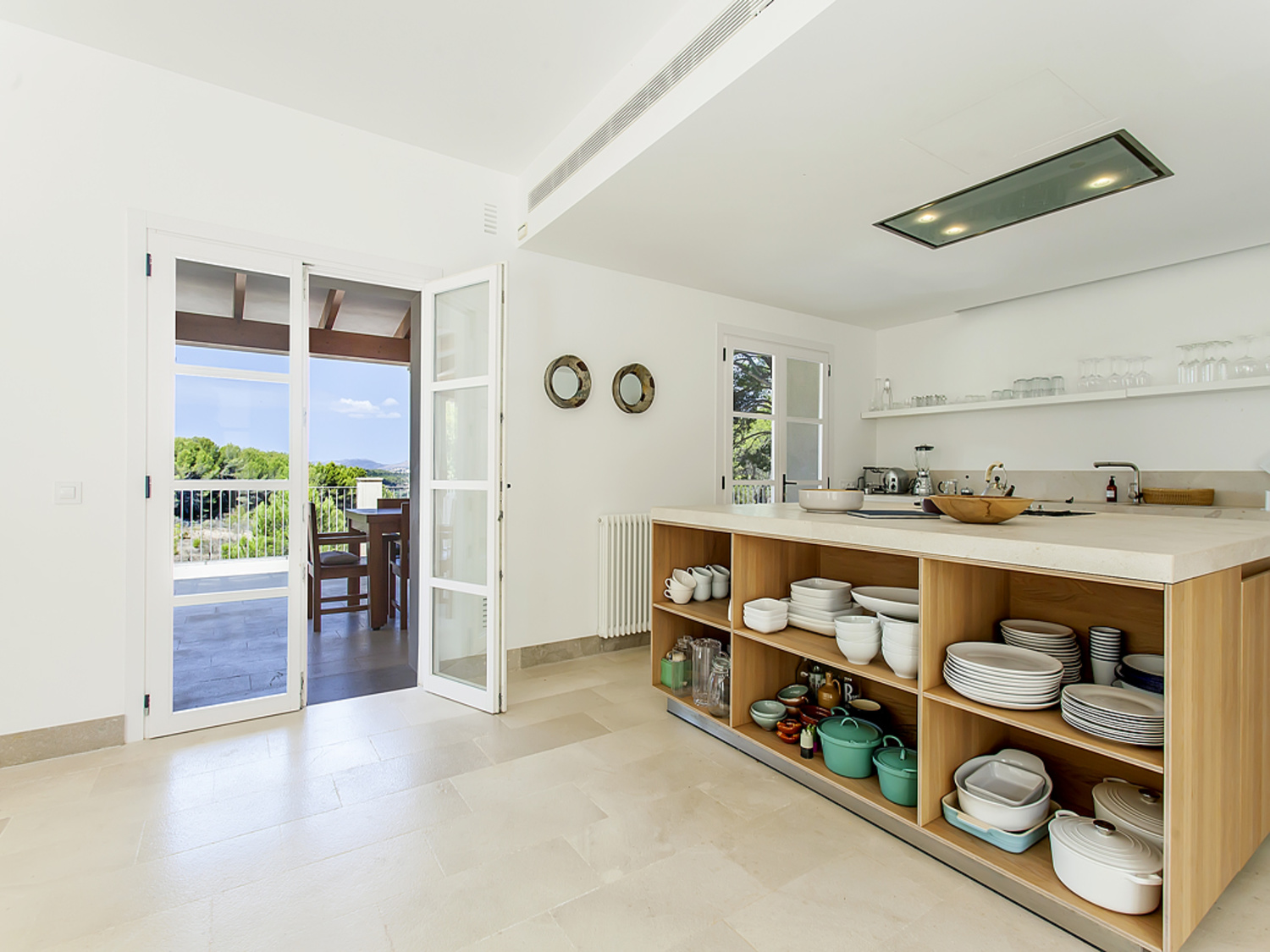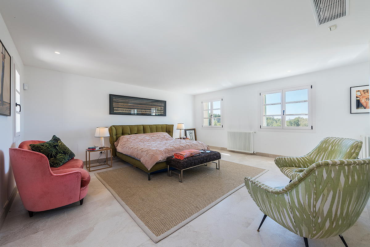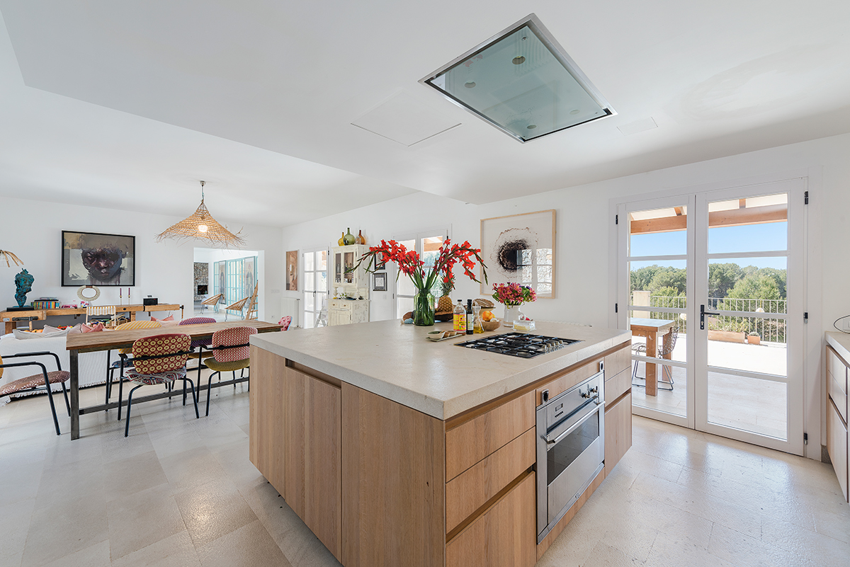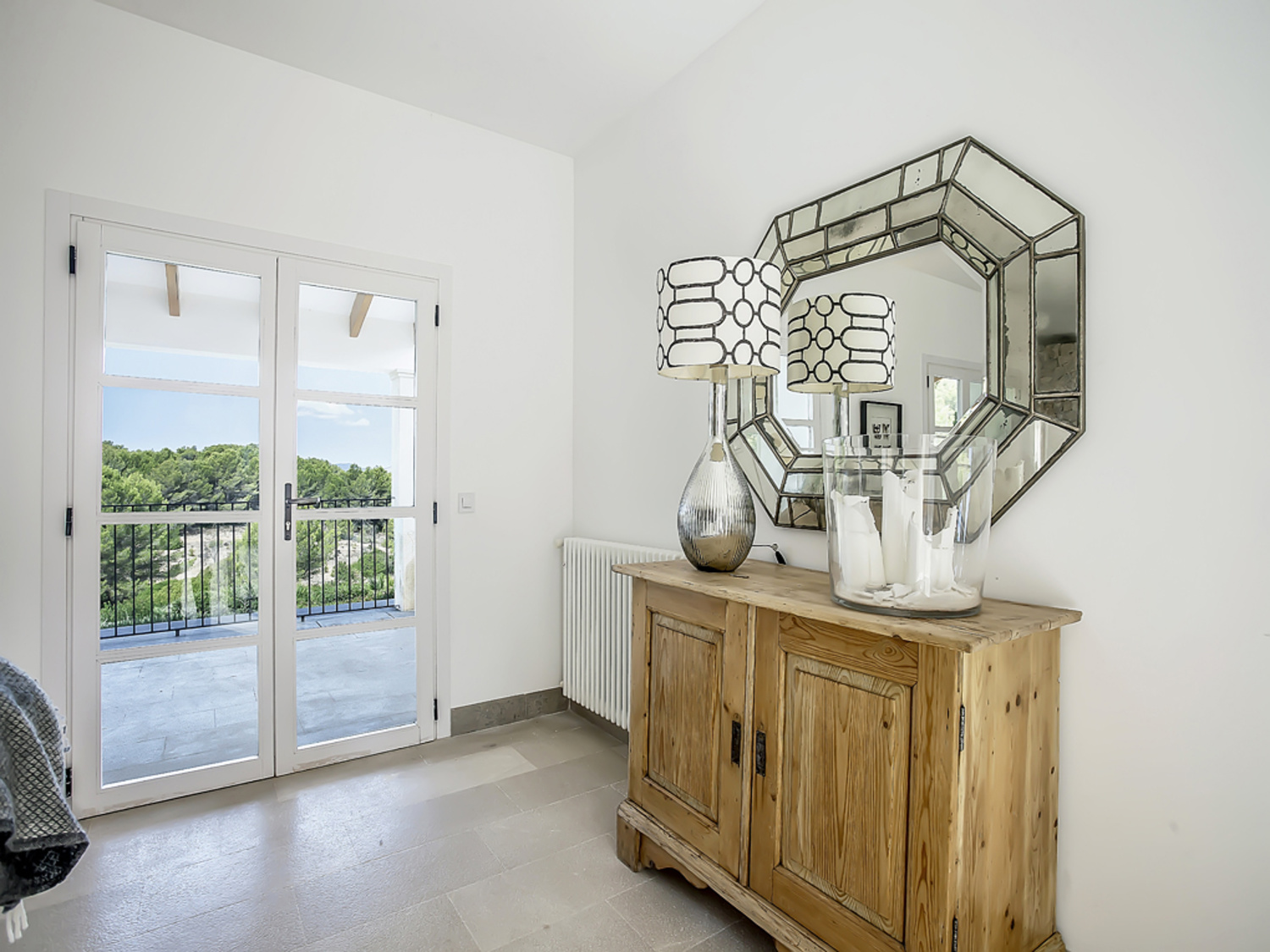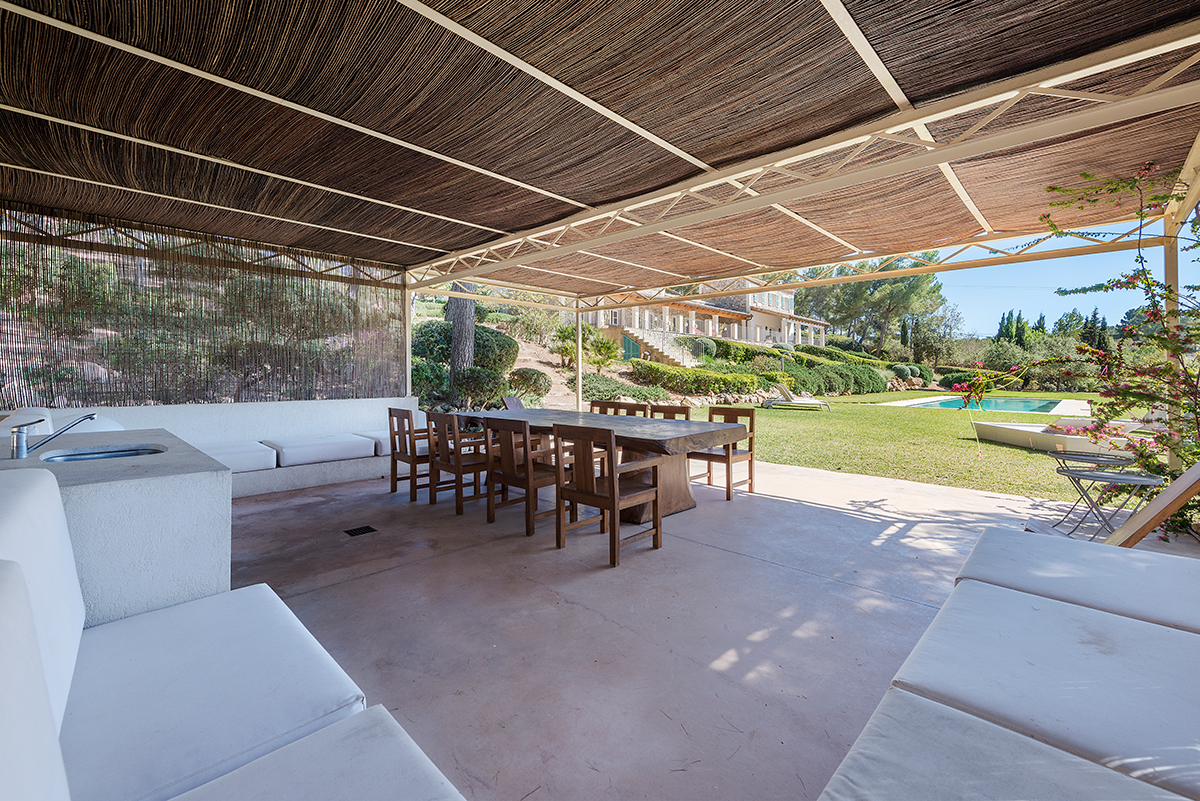 In the main house you can find the inviting living area with a fireplace and an ultra-modern, open kitchen with dining room. In the south and east wings there are 4 bedrooms and 3 bathrooms as well as an additional guest apartment. Son Massot has large glass doors on both outer sides of the main house which makes the property extremely light-flooded and provides you with fantastic views to the outside area. Particularly noteworthy is the meticulous interior design which combines seamlessly with the natural elements.
