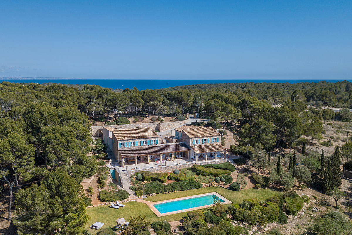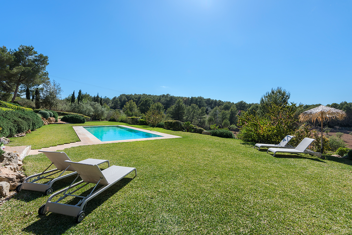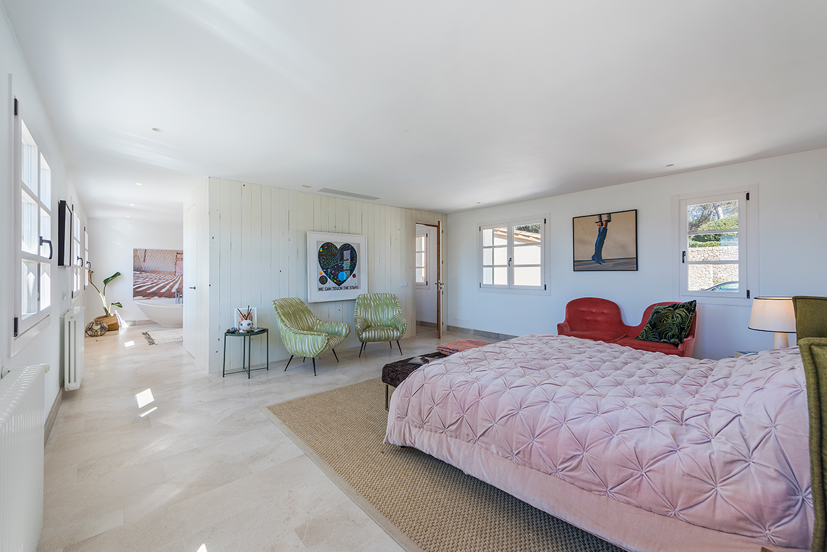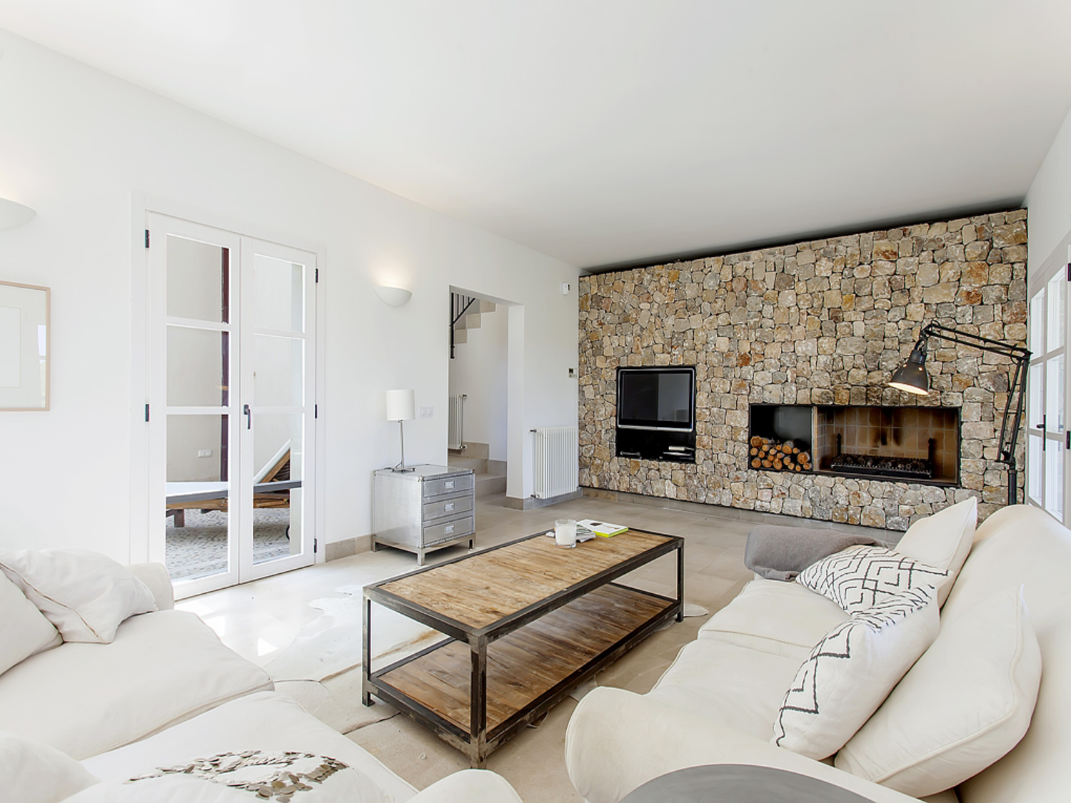 In the main house you can find the inviting living area with a fireplace and an ultra-modern, open kitchen with dining room. In the south and east wings there are 4 bedrooms and 3 bathrooms as well as an additional guest apartment. Son Massot has large glass doors on both outer sides of the main house which makes the property extremely light-flooded and provides you with fantastic views to the outside area. Particularly noteworthy is the meticulous interior design which combines seamlessly with the natural elements.
