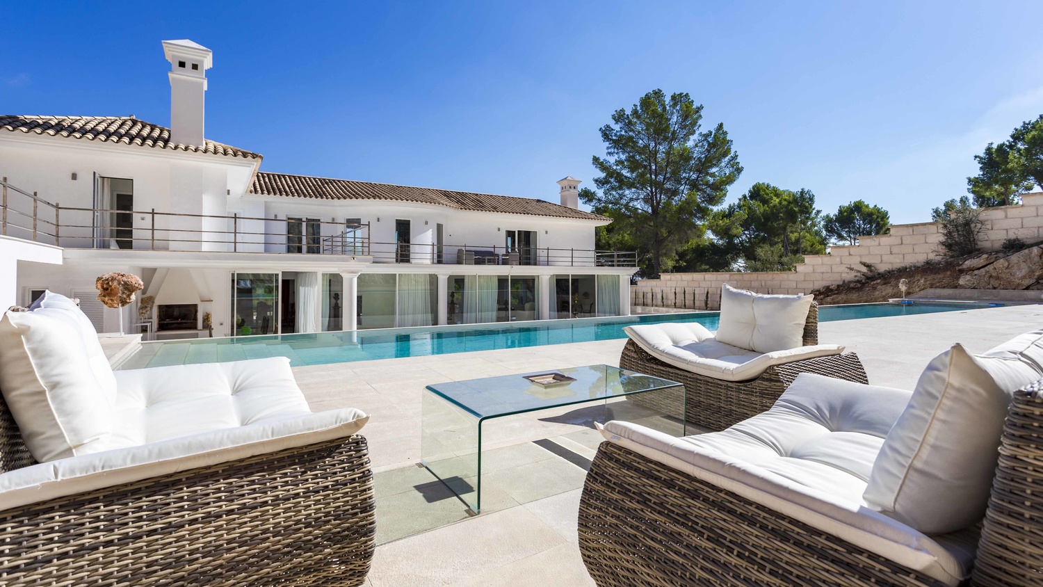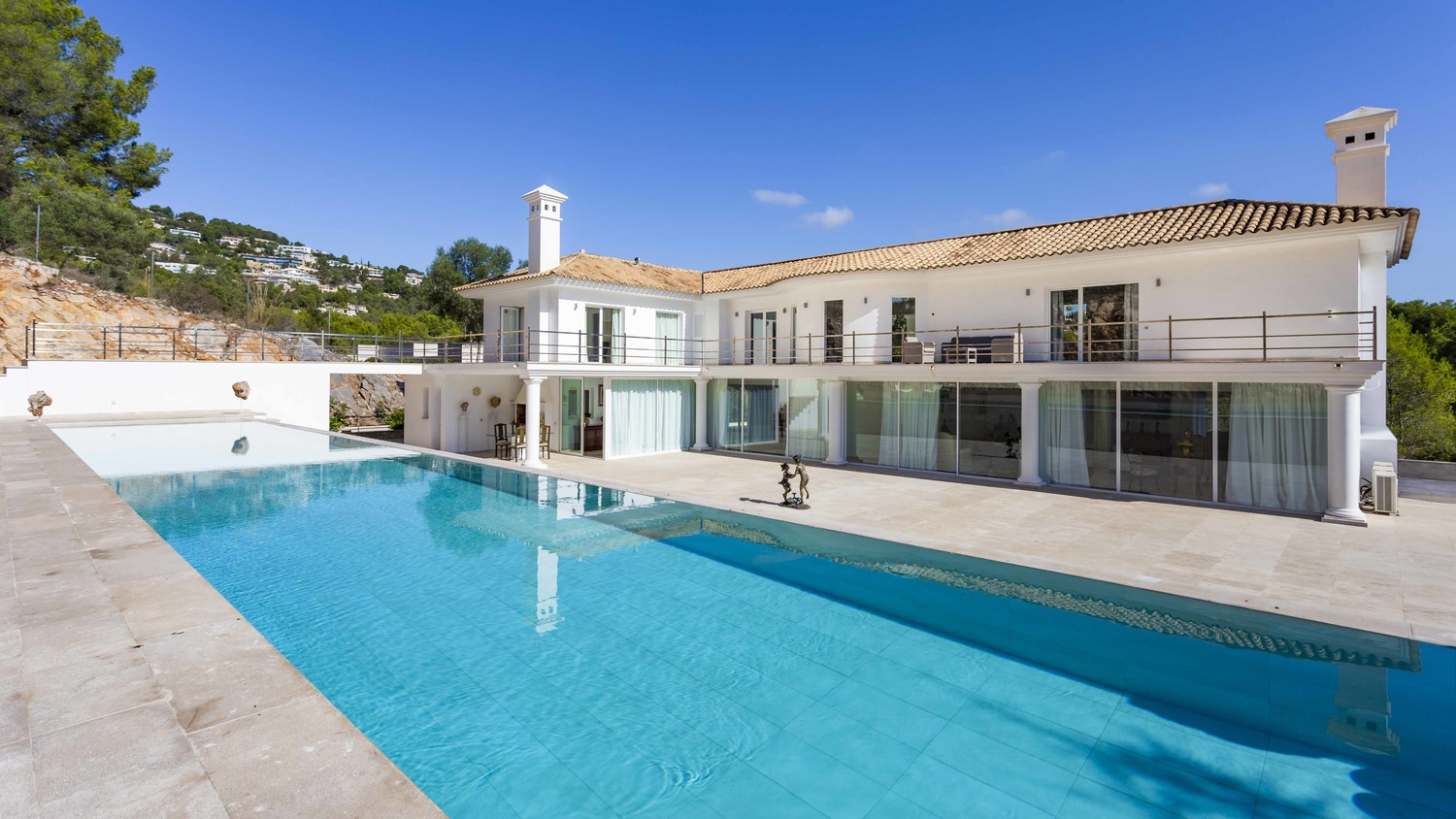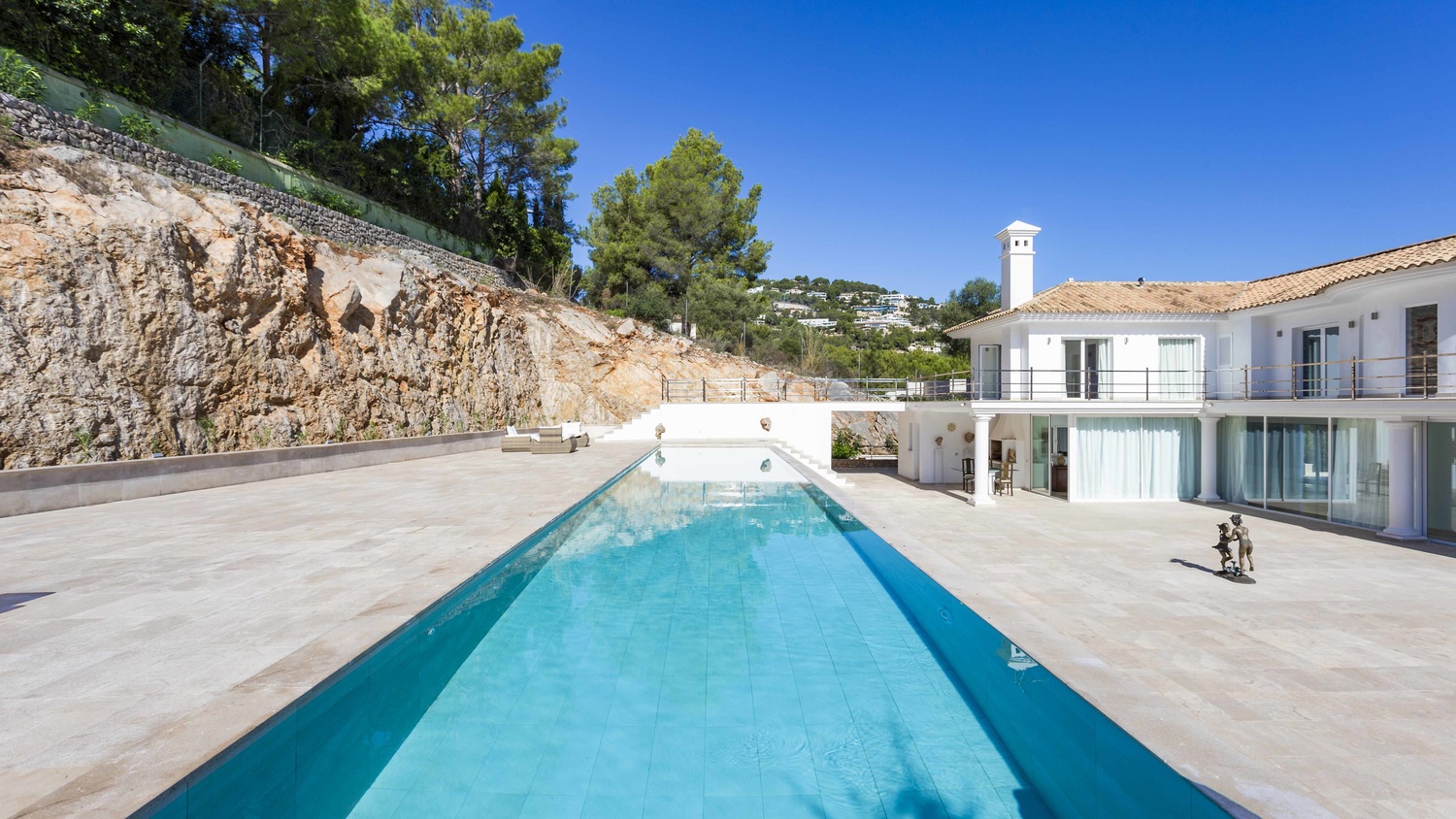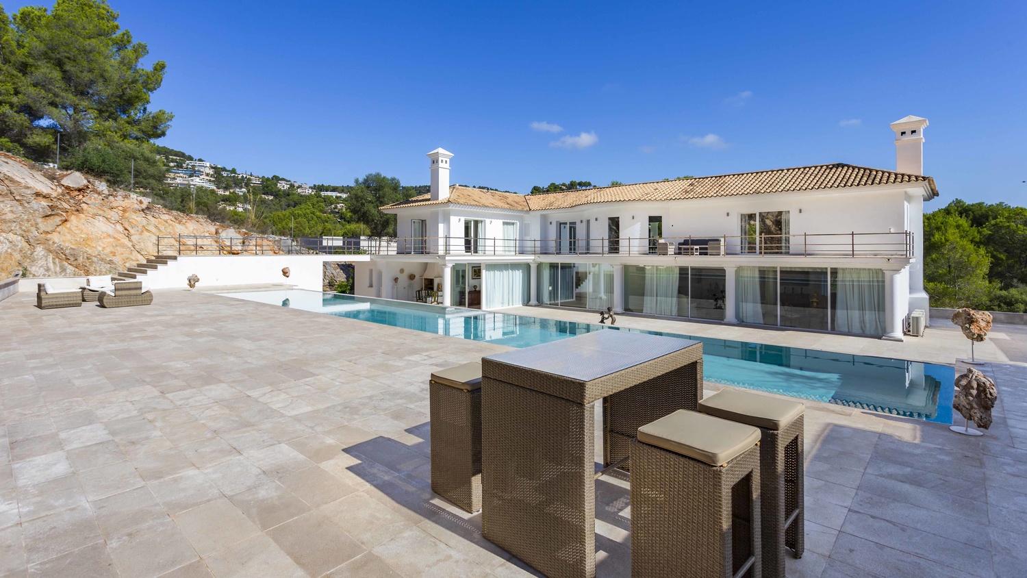 Outside the property at the rear is a large, paved area. This sizeable terrace enjoys sunshine all day and above it is a raised tier with 25 metre length pool. This plateau connects to a large terrace which stretches the length of the first floor.