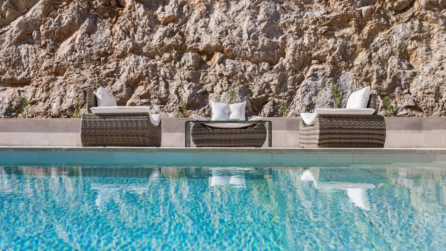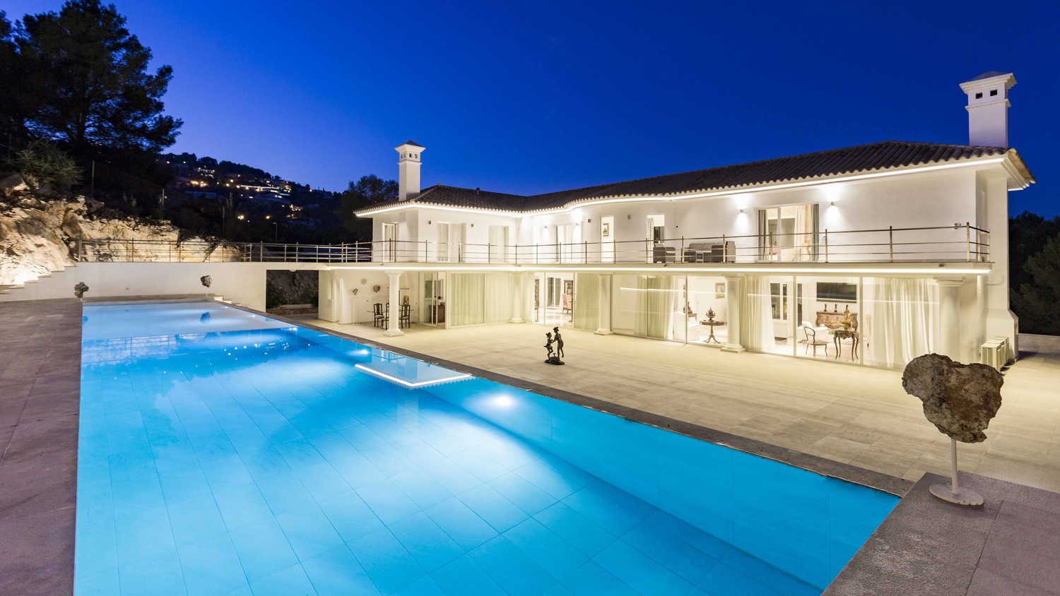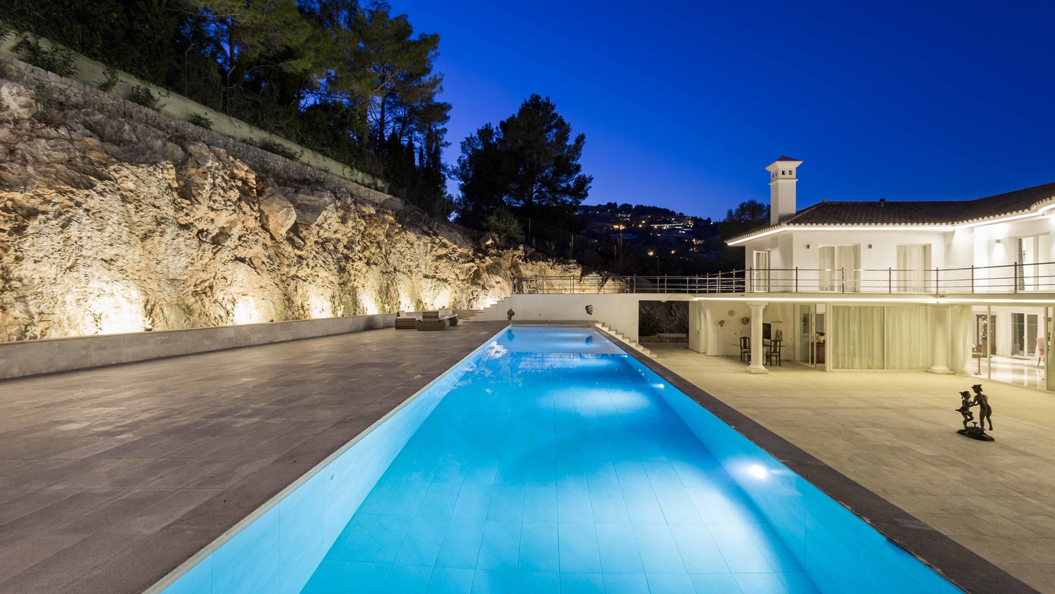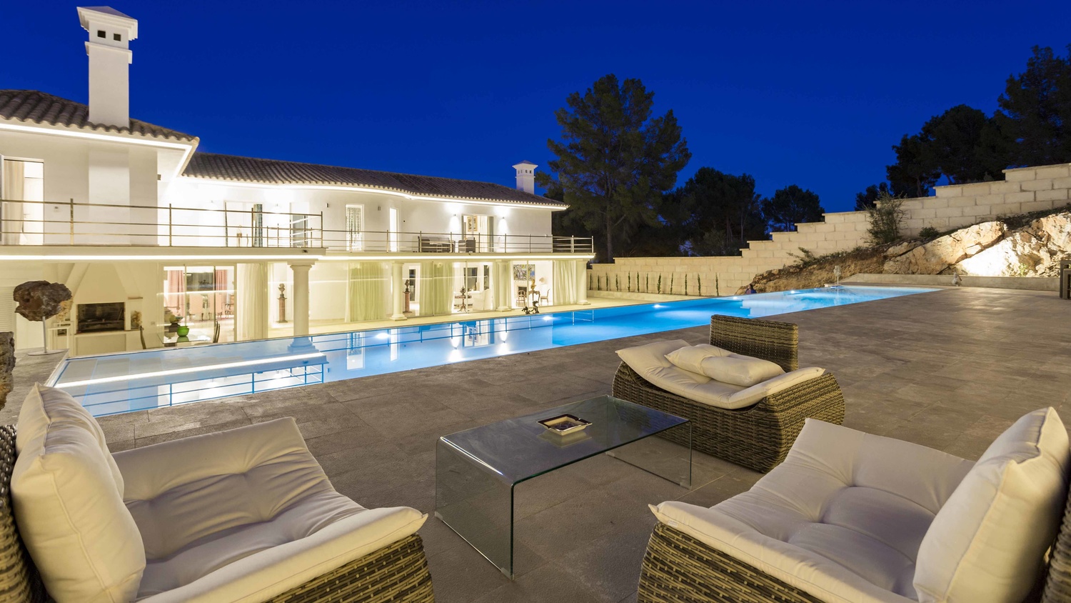Outside the property at the rear is a large, paved area. This sizeable terrace enjoys sunshine all day and above it is a raised tier with 25 metre length pool. This plateau connects to a large terrace which stretches the length of the first floor.