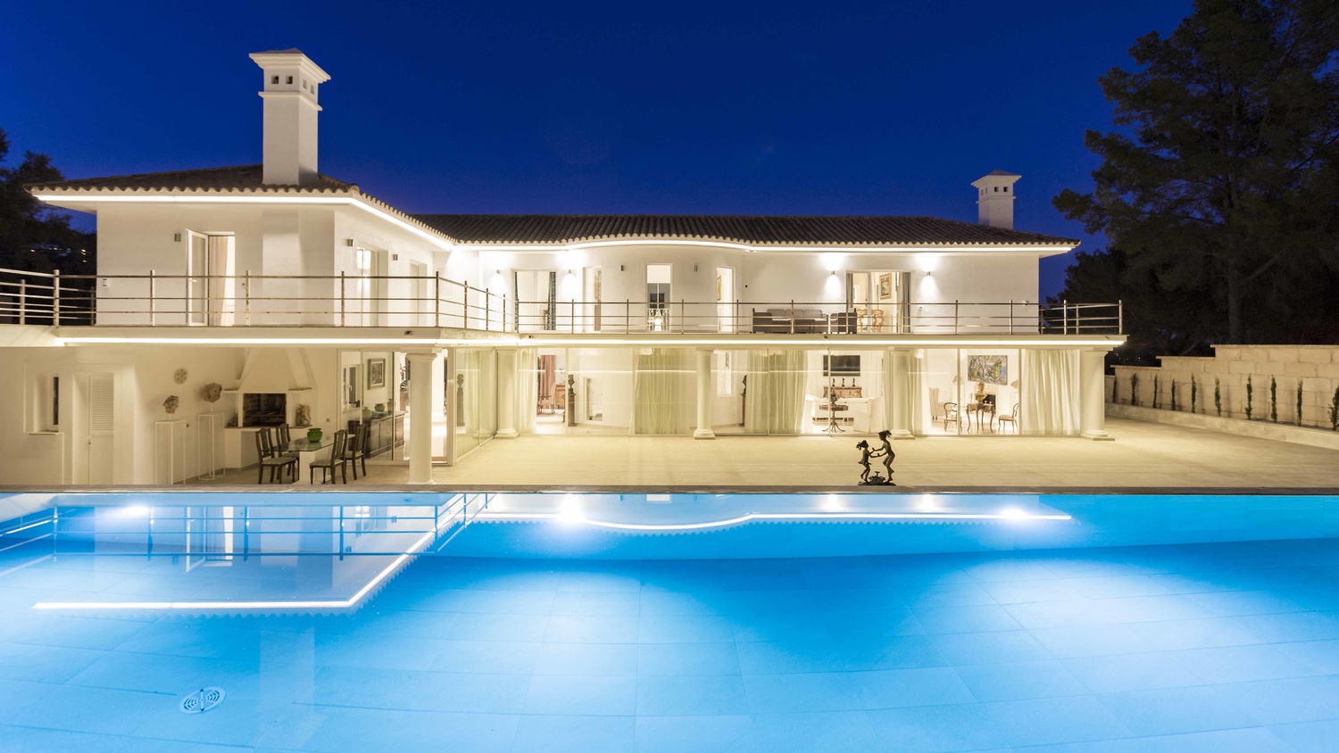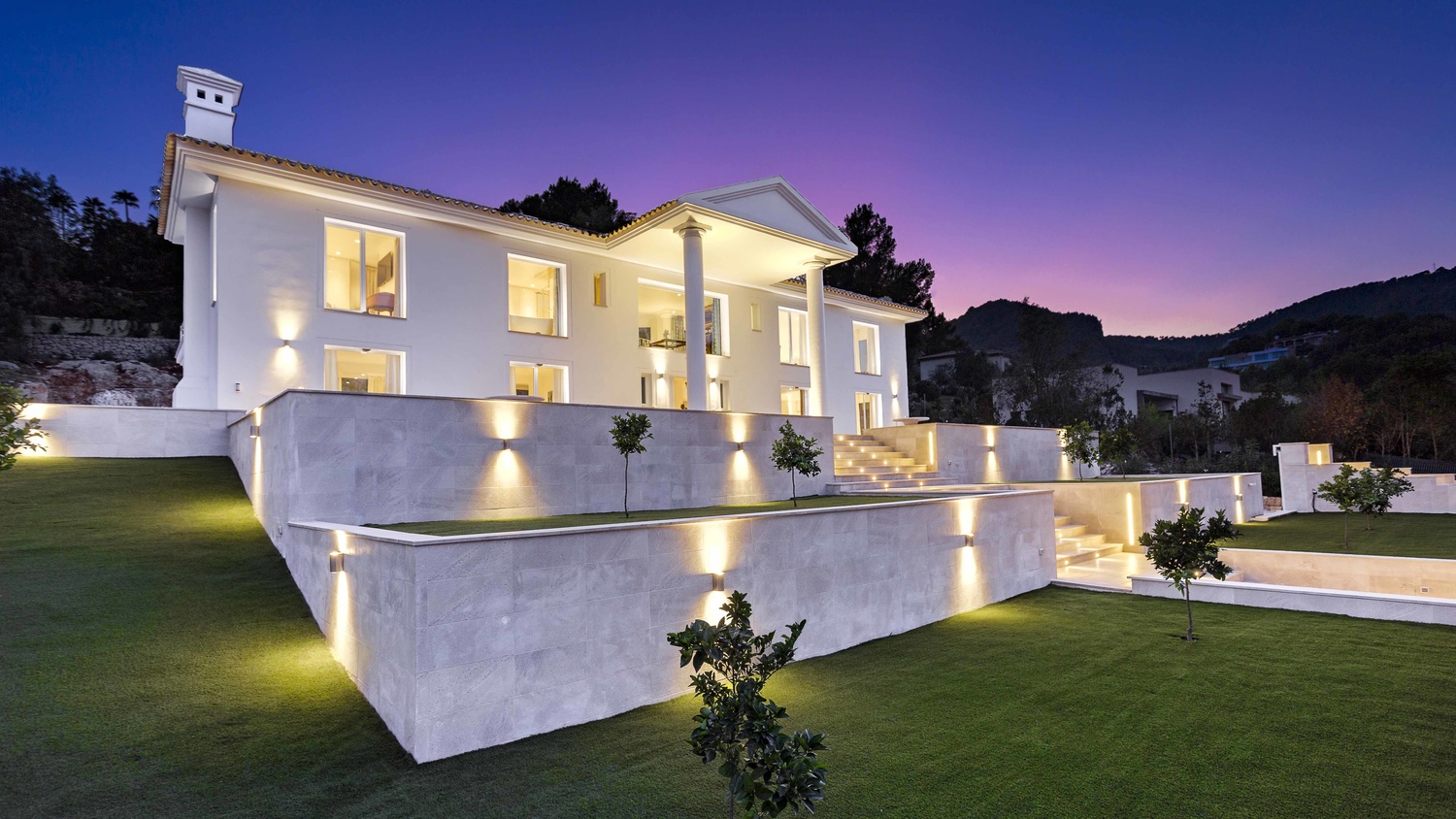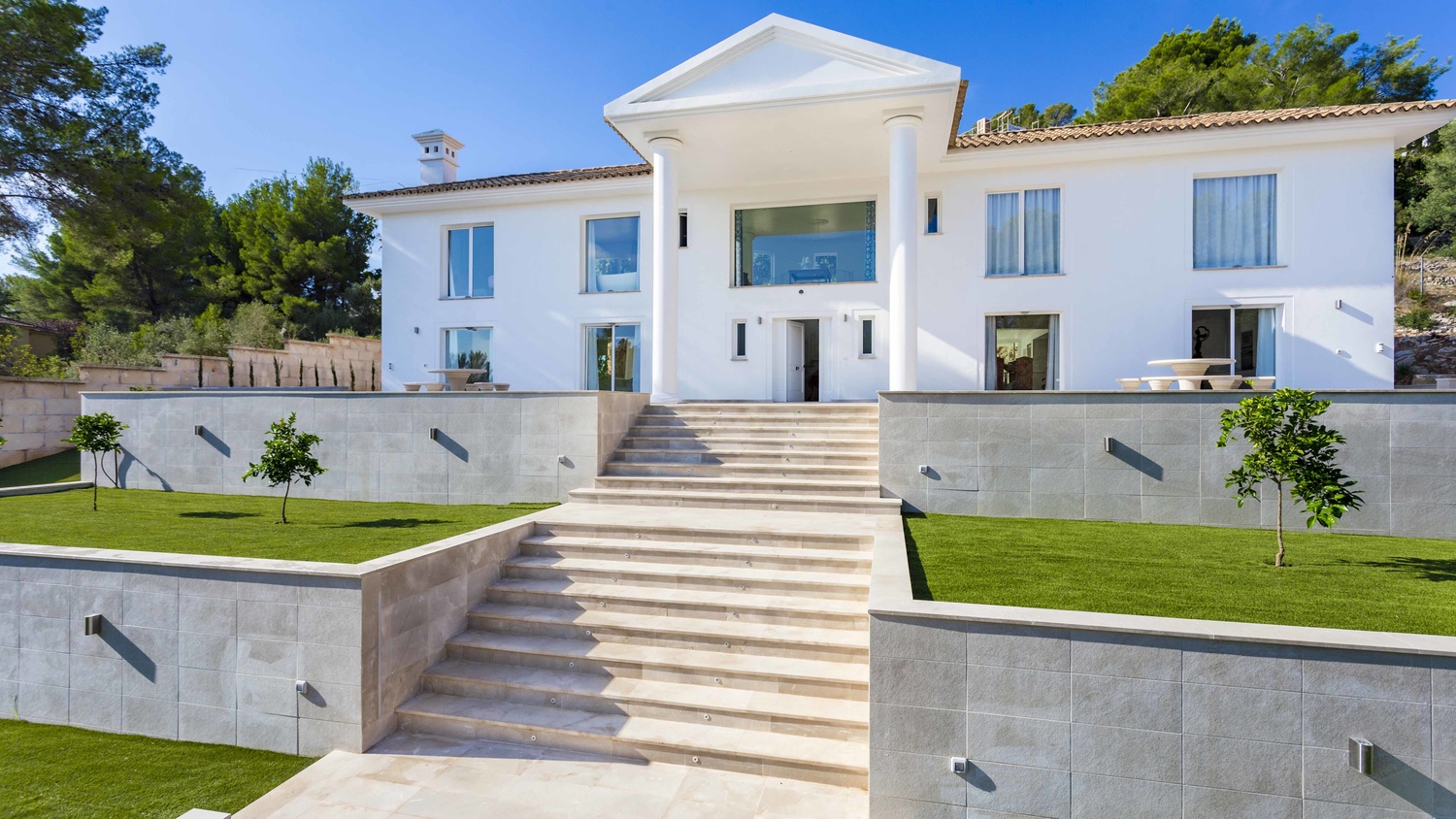 This characterful villa sits on a 2,100 sqm plot and provides a net living area of 630 sqm distributed over 2 floors. There is a 2-car garage below and a tiered garden at the front of the property which draws the eye towards its striking columns.