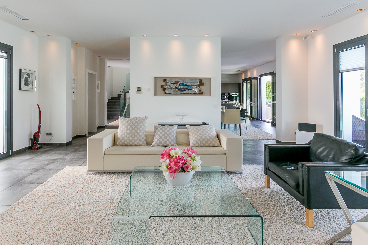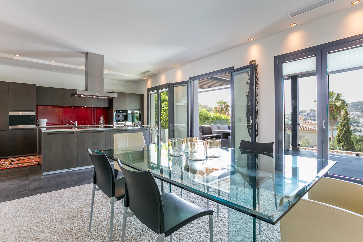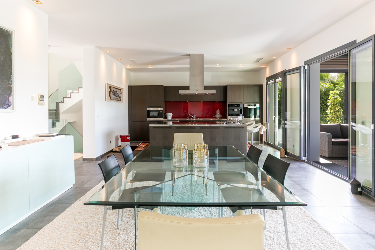 The whole property is equipped with underfloor heating and air condition. All around the house there are open as well as covered terrace, a BBQ area and a splendid pool with sea view.