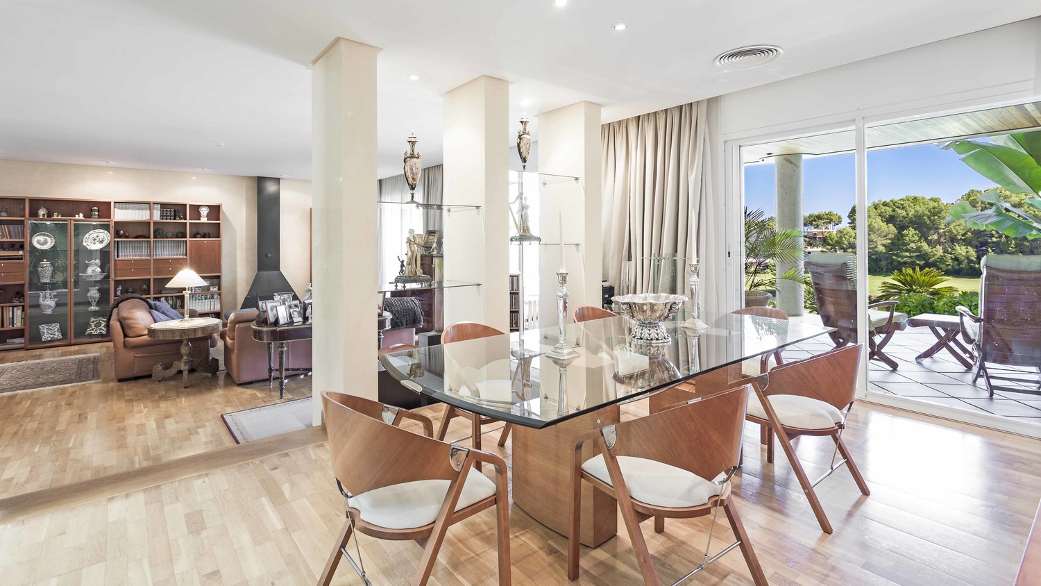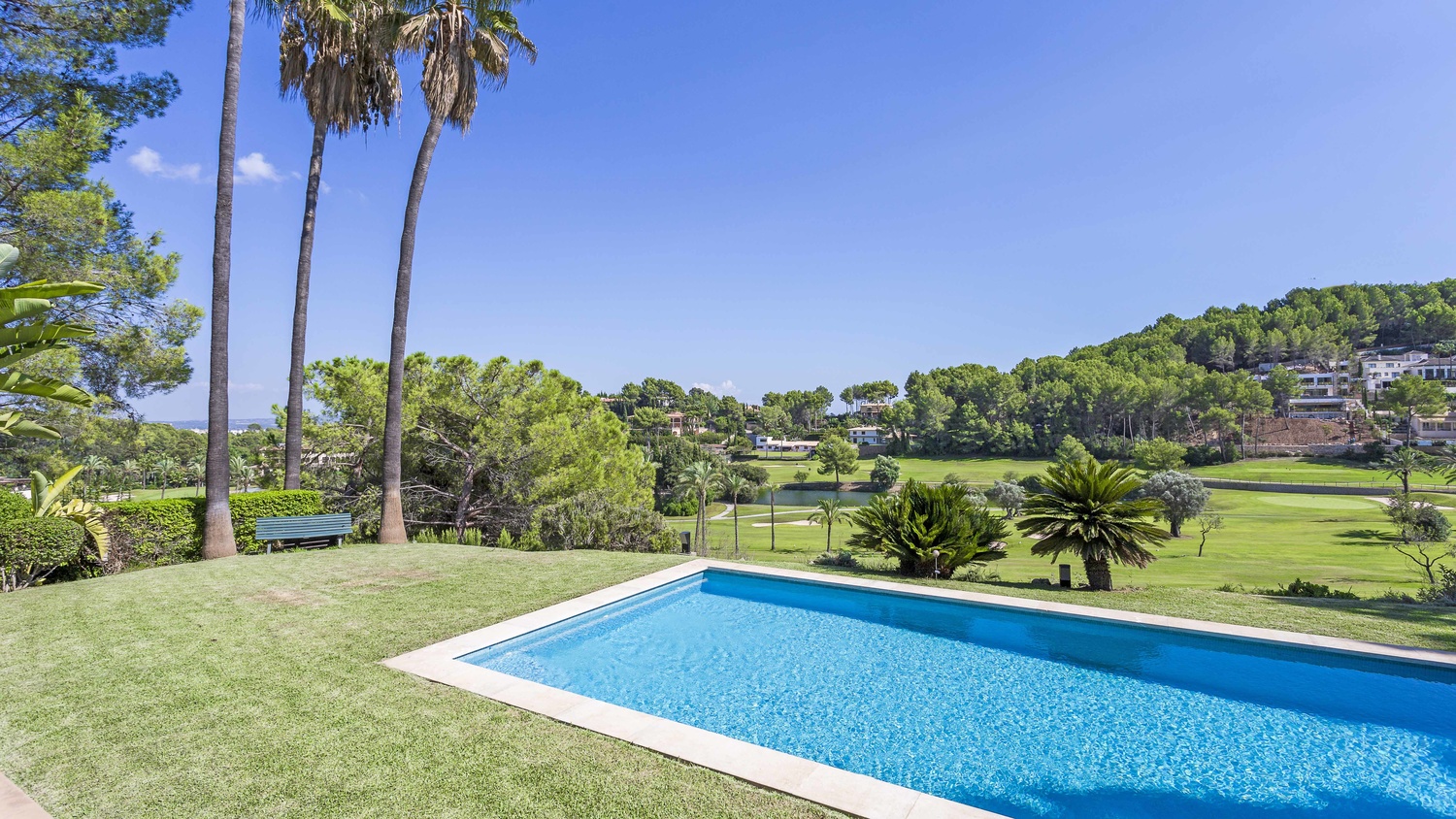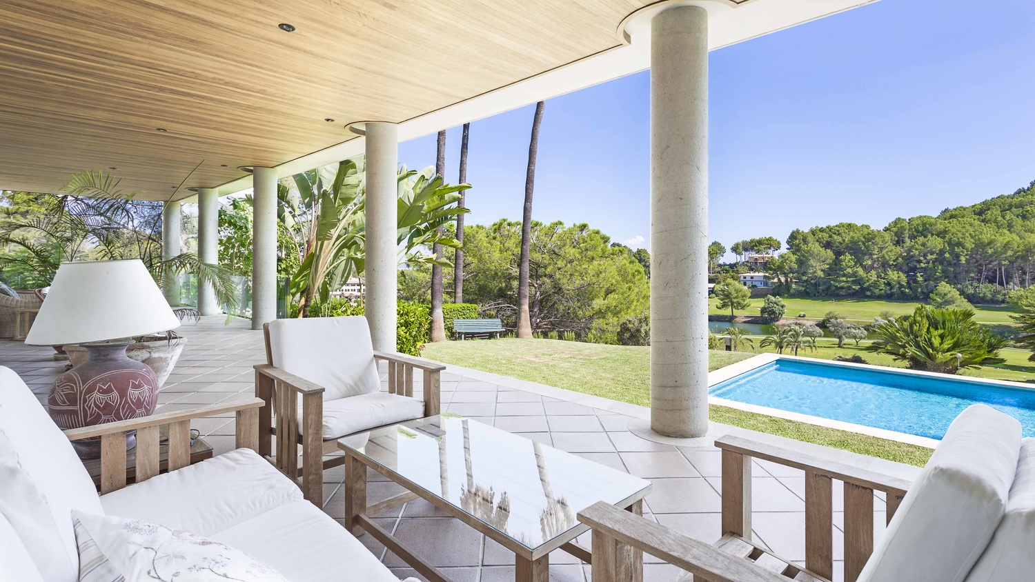 A large covered terrace leads into a beautiful garden with swimming pool and spectacular view over the golf course.
