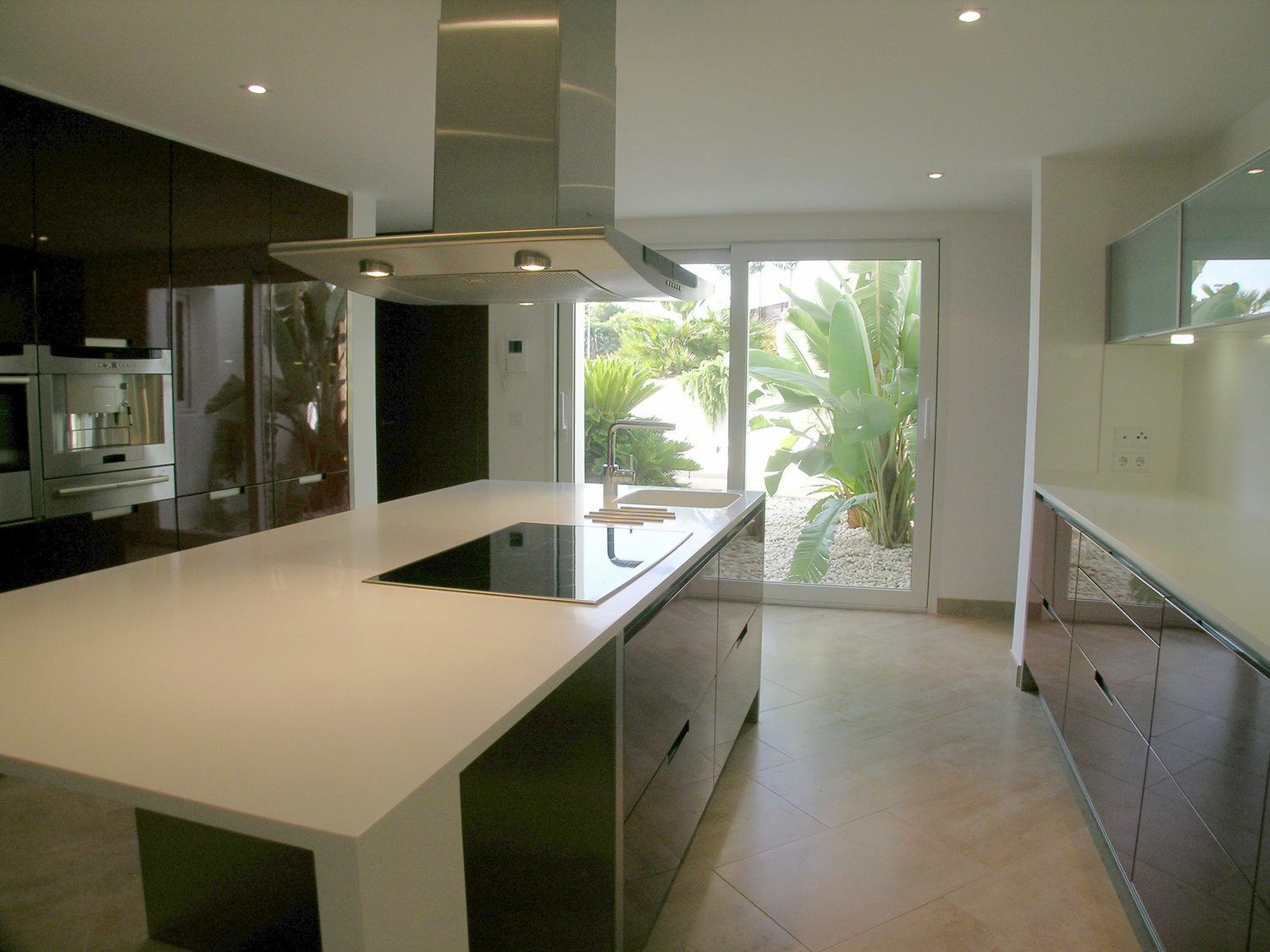 Ground floor: attractive entrance, big light-flooded living room with fireplace and large windows with view to the pretty garden and the sea, modern deluxe kitchen, 3 bedrooms with bathroom en suite, guest WC, staff quarters and utility room.