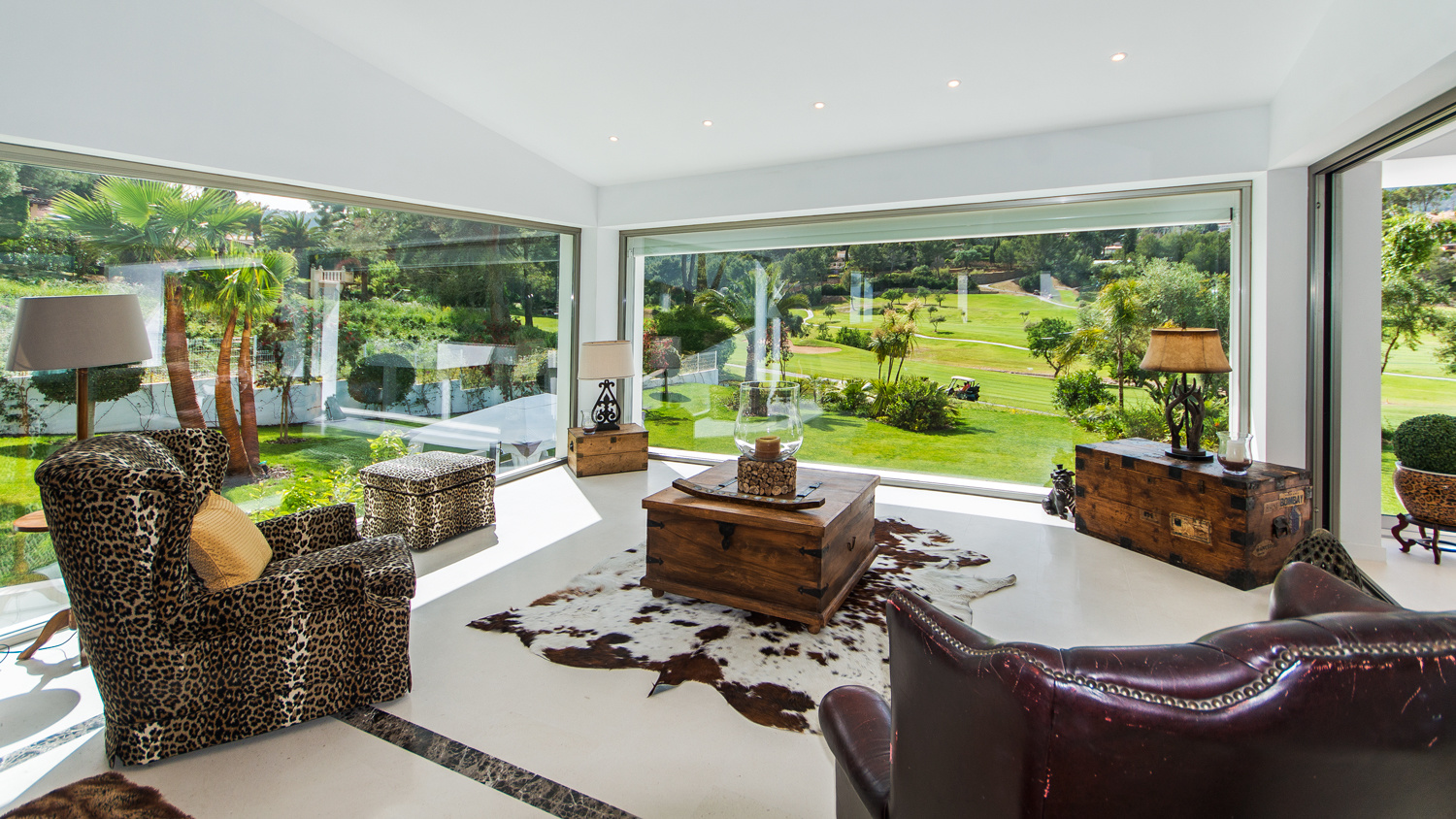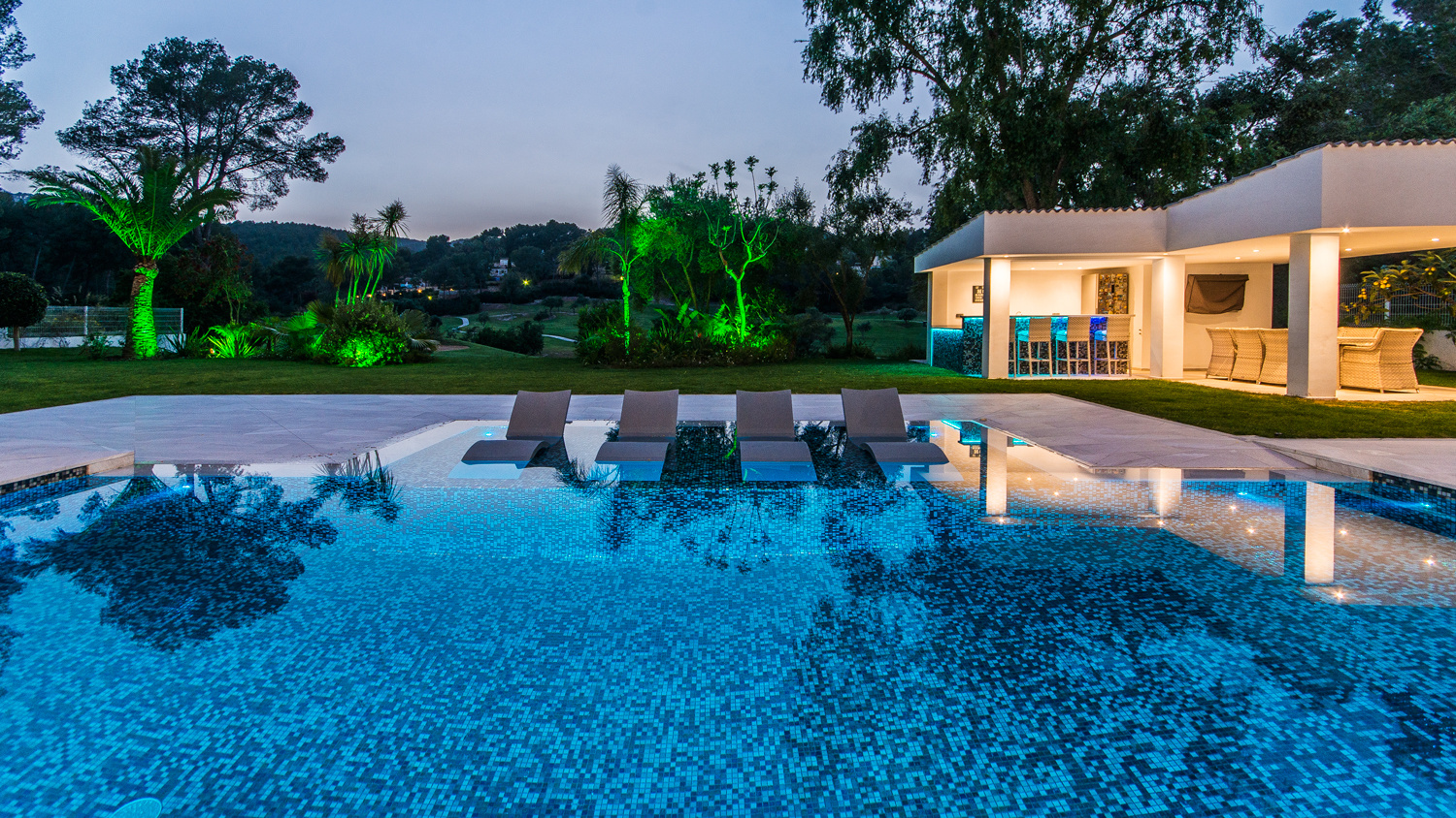 The property sits in a unique position front line to the golf course, and due to the flat plot on which it sits gives the feeling that the garden flows straight on to the golf course itself. The heated pool has built in sun loungers with an integrated Jacuzzi area. There is also a fully equipped bar area with a covered exterior dining area.