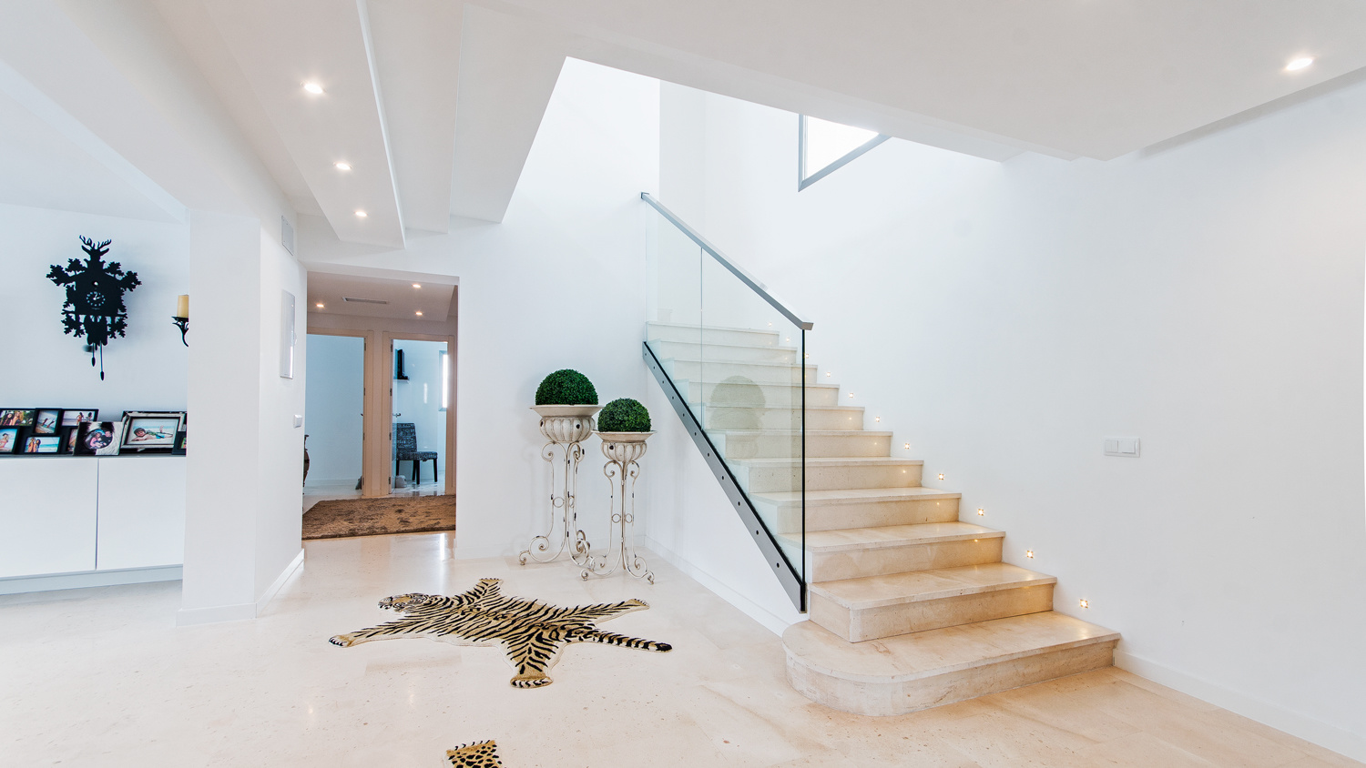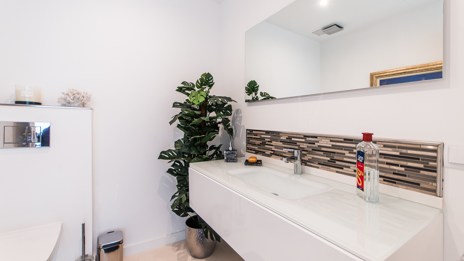 Upon entering the property on the first floor, there is a spacious entrance hall with plenty of hidden storage, and a picture window which offers views over the Son Vida Golf course. Continuing through the hall there is a spacious open planned fully equipped kitchen with integrated breakfast bar, the living and dining area, covered chill-out area and an independent staff or guest apartment, with bedroom, and bathroom en suite.