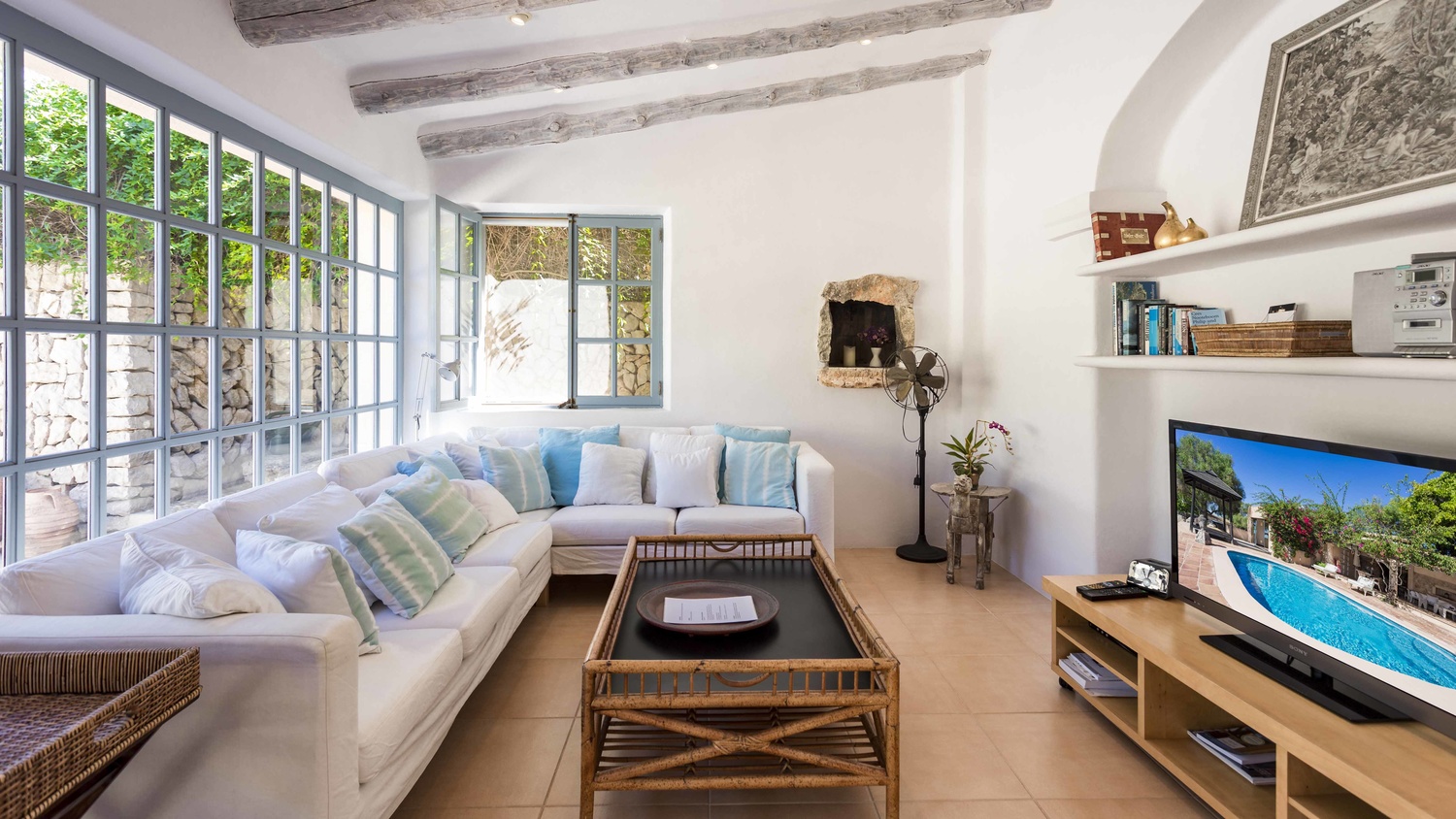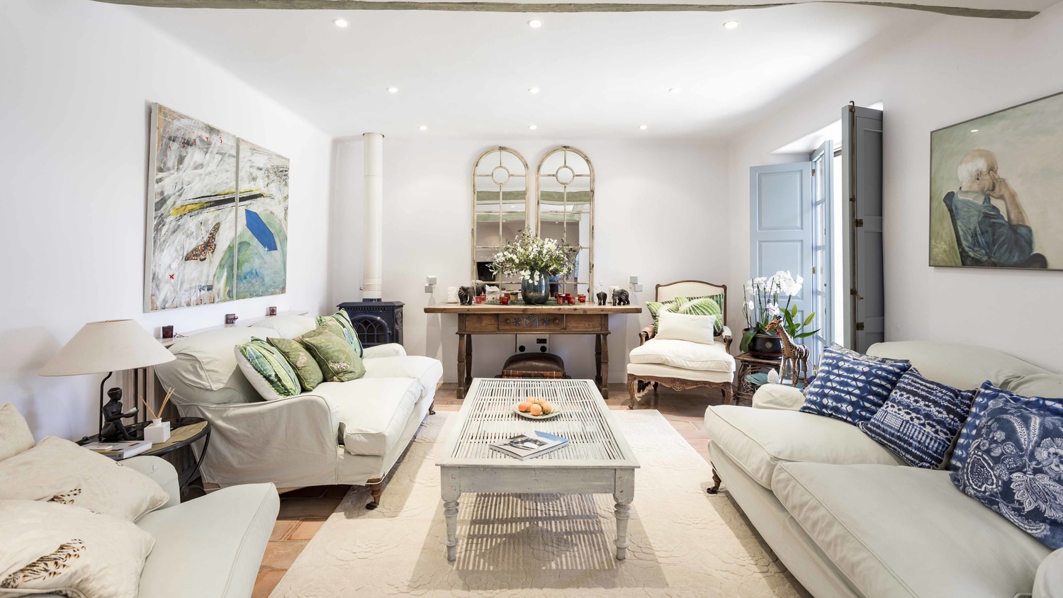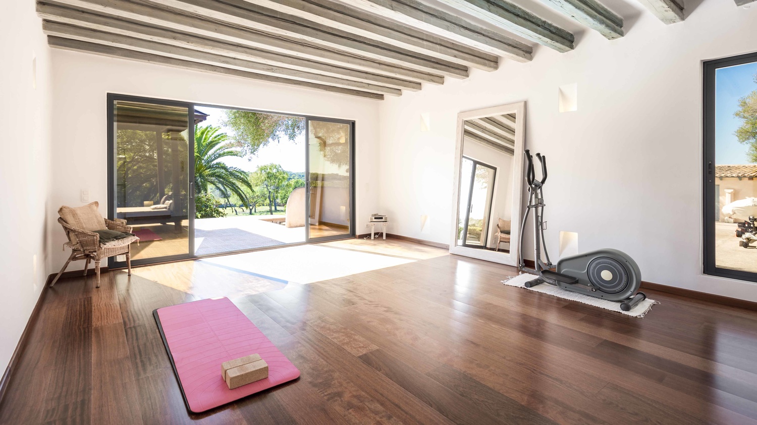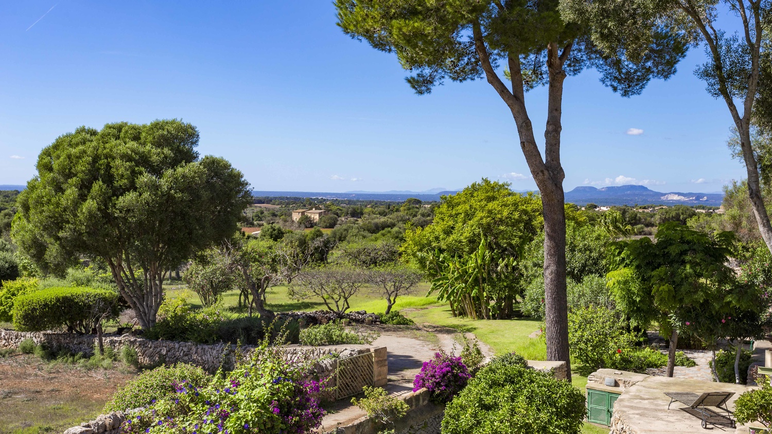 You can find a second pool at the other end of the garden area, with a barbecue and summer dining area. There is also a multiple room that is currently used as a Yoga room with shower and bath. In the lower area, there is a garage for two cars, external parking for several cars, a herb garden and a beautiful space that is not yet landscaped. There are picturesque views towards the small rolling hills which surround the property. It is very sunny and quiet. Formerly there were several independent houses and the current owner has managed to transform them into a large property with many romantic nooks where you will always be able to enjoy the beautiful garden or interior patio. It has a license for short-term holiday rental.