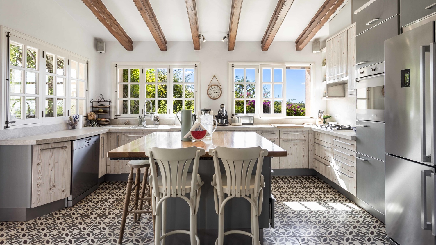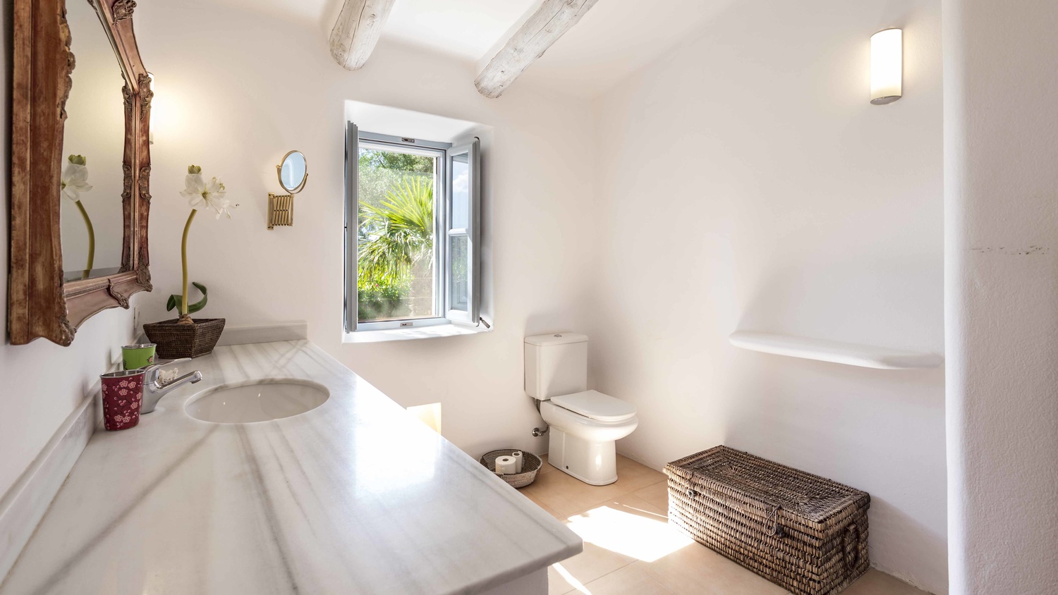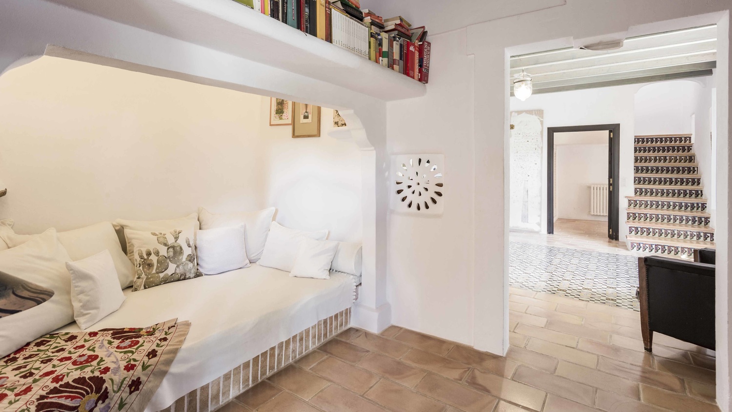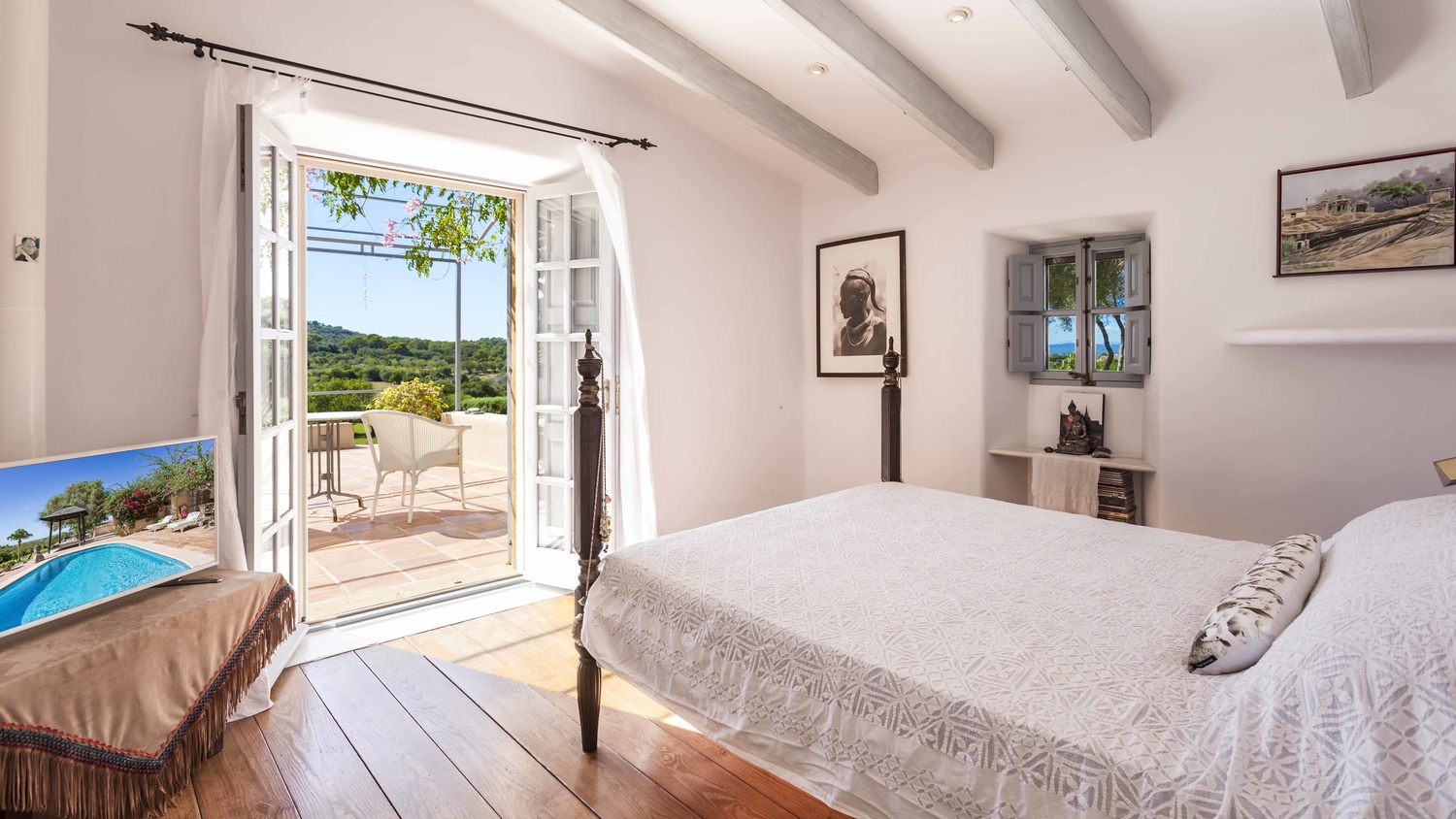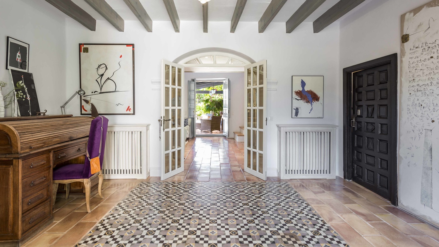 Main house: a large kitchen opens to the dining room, living room, TV room and a bedroom with en-suite bathroom on the main floor and on the ground floor is a master area, consisting of dressing room, large bathroom, bedroom and large private terrace. On the other side, guest room with en-suite bathroom with direct access to the inner courtyard. As an independent annex on the ground floor there are three offices and one of them - the one with the parquet floor - is used as a seventh bedroom.