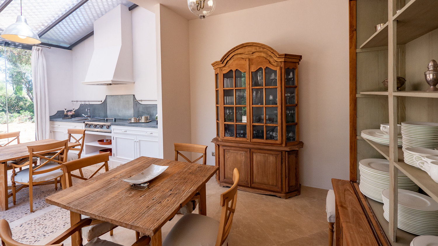 The elegant living area in the main house is distributed over two floors and on the ground floor offers an ample lounge with open fireplace, a dining area and a cosy living room. The light-flooded and remarkable kitchen is framed by large and easy to open panorama windows.