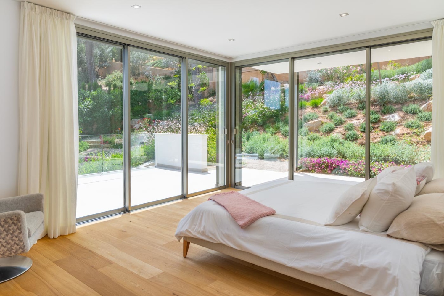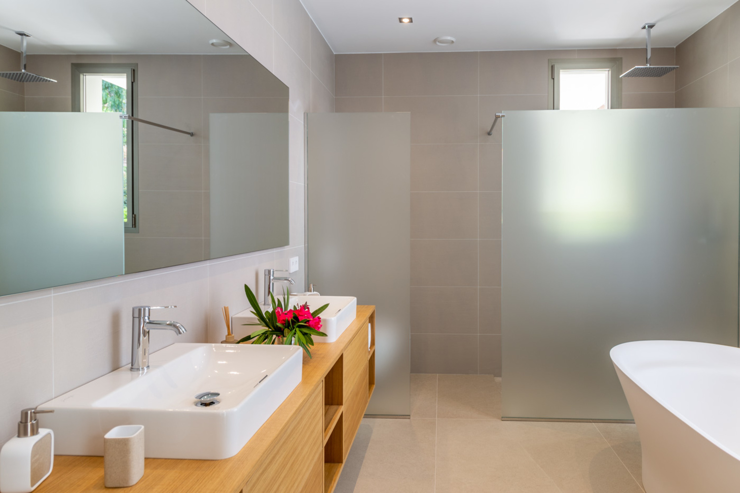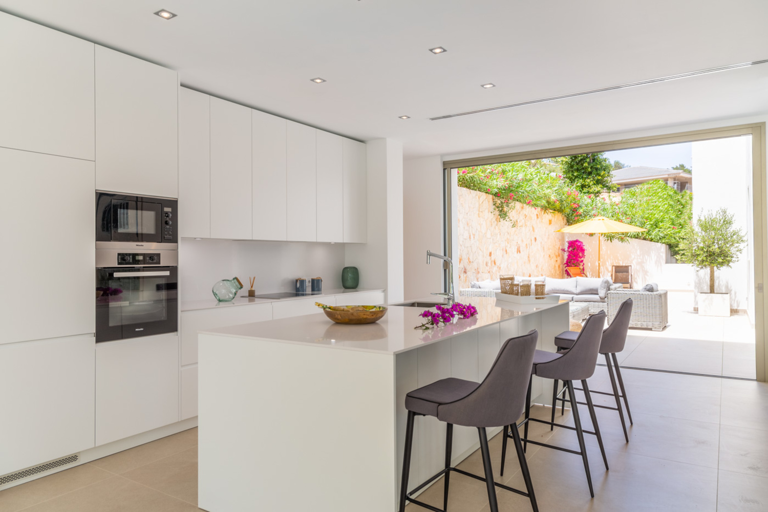 On the ground floor you find the impressively spacious living area with an open luxury kitchen and 2 bedrooms with bathroom en-suite.