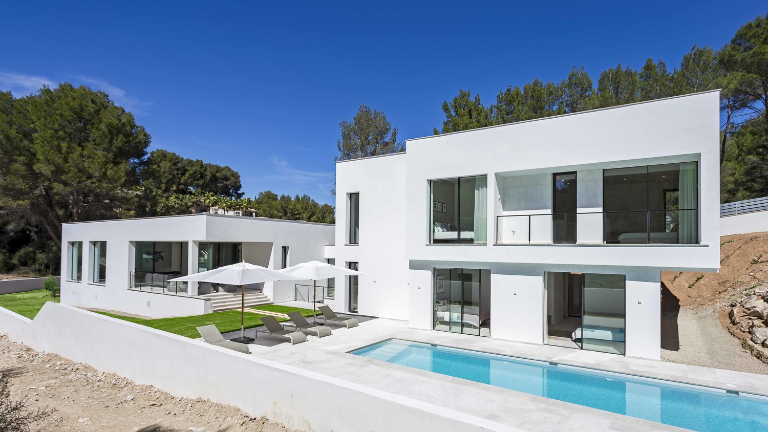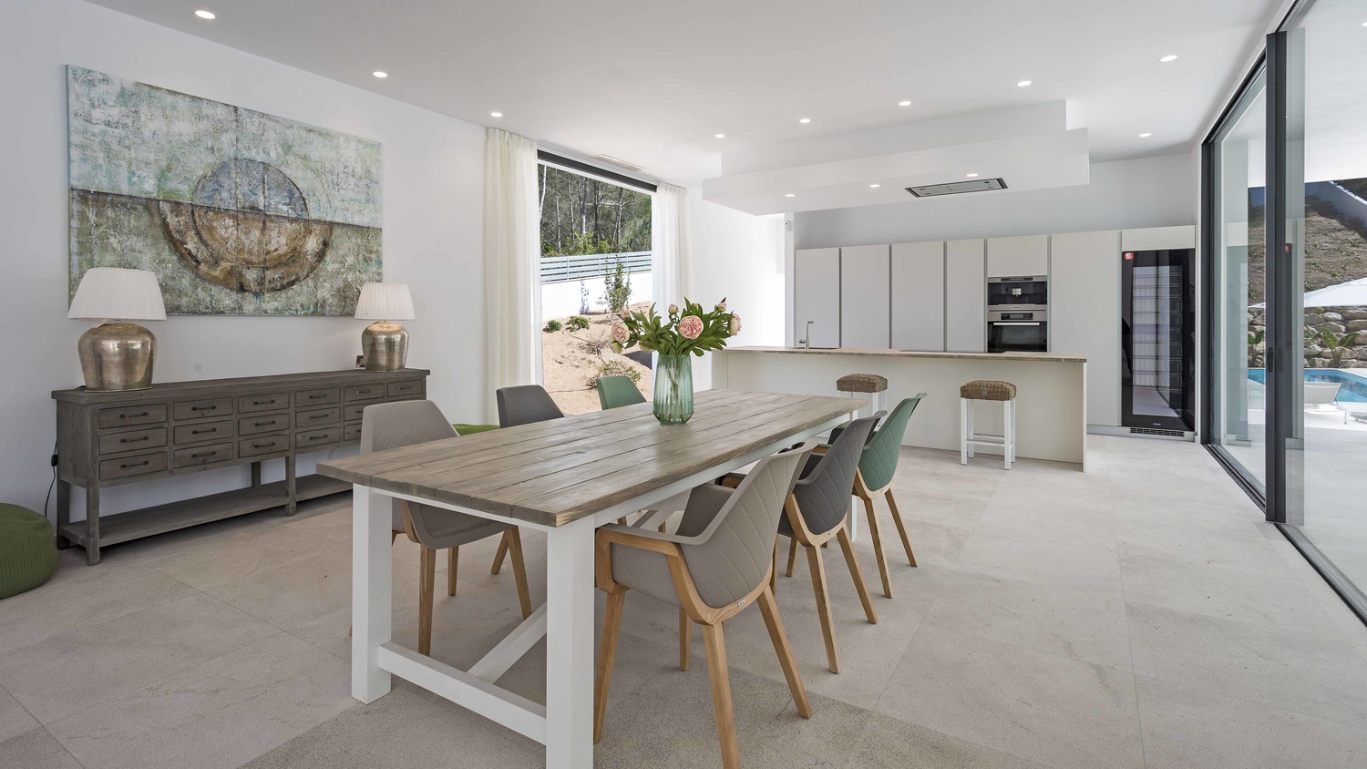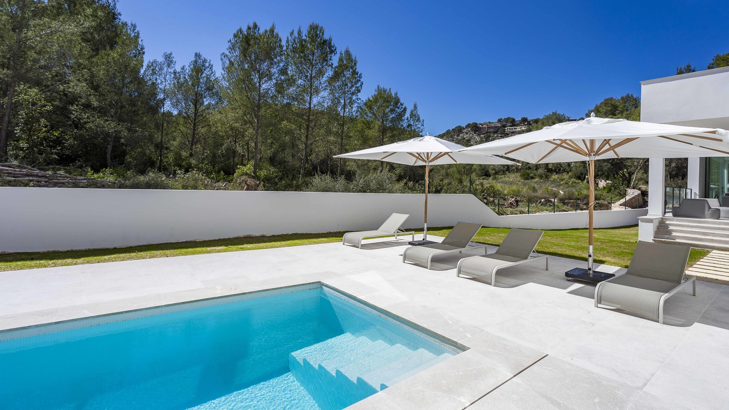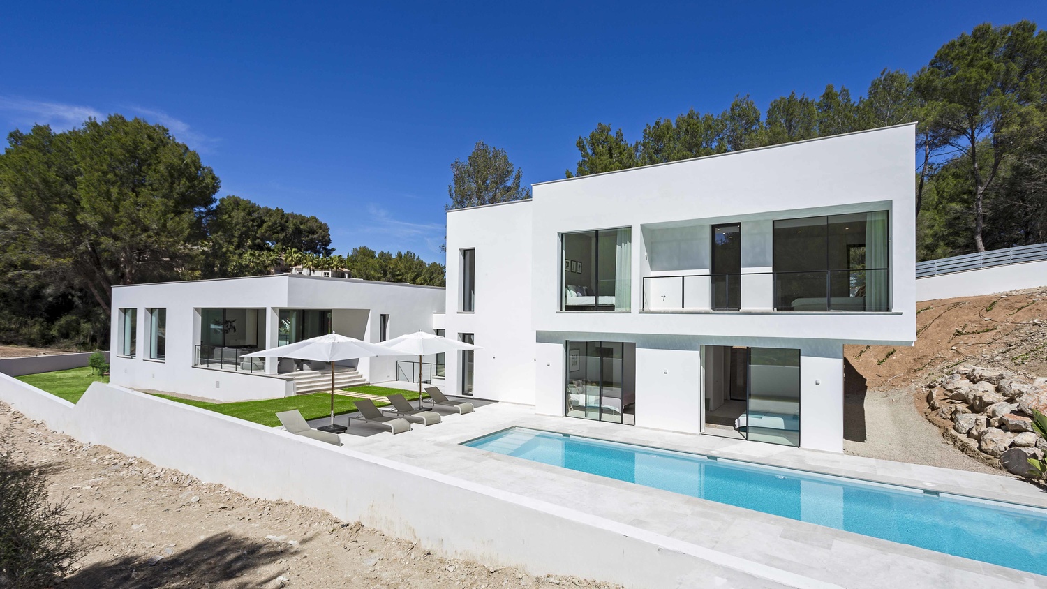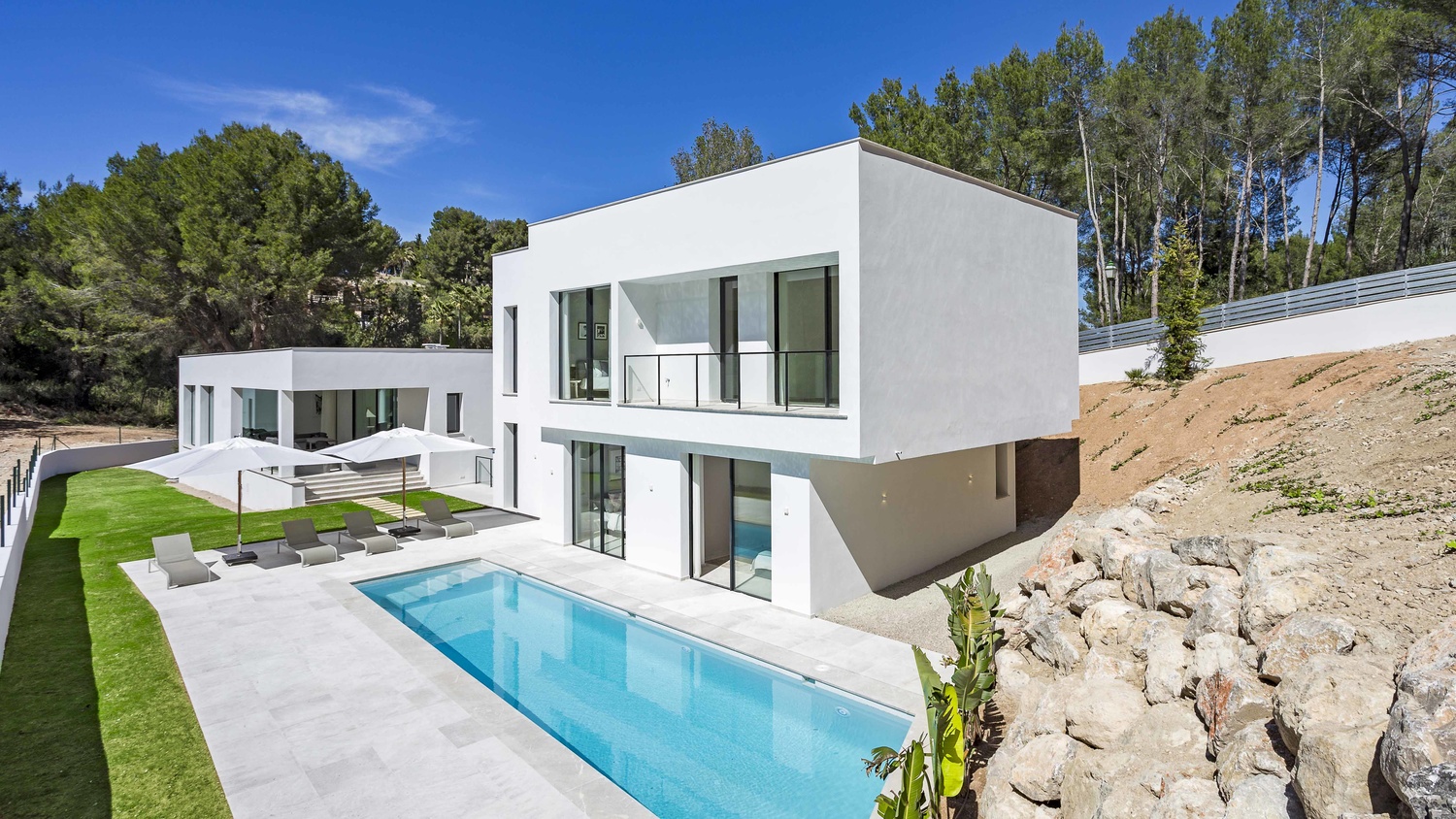 This recently finished villa is bedded in a well-kept Mediterranean garden with a large outdoor heated pool and several covered and uncovered chill and dining terraces.