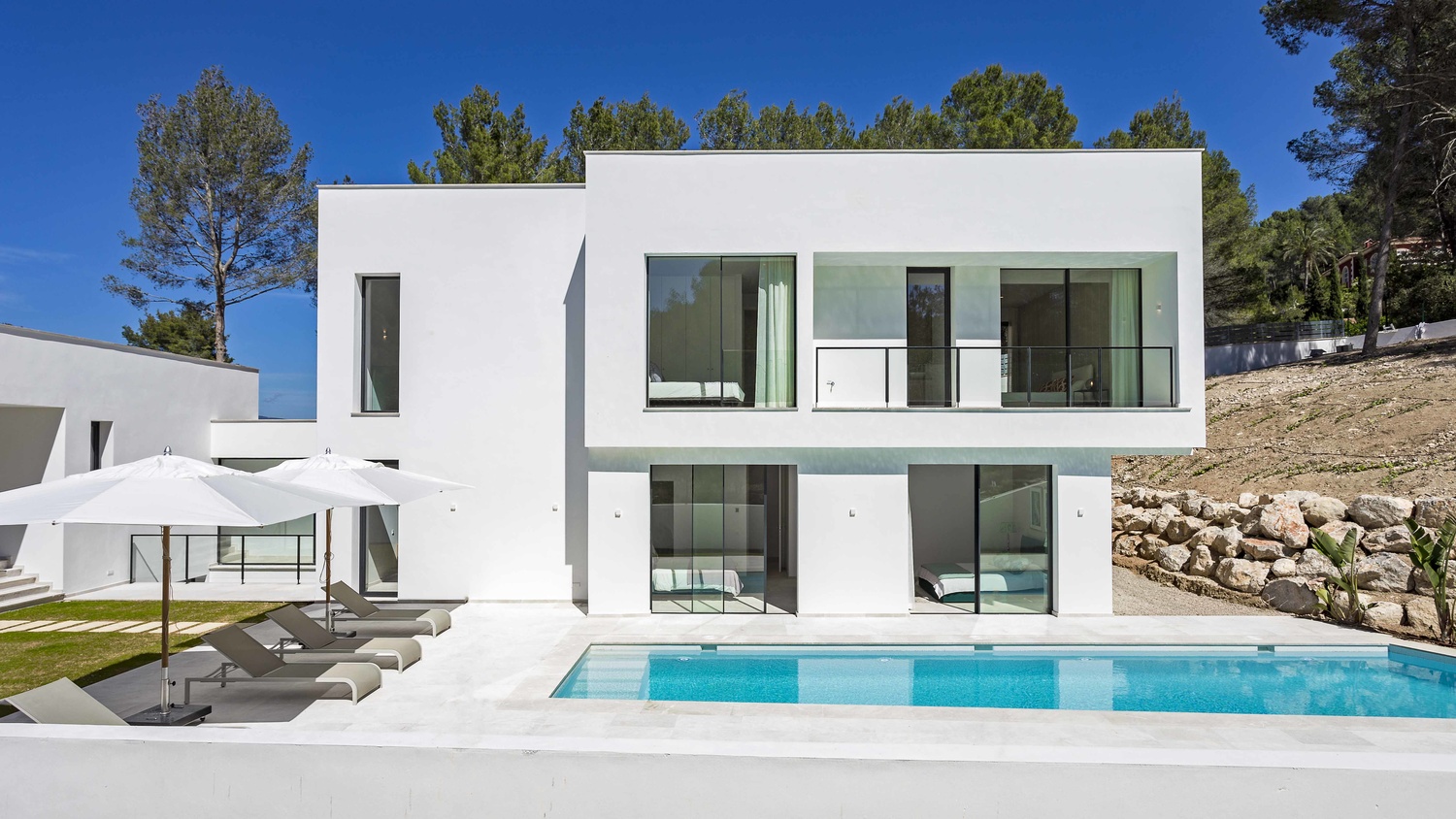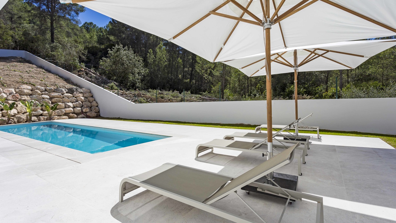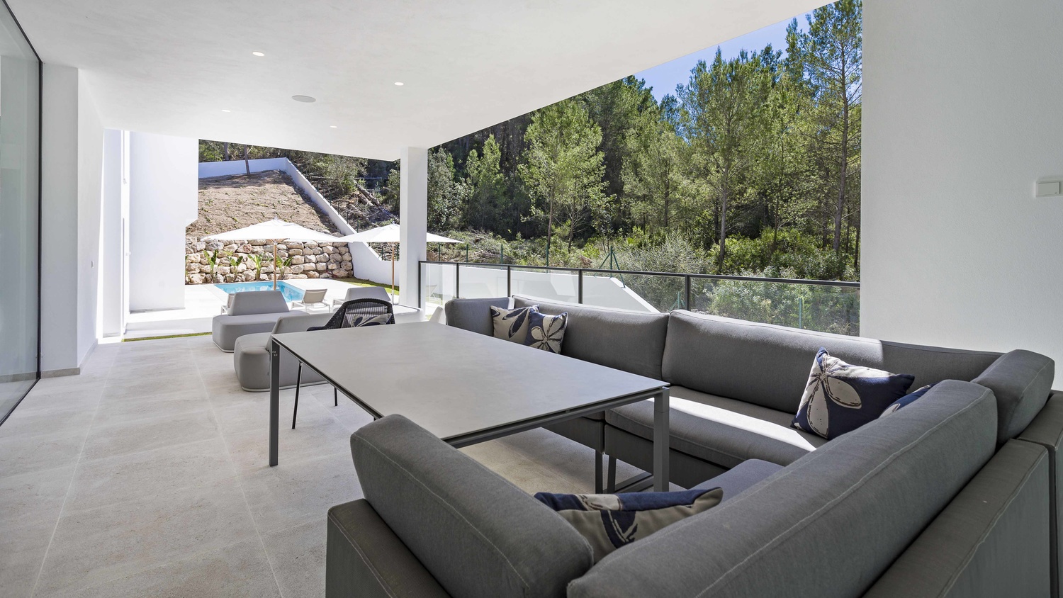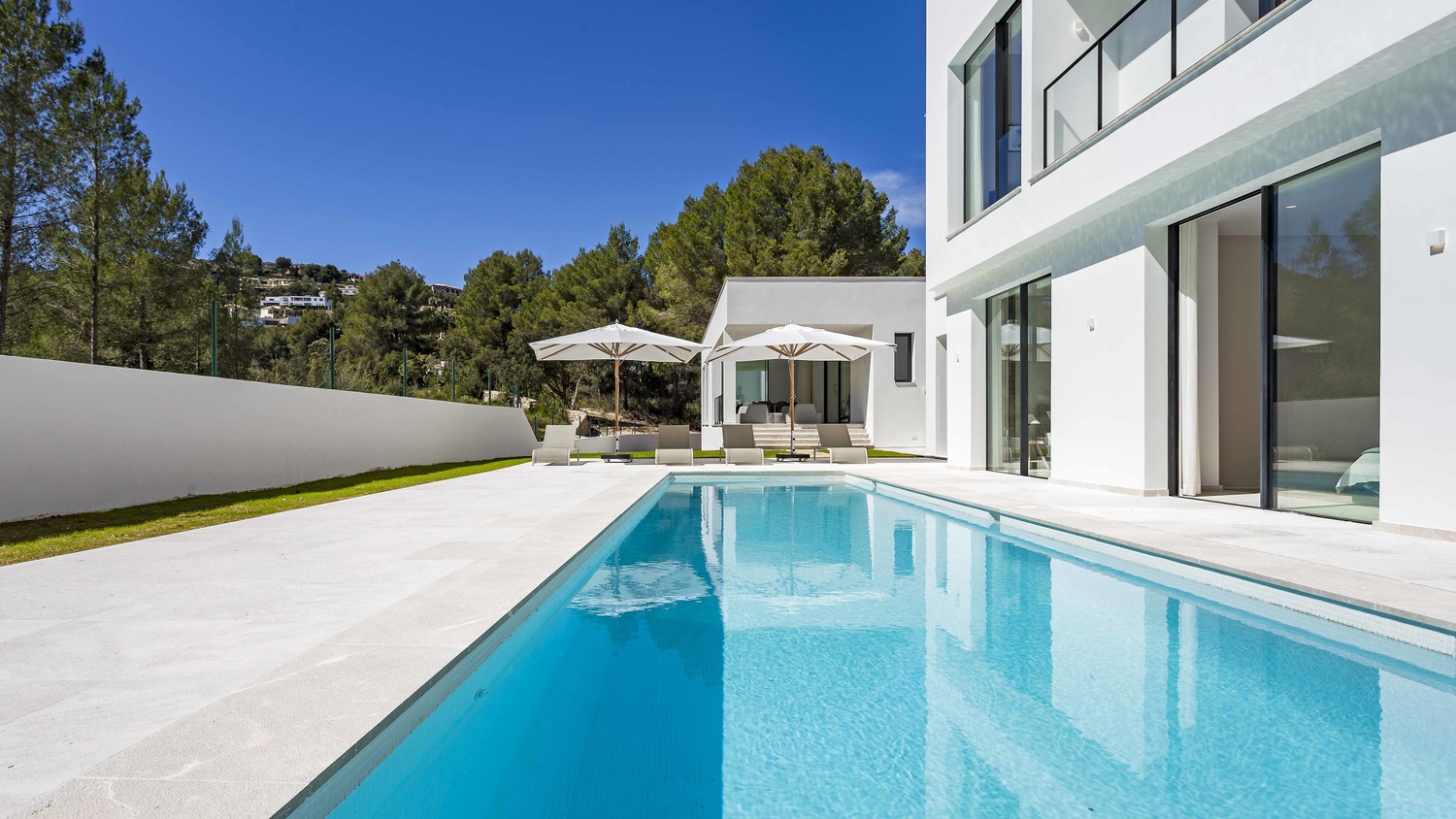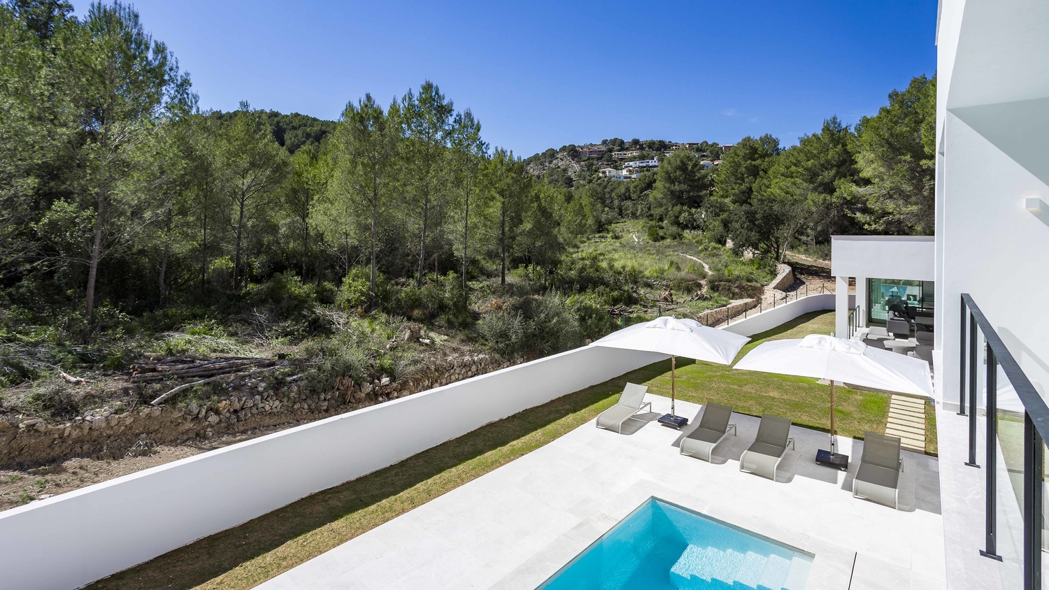 This recently finished villa is bedded in a well-kept Mediterranean garden with a large outdoor heated pool and several covered and uncovered chill and dining terraces.