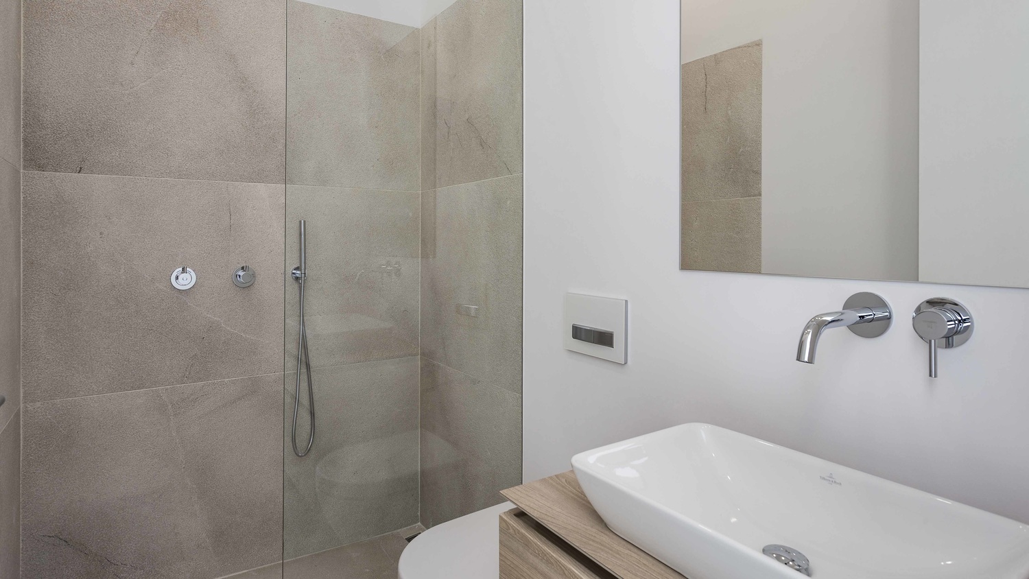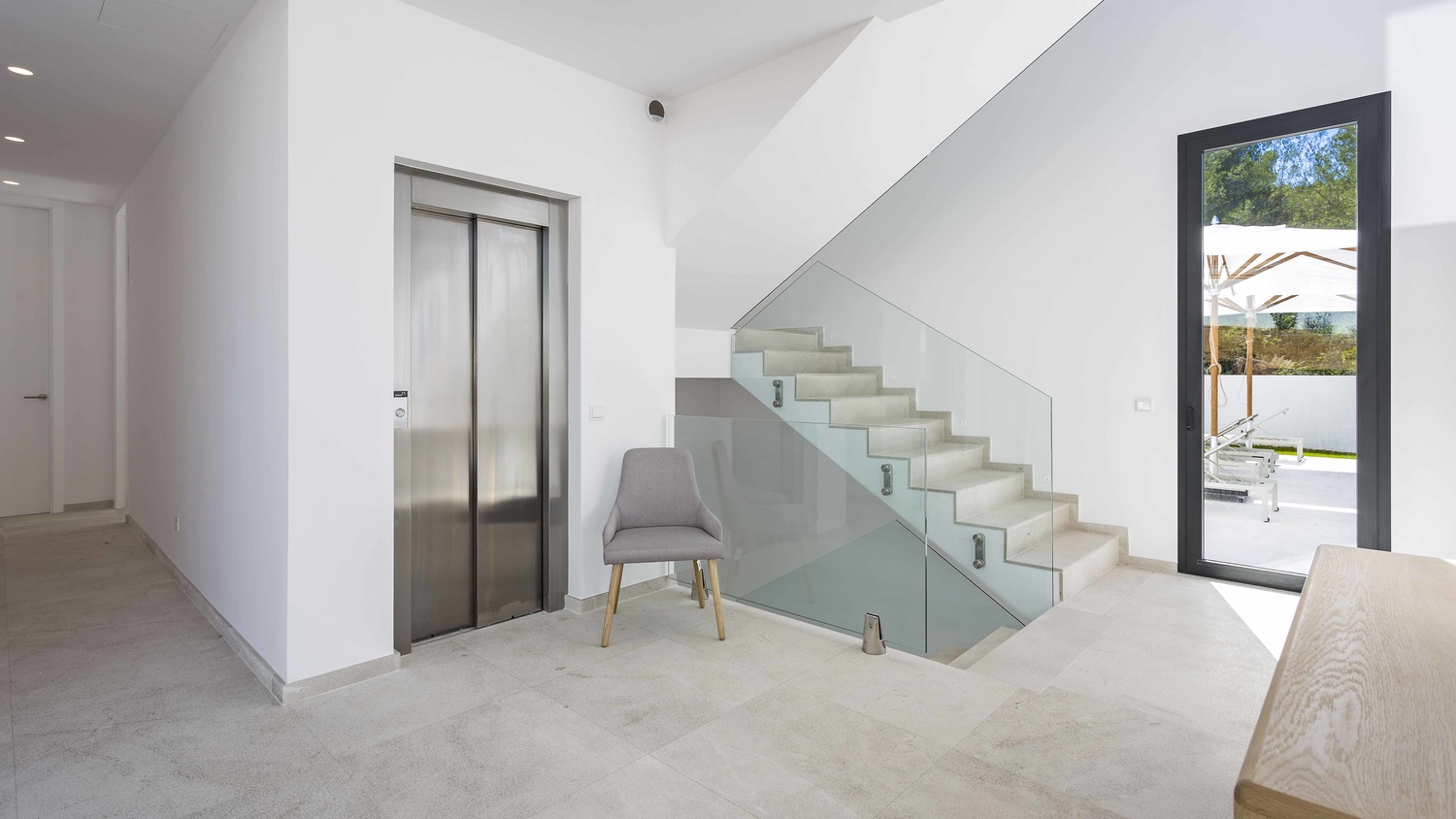 Ground floor: bright entrance which leads directly to an open loft styled living-dining area with open fireplace, open kitchen connected to the outside terrace area, guest toilet and wardrobe, lift and impressive open staircase which leads to two large guest bedrooms with en-suite bathrooms and direct access to the pool and outside terrace area.