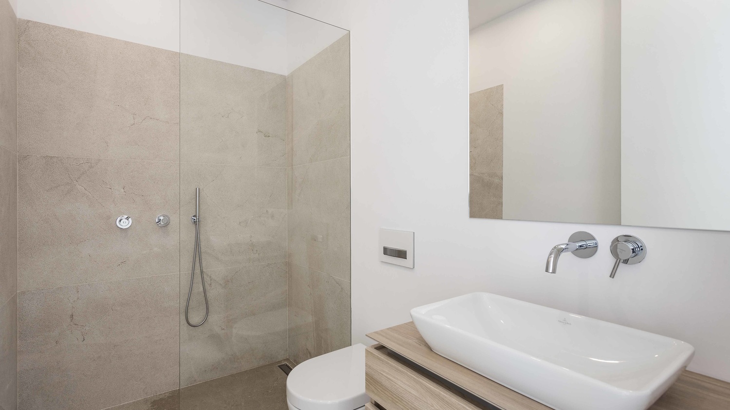 Ground floor: The main door leads you to the open living and dining area, with an open kitchen to your left offering a direct access to the outside terrace area. The garage has an direct access to the kitchen. To the right you will find a guest bedroom with bathroom en-suite, guest toilet as well as the laundry room.