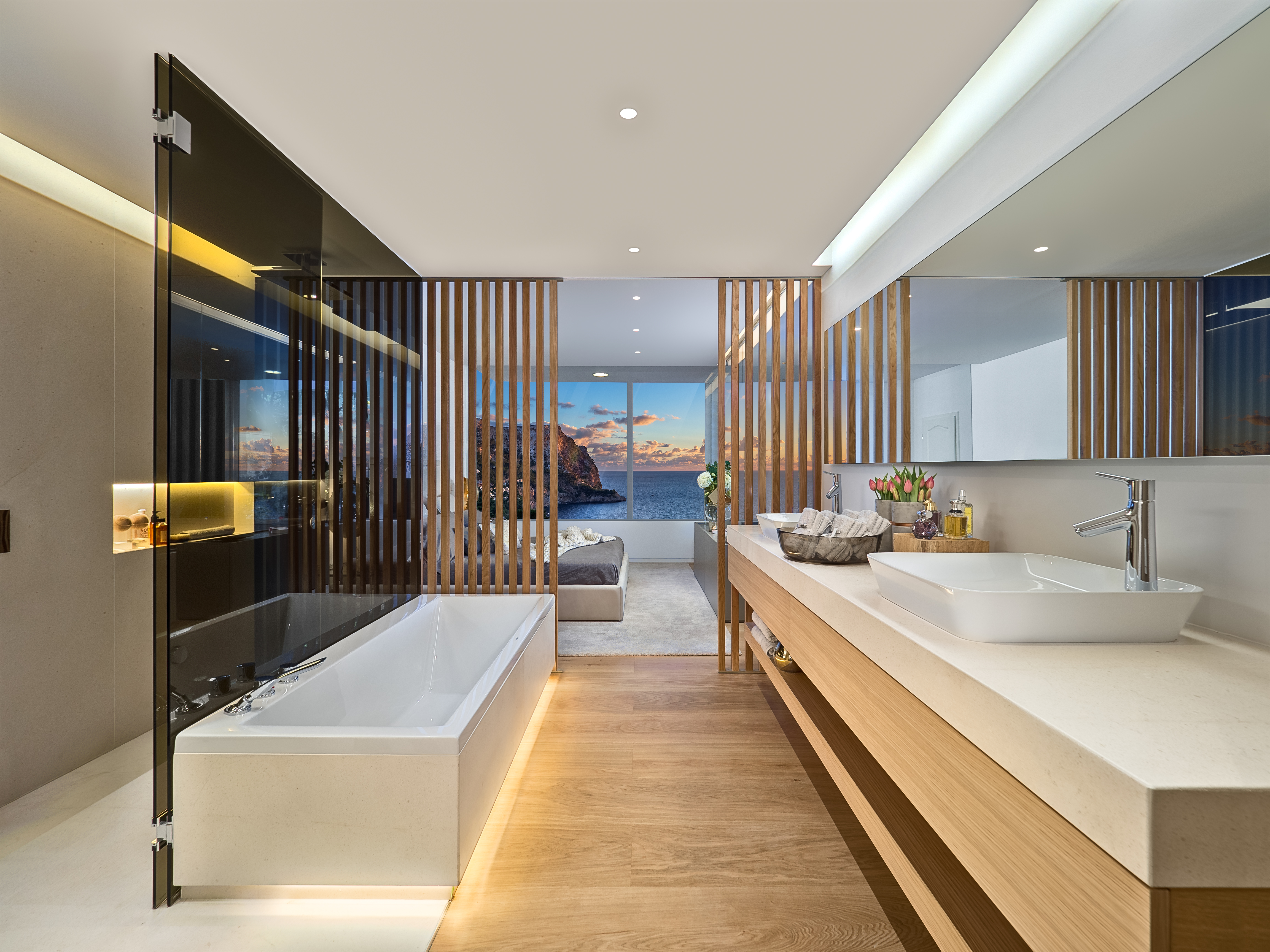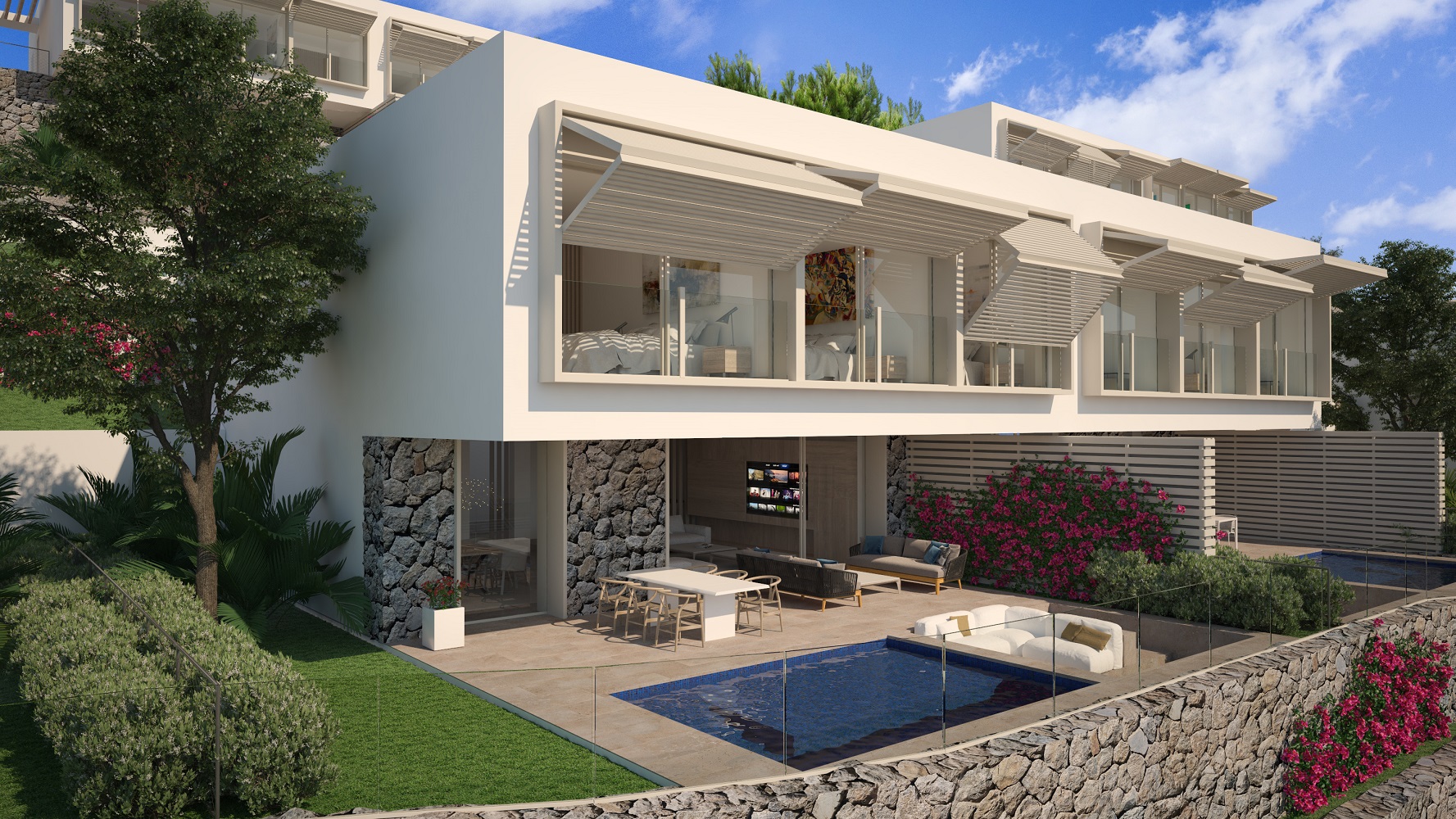 The New Folies complex consists of 41 houses, all with private pool and garden. At the moment there are still 6 villas available with the price range between 3.690.000 to 2.105.000. The new owners will enjoy exclusive access to the community pool, as well as the social club and spa area of the complex. In addition, all owners receive a VIP card for the Beach Club Cala Llamp.