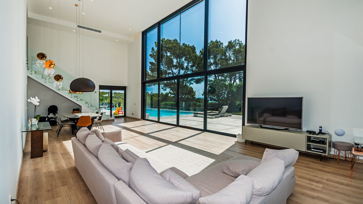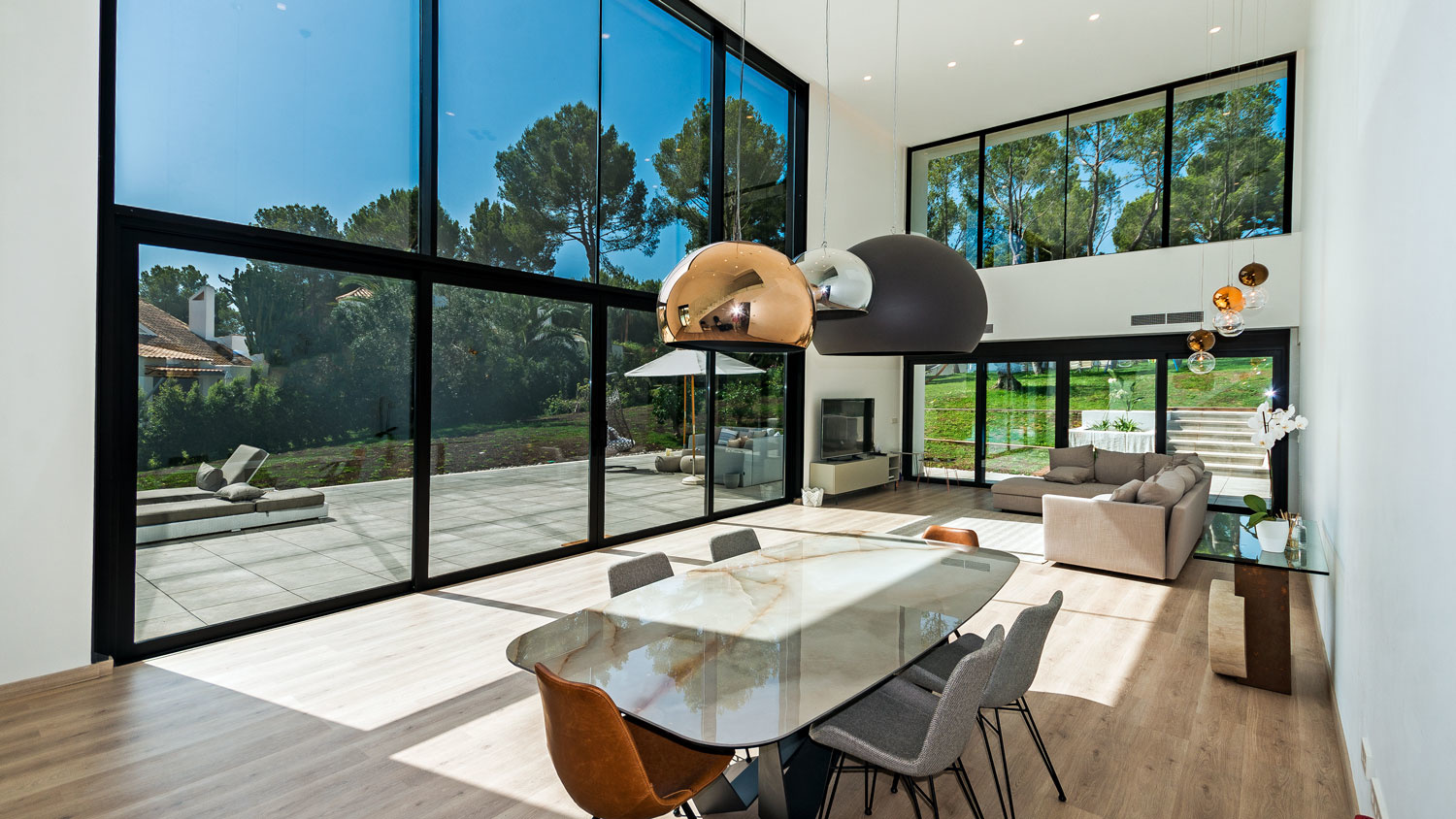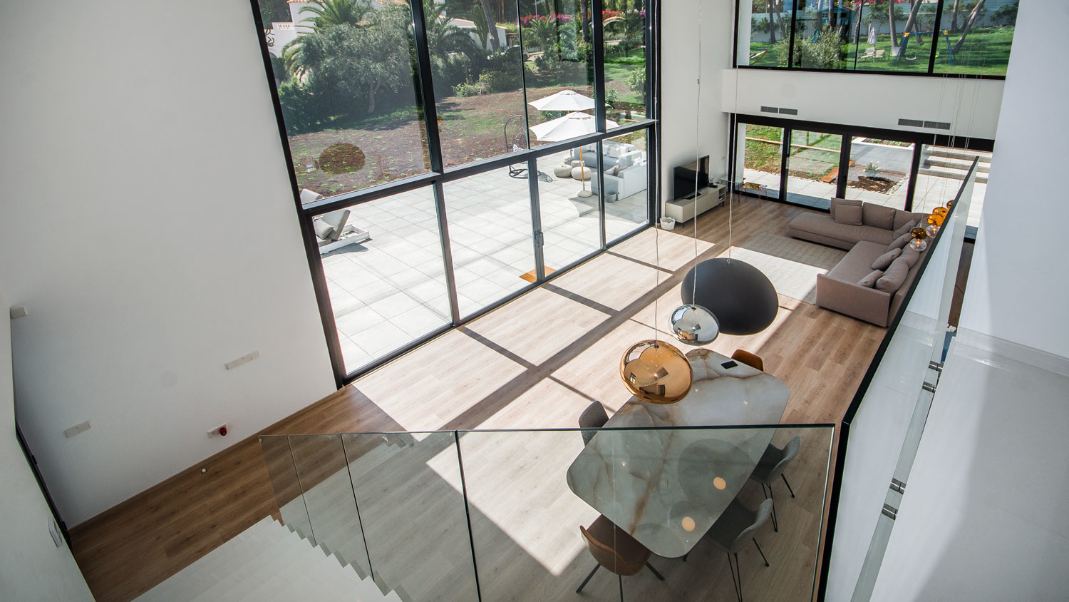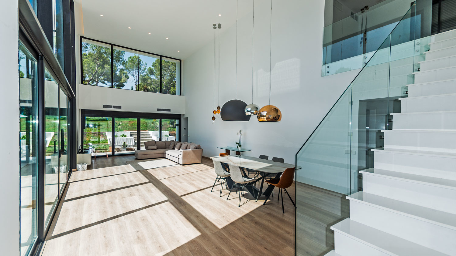 Ground floor: Large open living room with dining area with double height ceilings, as well as a wide window front to the garden, which can be opened completely and thus seamlessly passes the interior into the outdoor area. Furthermore, there is a guest bathroom, a fully fitted kitchen, a laundry room, the staff room with bathroom, the spacious master bedroom with dressing area and bathroom en-suite, two further bedrooms each with bathroom en-suite.
