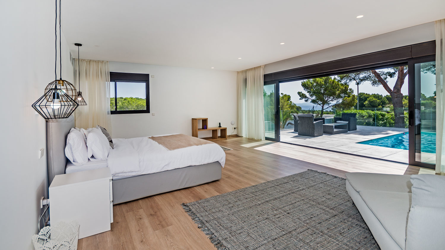 The pool area can be accessed through the living and dining area, the master bedroom as well as the two further bedrooms, which are all located on the ground floor. The property is surrounded by an extensive ground level garden and has a heatable large saltwater pool and a spacious terrace area with a barbeque.