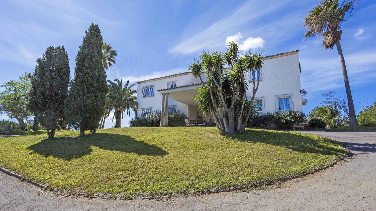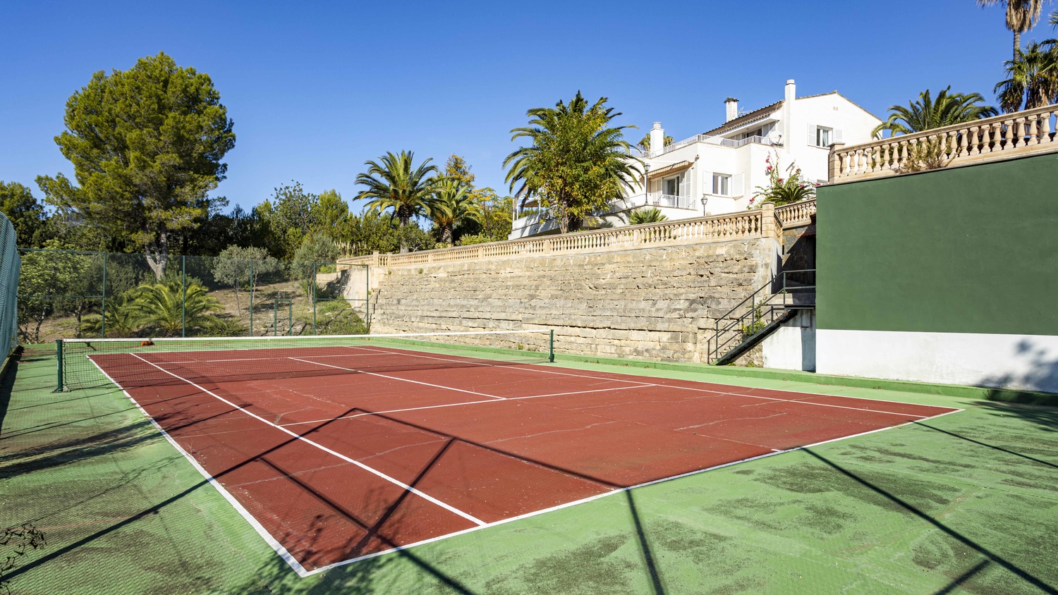 It comes with a spacious outdoor area of 8.500 m2 offering a lot of privacy and tranquility and a beautiful Mediterranean garden with various fruit trees, watered by an automatic irrigation system. There is also a gorgeous large swimming pool of 60 m2 with sun terrace and a tennis court. An ample drive way leads up to the villas entrance and there is covered parking for 2 cars and a further 5 cars, which can easily be parked on the grounds of the property.