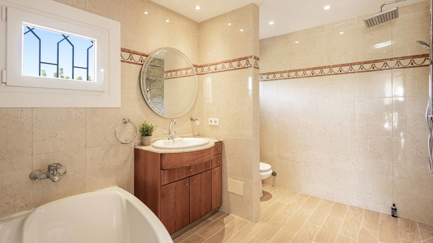 Ground floor: entrance hall, ample living room, dining room, separate kitchen, laundry room, guest toilet, 2 bedrooms with bathroom en-suite, a further room, which is currently being used as an office, a lovely interior patio with a little fountain.