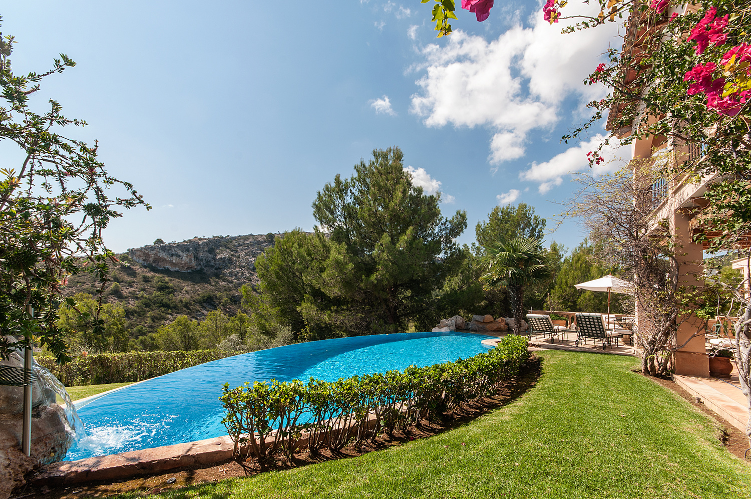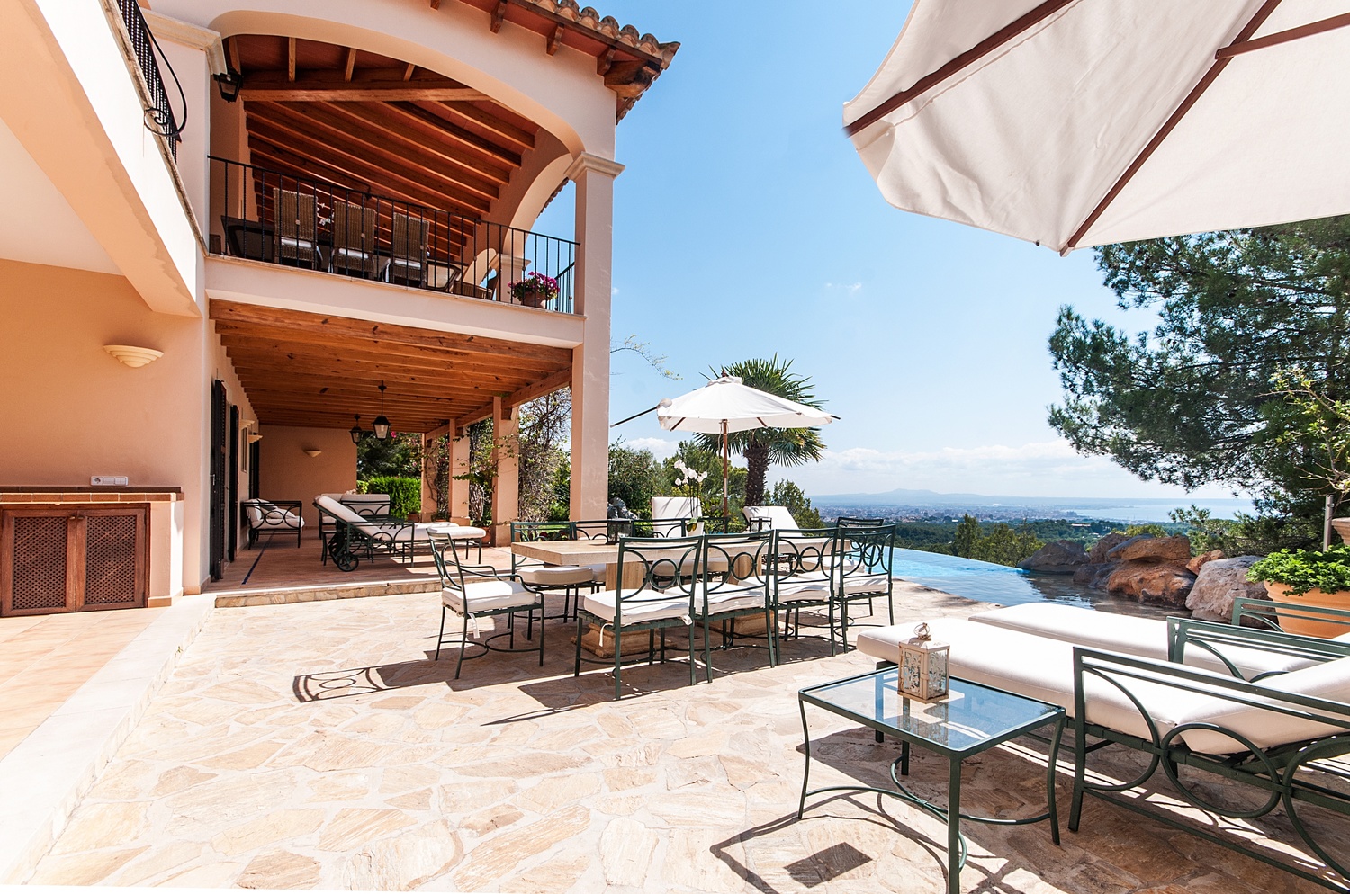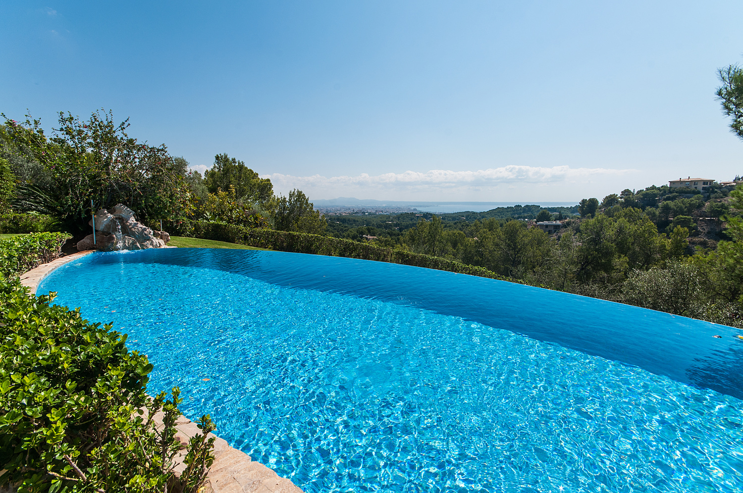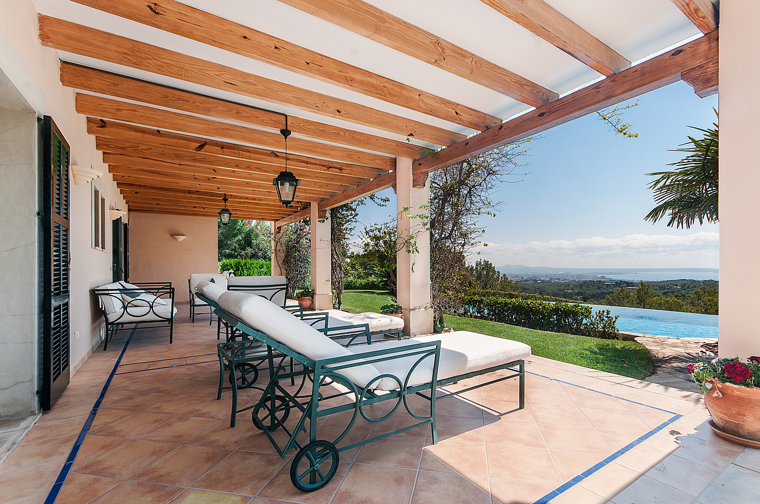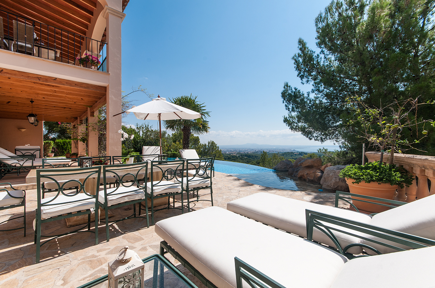 Large, very attractive open and covered terraces. Beautiful flat Mediterranean garden with lagoon -swimming pool. Views to Palma and the bay.