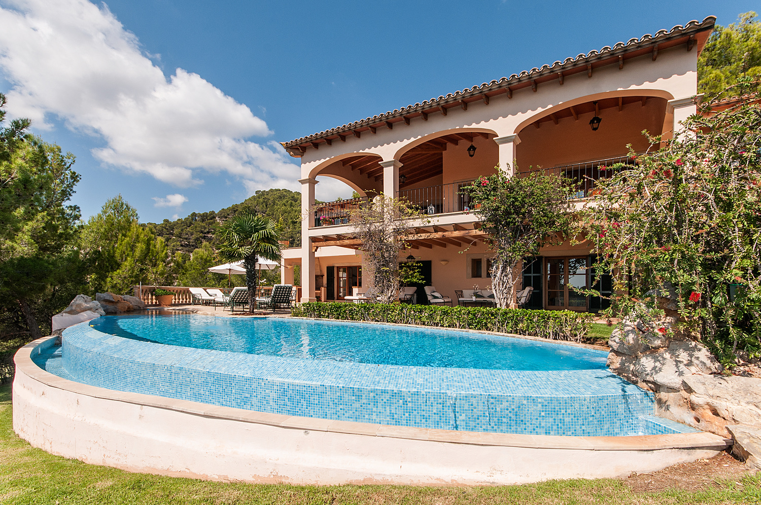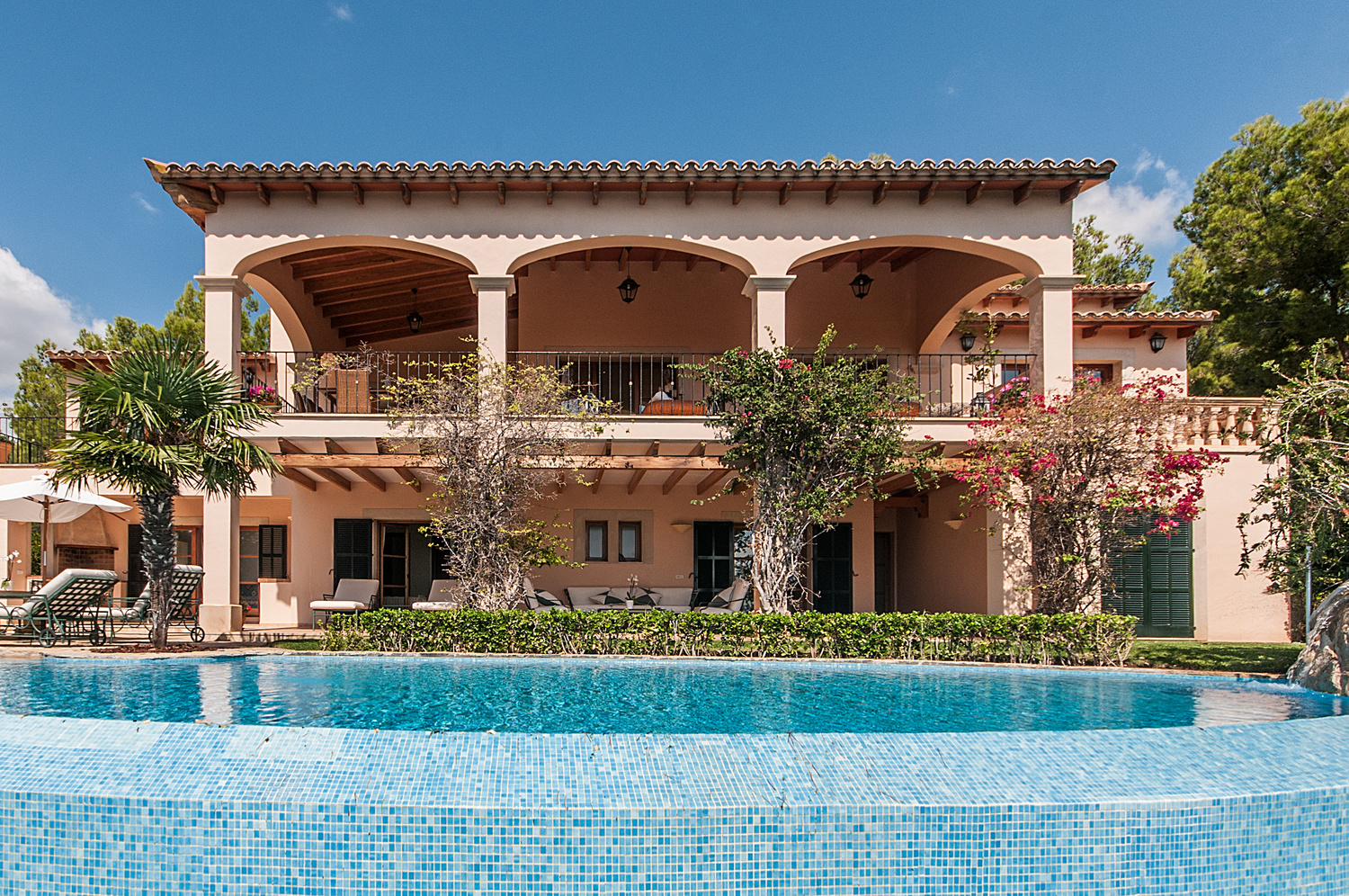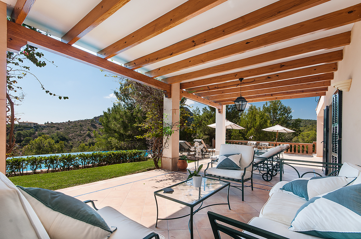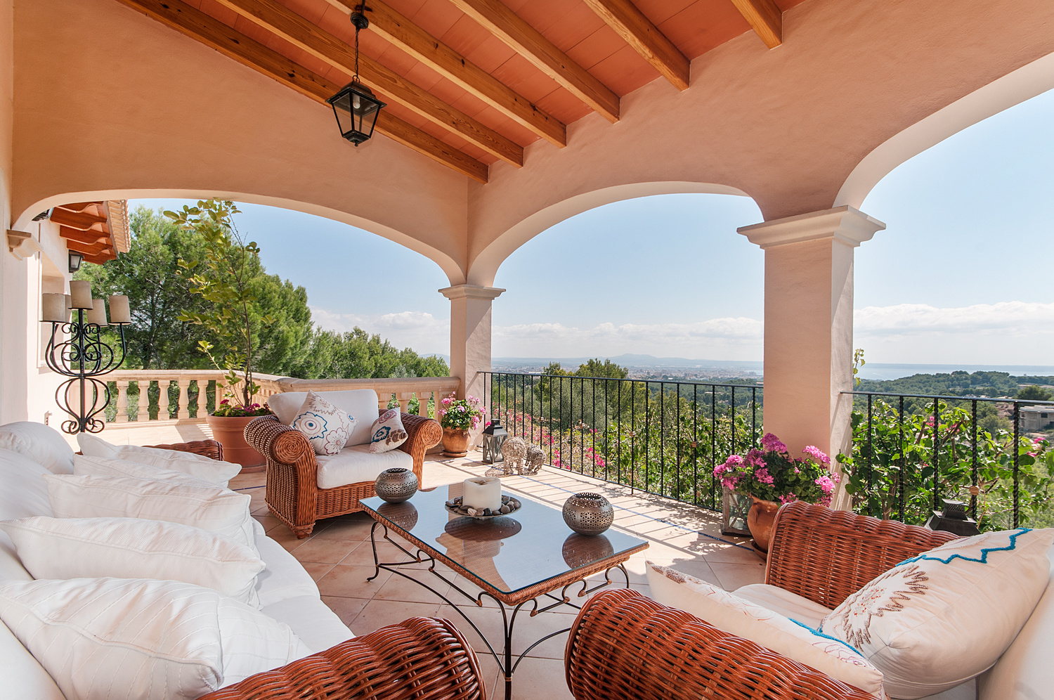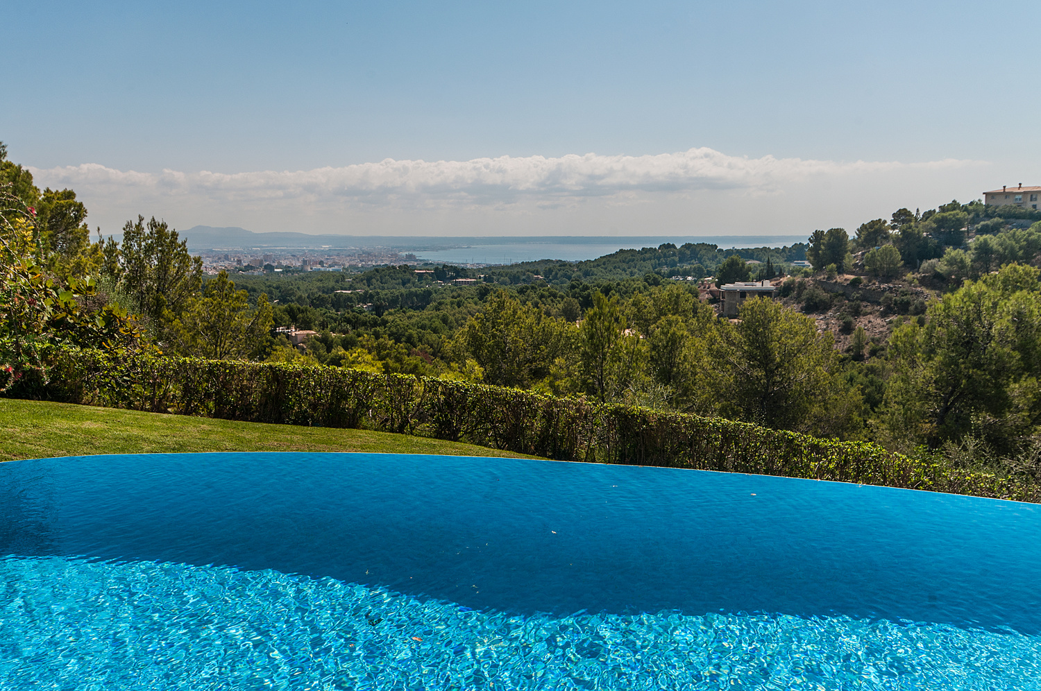 Large, very attractive open and covered terraces. Beautiful flat Mediterranean garden with lagoon -swimming pool. Views to Palma and the bay.