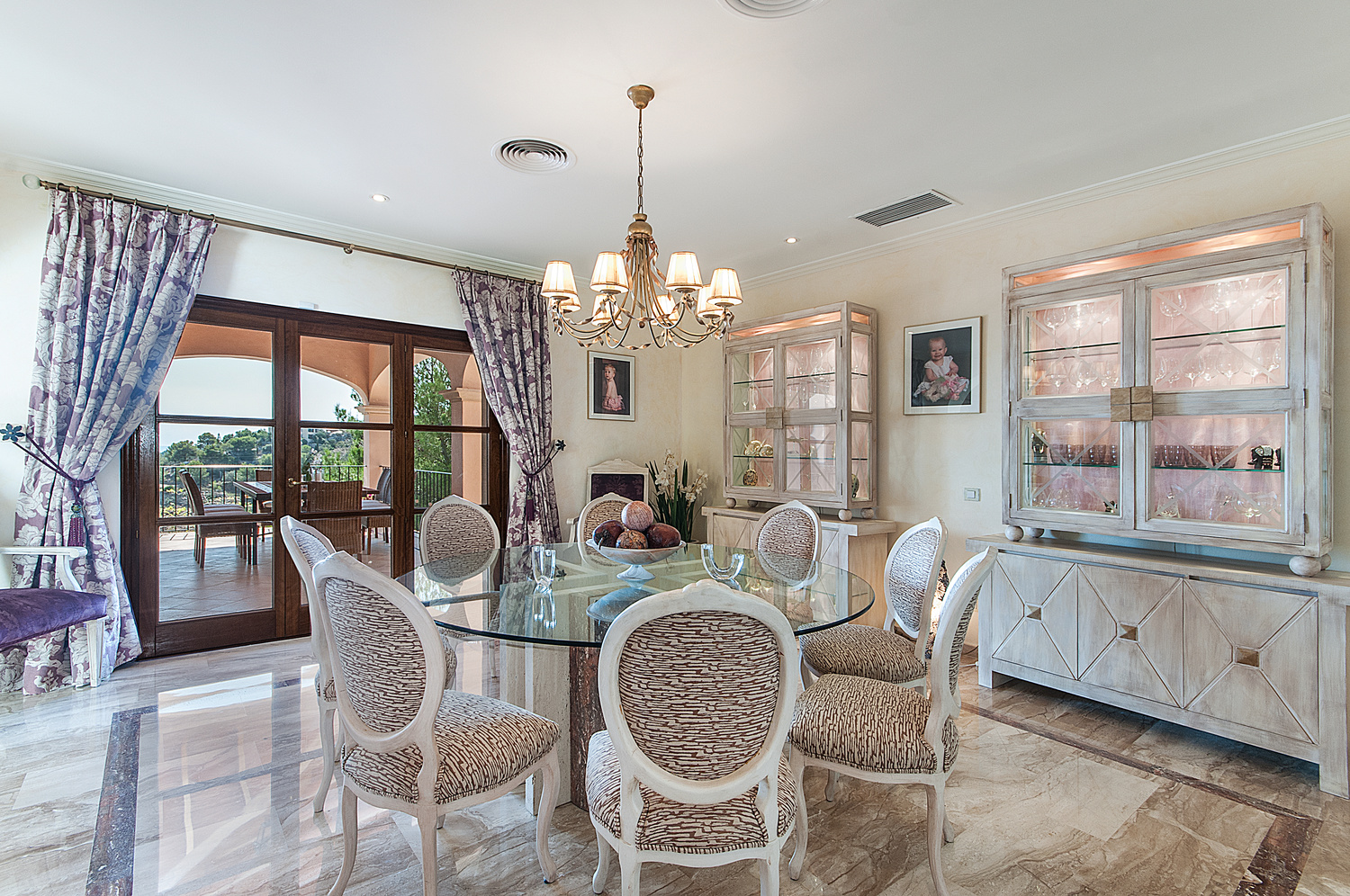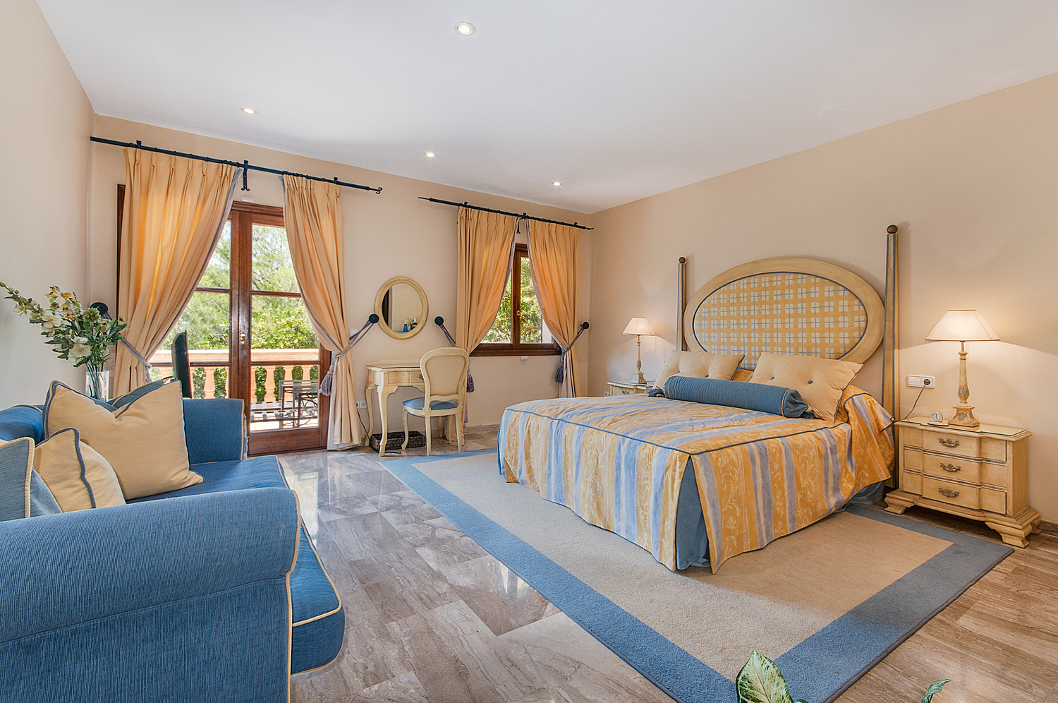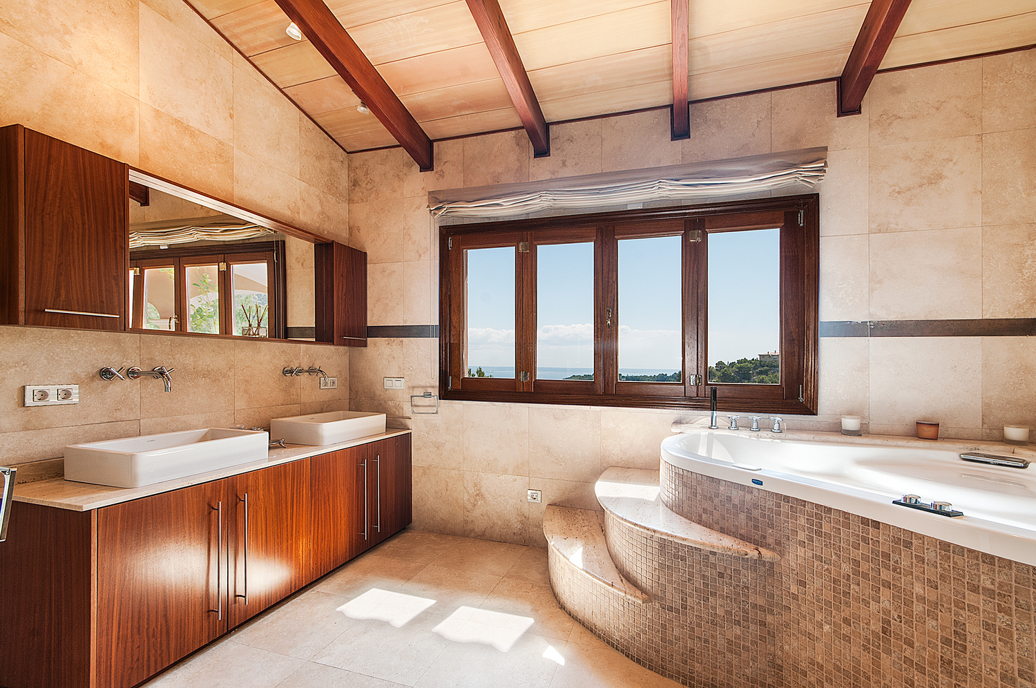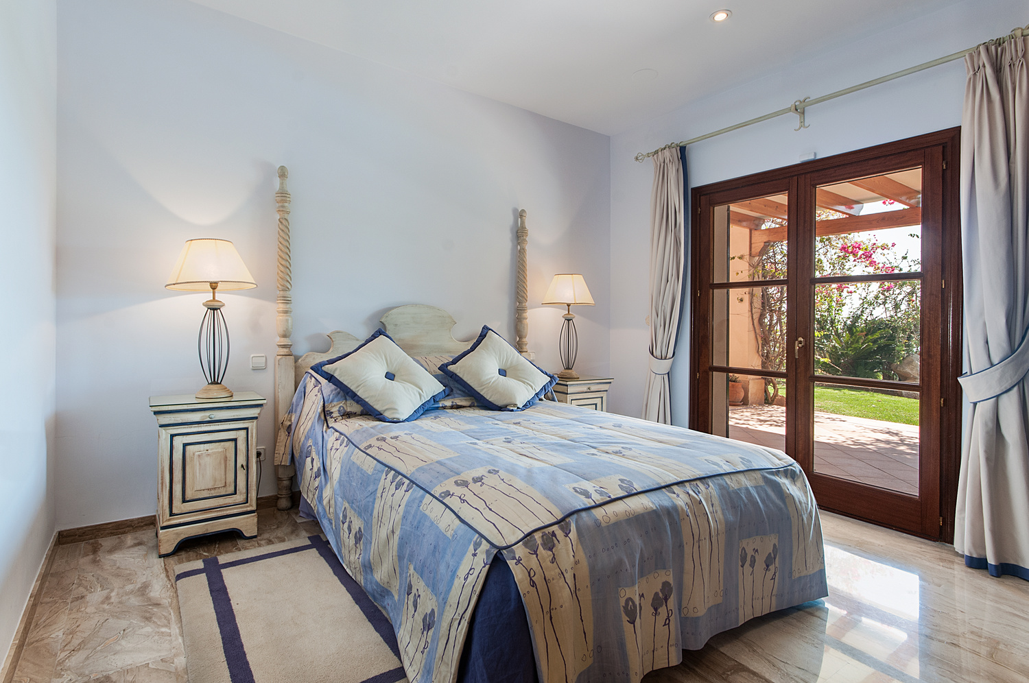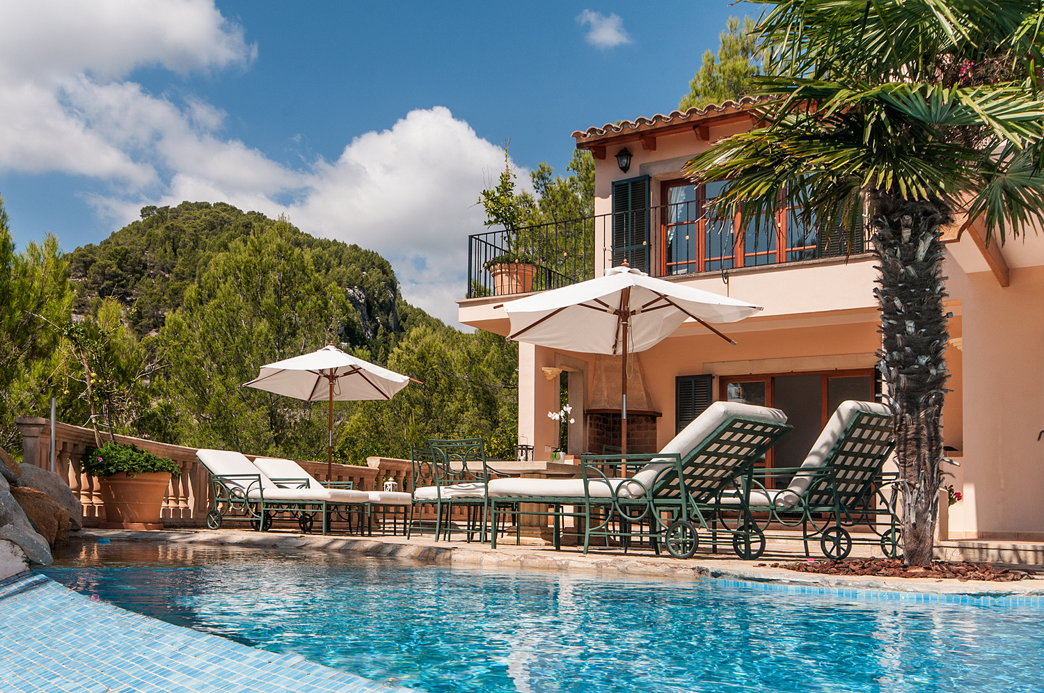Large, very attractive open and covered terraces. Beautiful flat Mediterranean garden with lagoon -swimming pool. Views to Palma and the bay.
