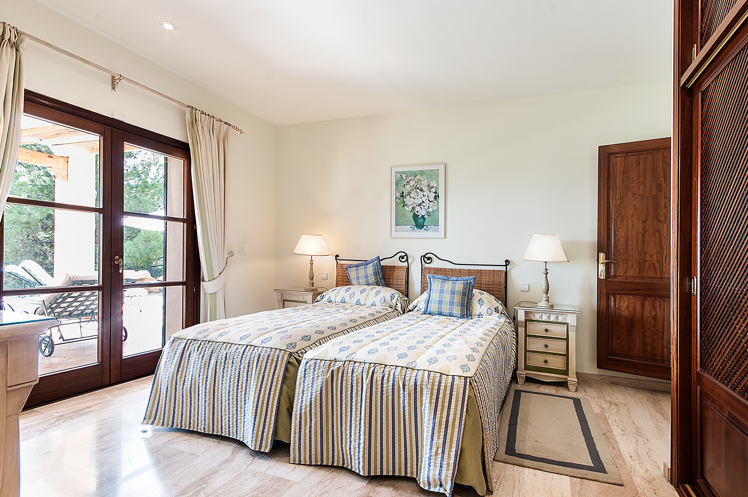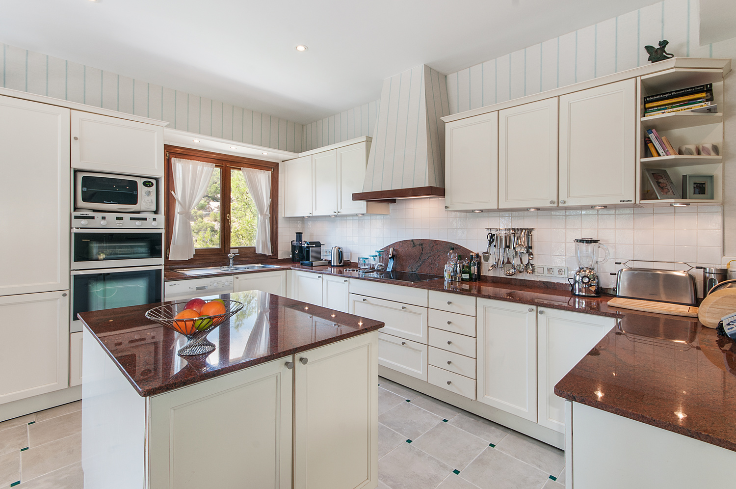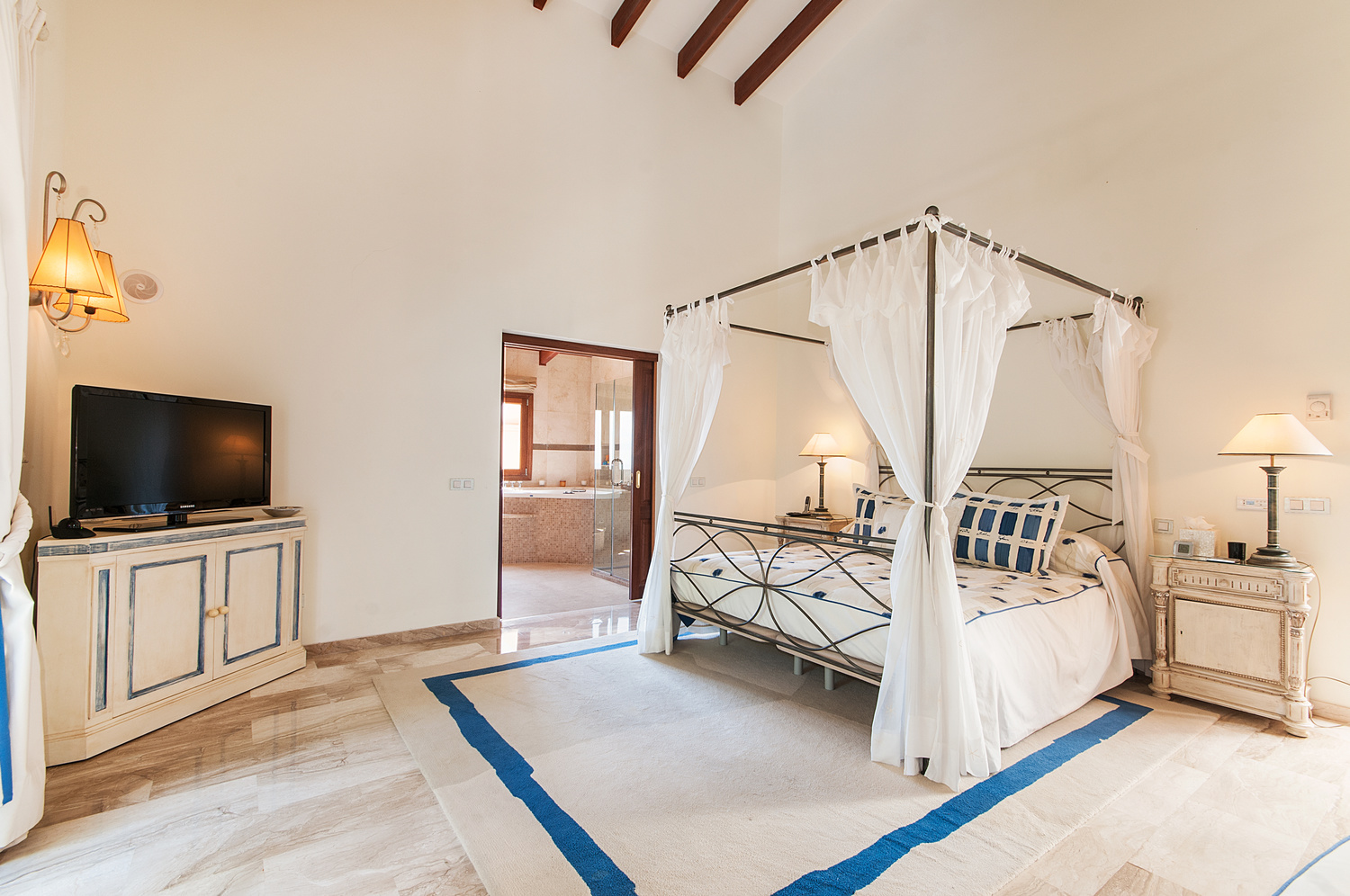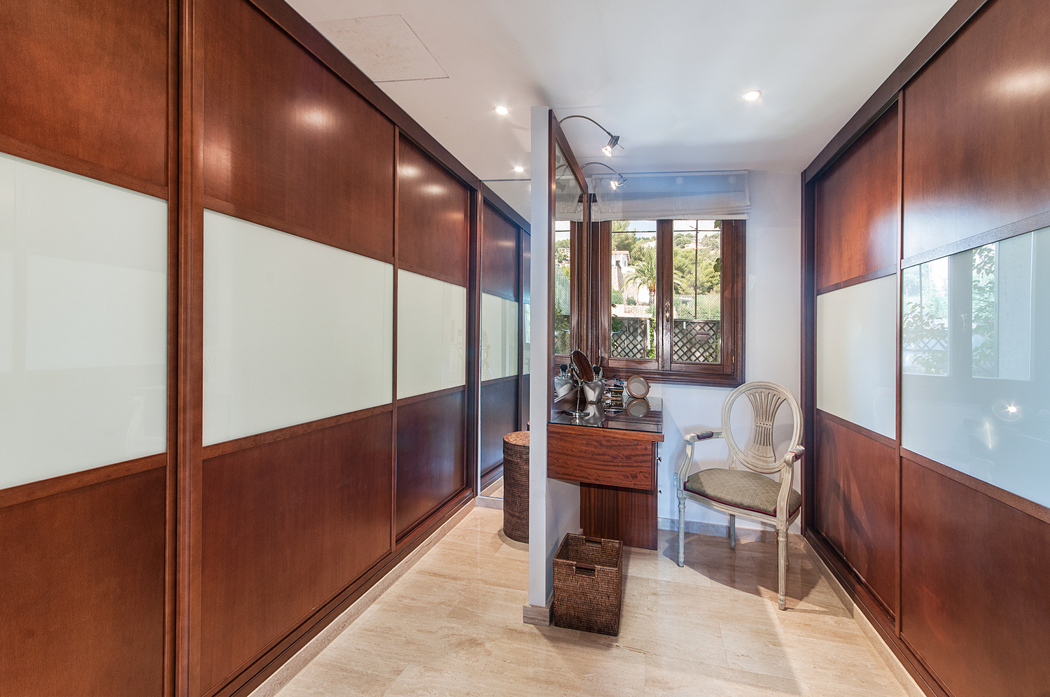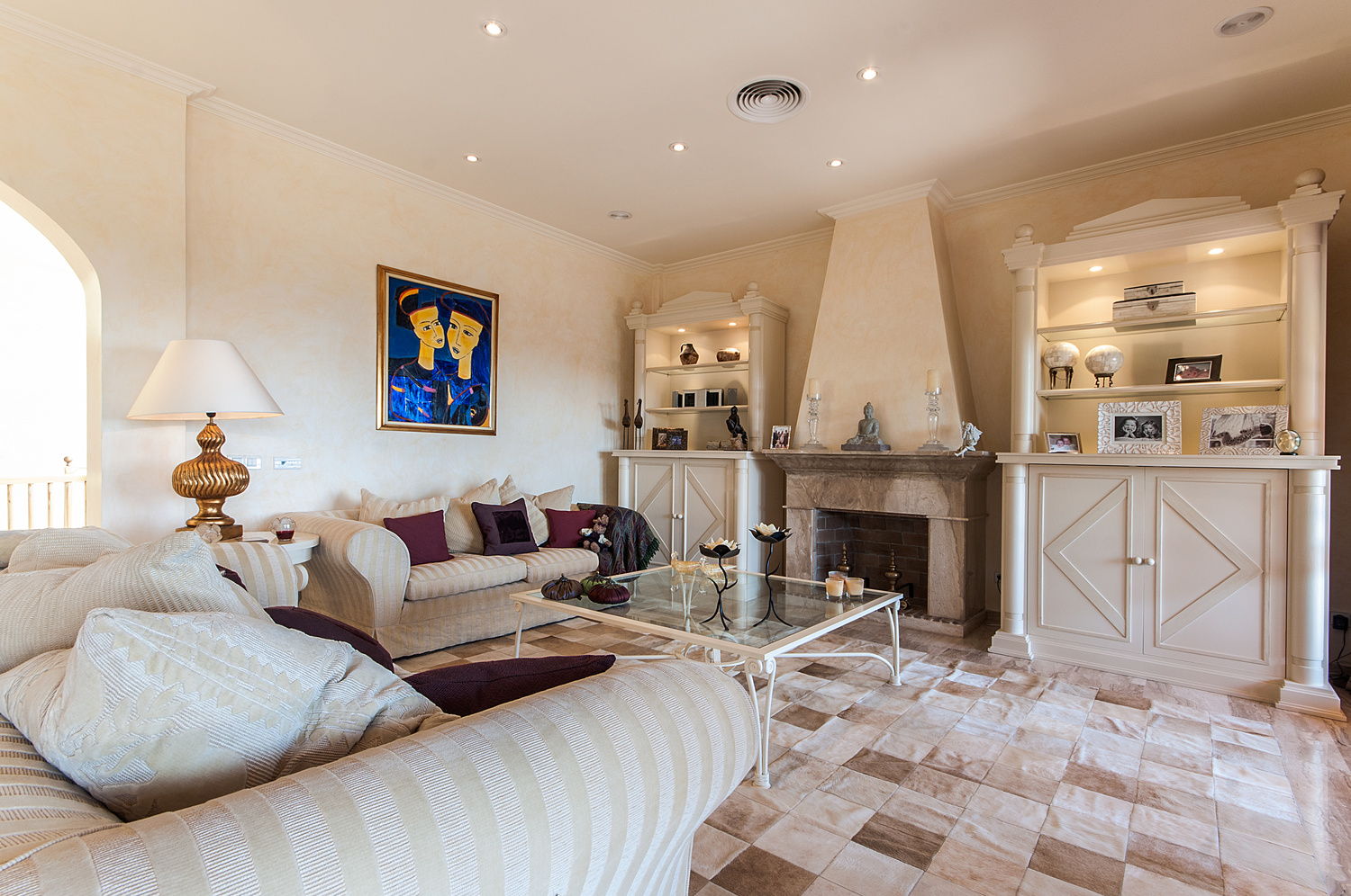 Large, very attractive open and covered terraces. Beautiful flat Mediterranean garden with lagoon -swimming pool. Views to Palma and the bay.
