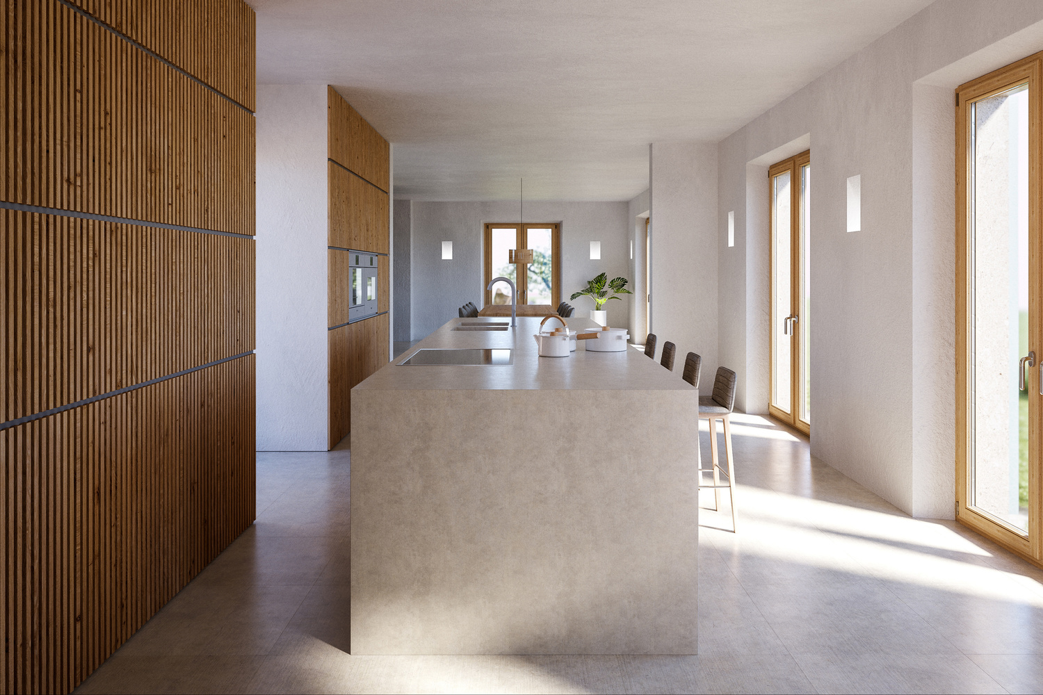 Ground floor: the property was built in a U-shape, on one side of it there is the kitchen open towards the dining room, guest WC and entrance hall. Two large living rooms are situated in the center of the building and on the other side of the house there are three guest bedrooms, each with an en-suite bathroom.