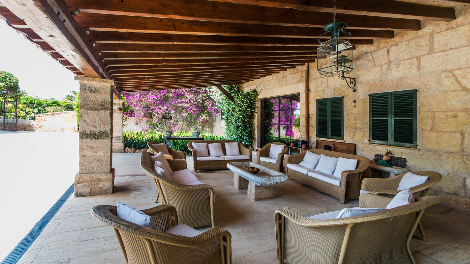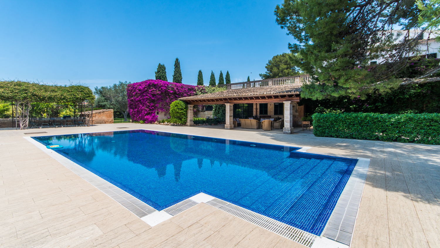 On the south facing side of the finca there is a large swimming pool with open and partially covered terraces with inviting sitting areas and an outside bathroom with toilet and shower. This area has also been renovated and redesigned in 2014.