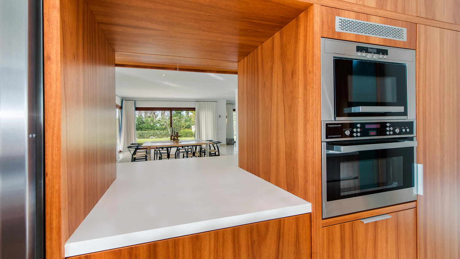 On the ground floor: 1 large bedroom with bathroom en suite, spacious living area with open designer kitchen and dining area, garage with direct access to the house, 1 further bedroom for staff.