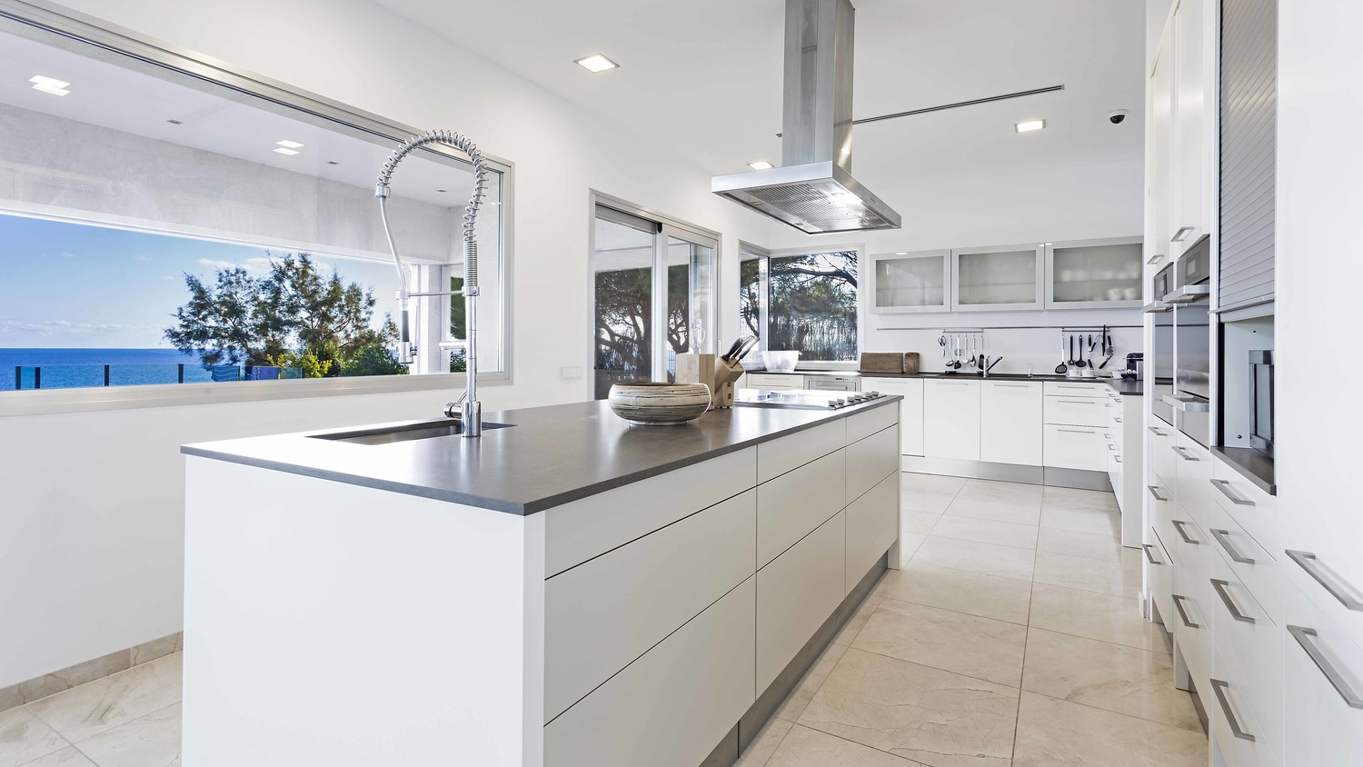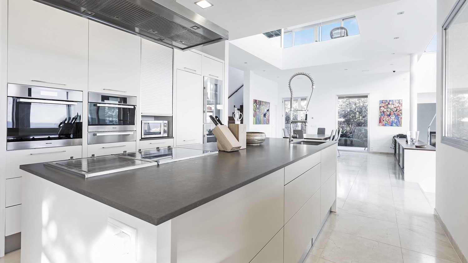 The open, modern kitchen has a cooking island and is equipped with Miele appliances and has a wine fridge, it gives access both to the pool and covered terraces.