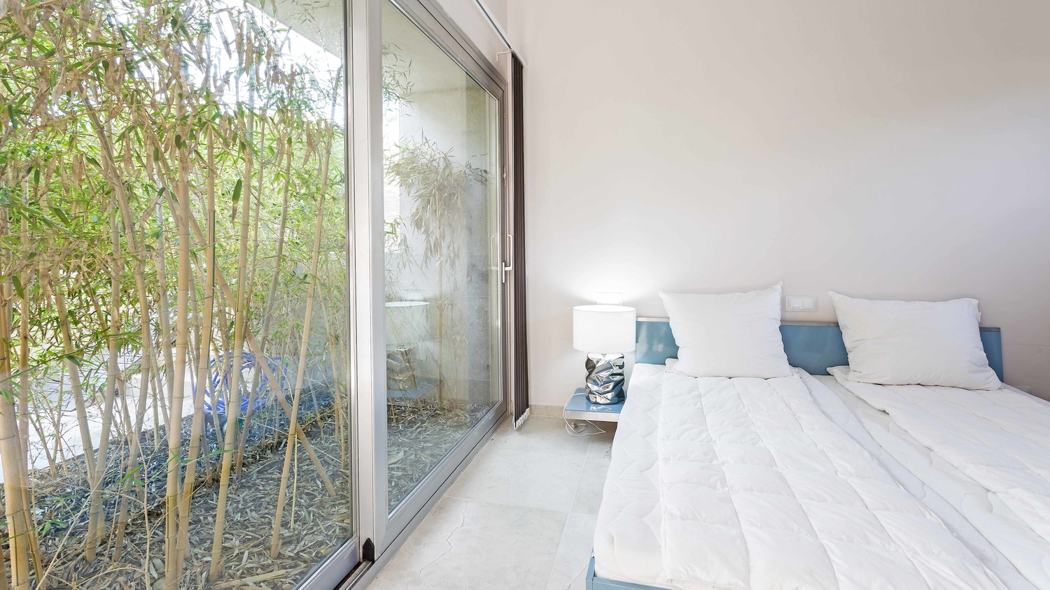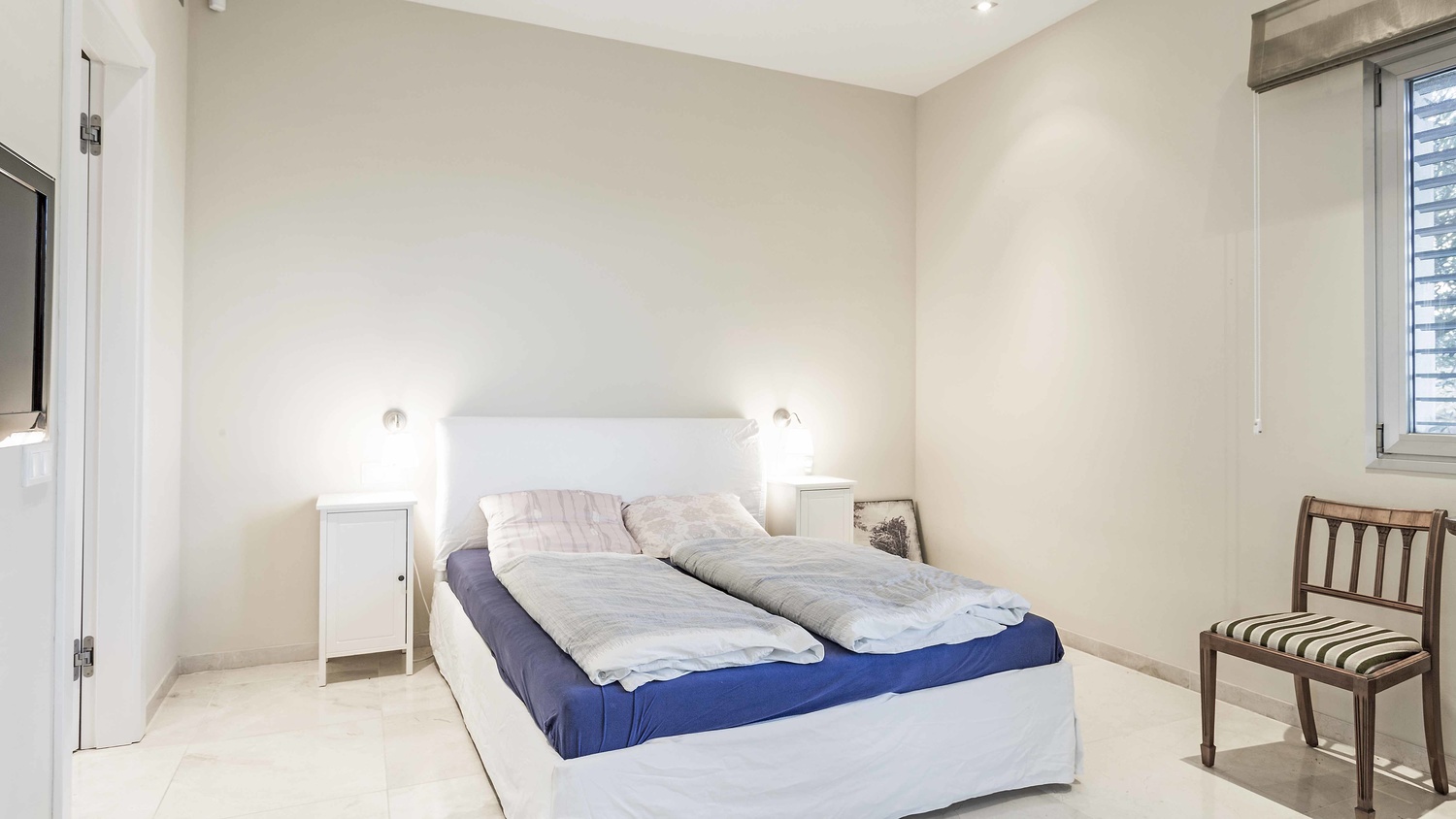 The guest house on the upper floor accommodates a living and dining area with kitchenette, a bedroom, a dressing area and a bathroom. From here you have access to a large roof terrace with sea view and via an open connecting corridor you reach the upper floor of the main house.