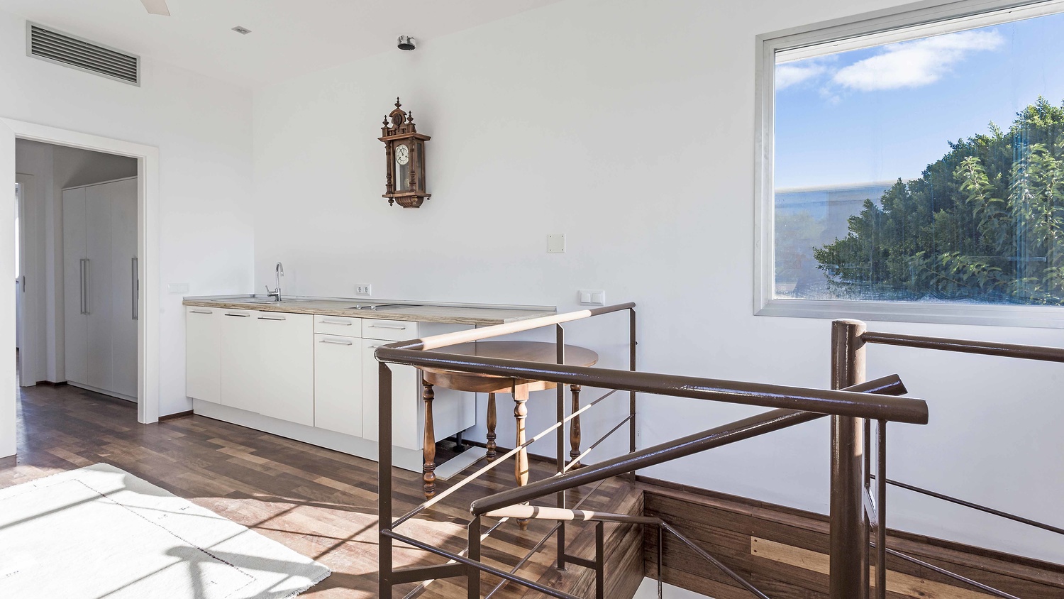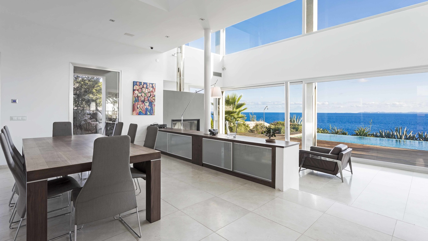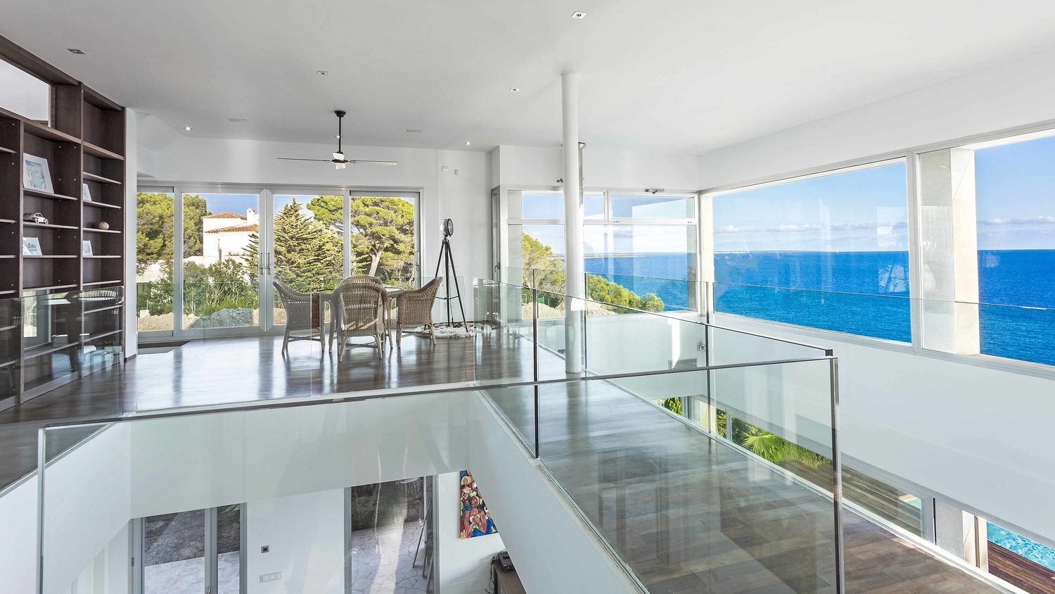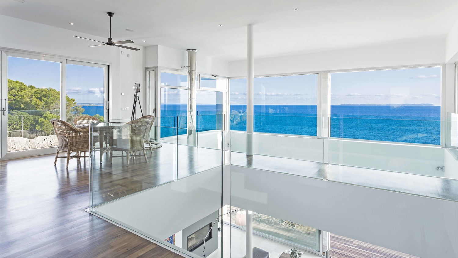 Through the entrance you reach the spacious, open living and dining area with double ceiling height and view of the crystal gallery on the upper floor. Due to the large window front you enjoy a unique sea view of the island of Cabrera and of the pool terrace with its impressive infinity pool!