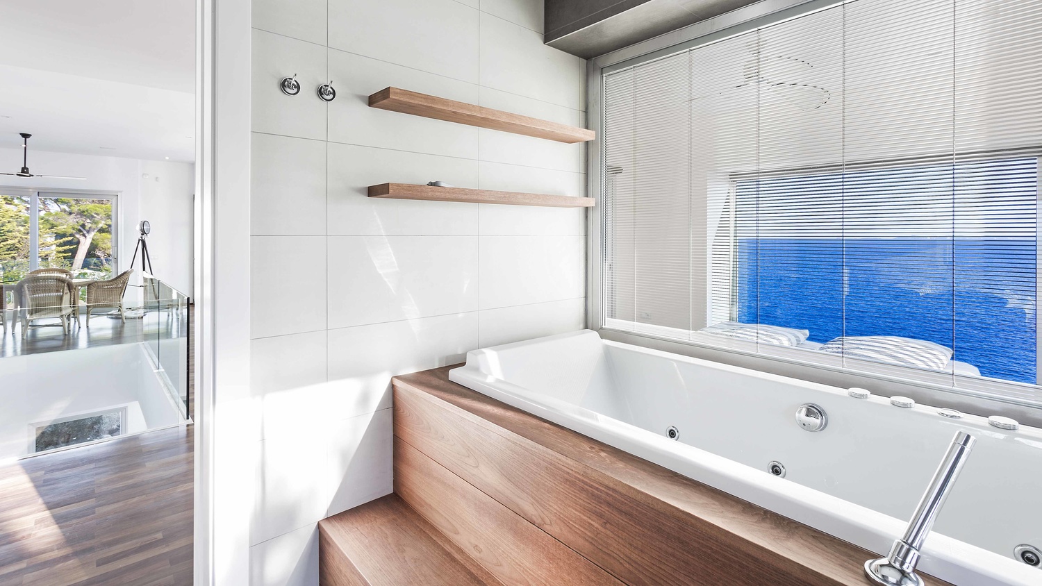 Framed by a wooden terrace, the infinity salt water pool with breath-taking sea view is without doubt the highlight of the harmoniously designed outdoor area. The beautiful terrace with its chill-out zone is surrounded by flowering plants.