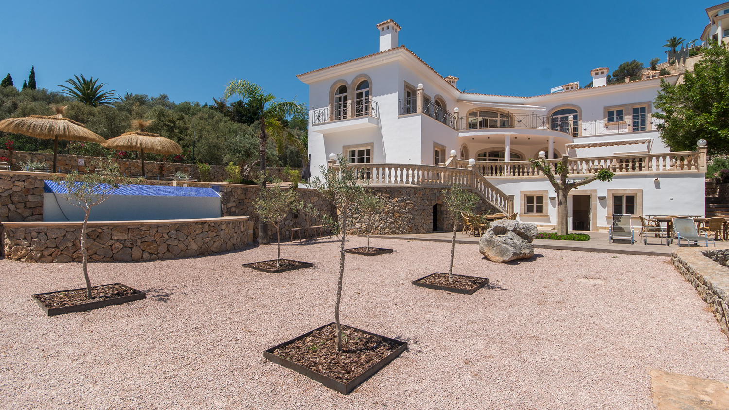 The covered terrace offers a wonderful shaded area to relax and enjoy outdoor dining. The salt water chlorinated swimming pool is surrounded by large parasols and has a waterfall effect down towards the many olive and citrus trees planted by the pool.