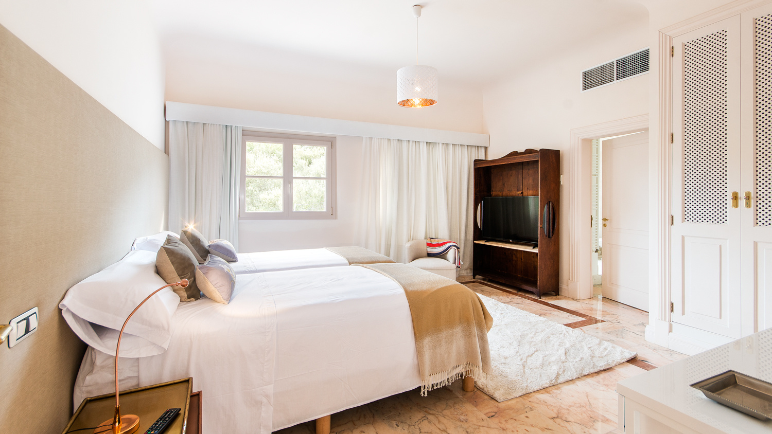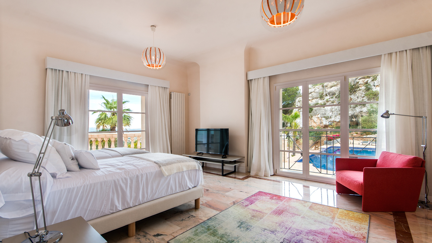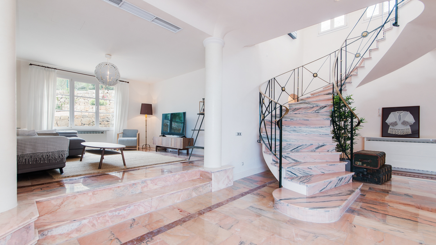 By a comfortable open staircase, you access a second lounge area, with an independent TV room, and 3 double bedrooms each with bathrooms en suite and access to the covered terrace area.