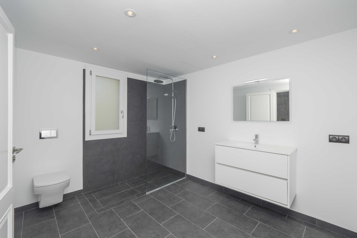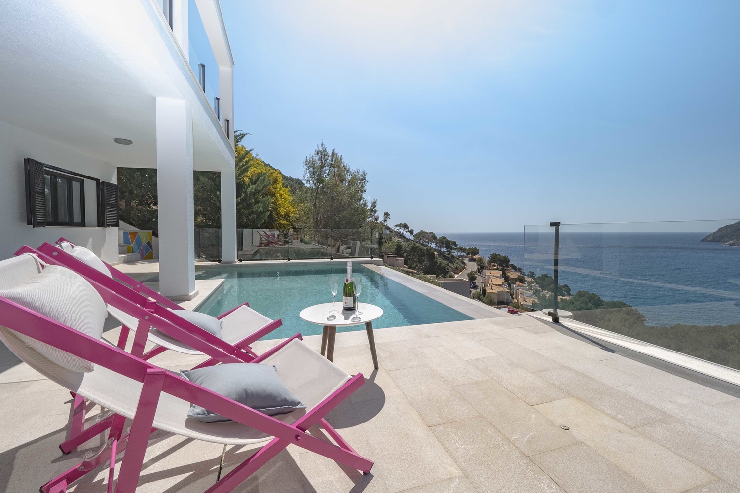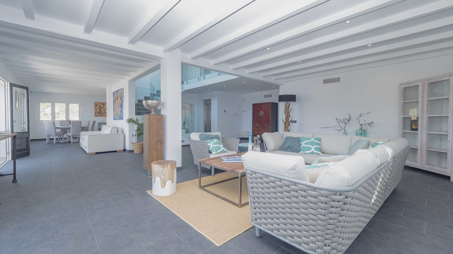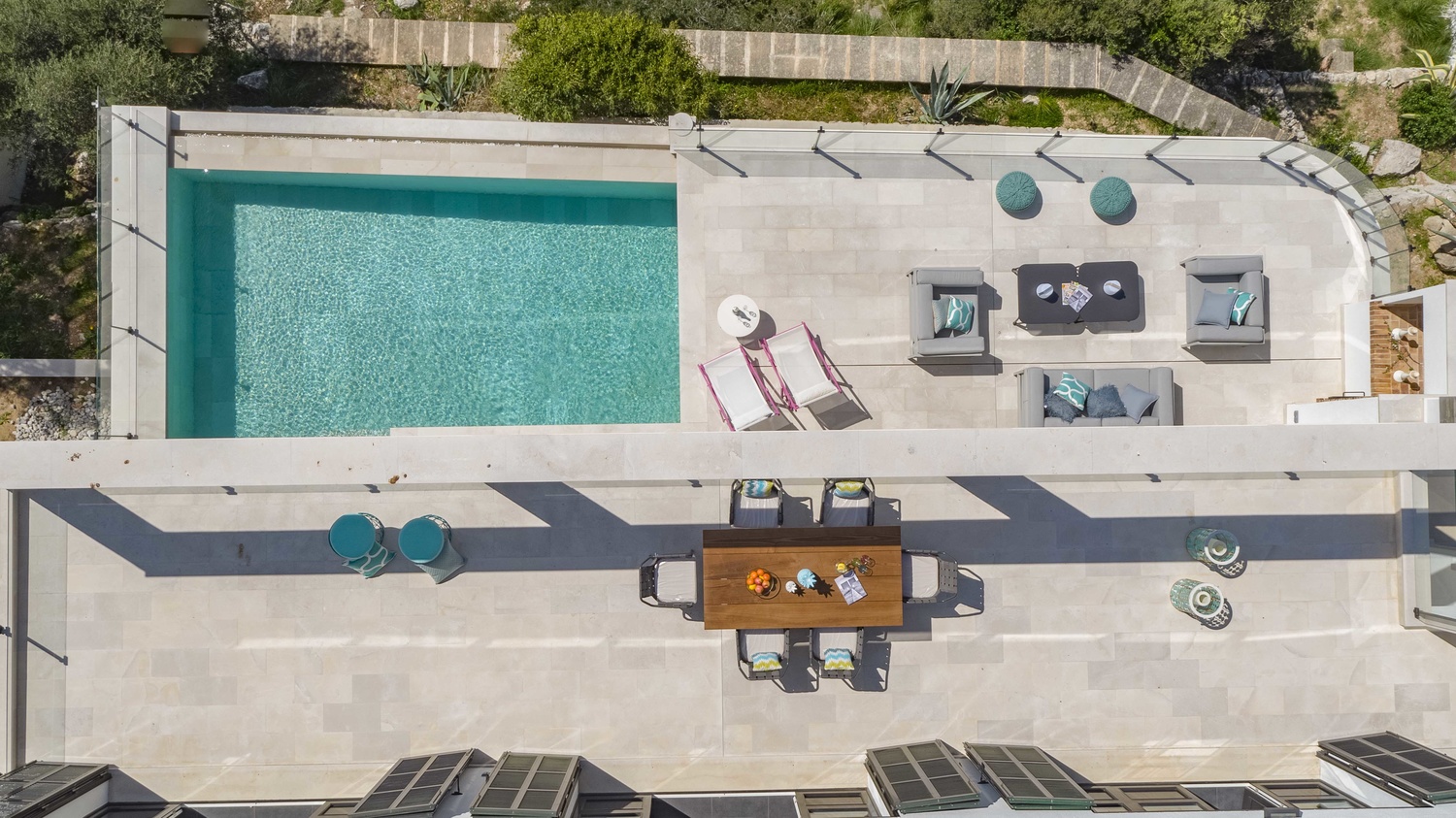 3rd basement: Lounge area incorporated in the stylish ambience in original rock face, 1 double bedroom, 1 separate bathroom, infinity pool with outdoor shower, a barbecue grill and a terraced garden. The villa has been tastefully and luxuriously furnished by the owners in collaboration with a local Mallorquín furniture store.