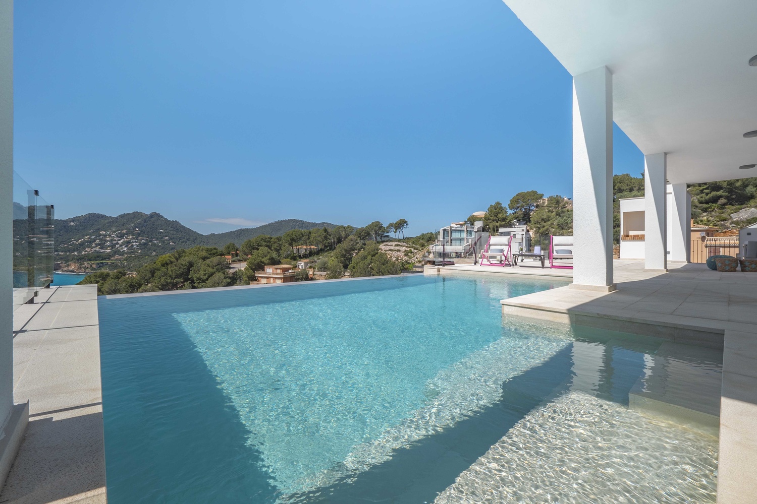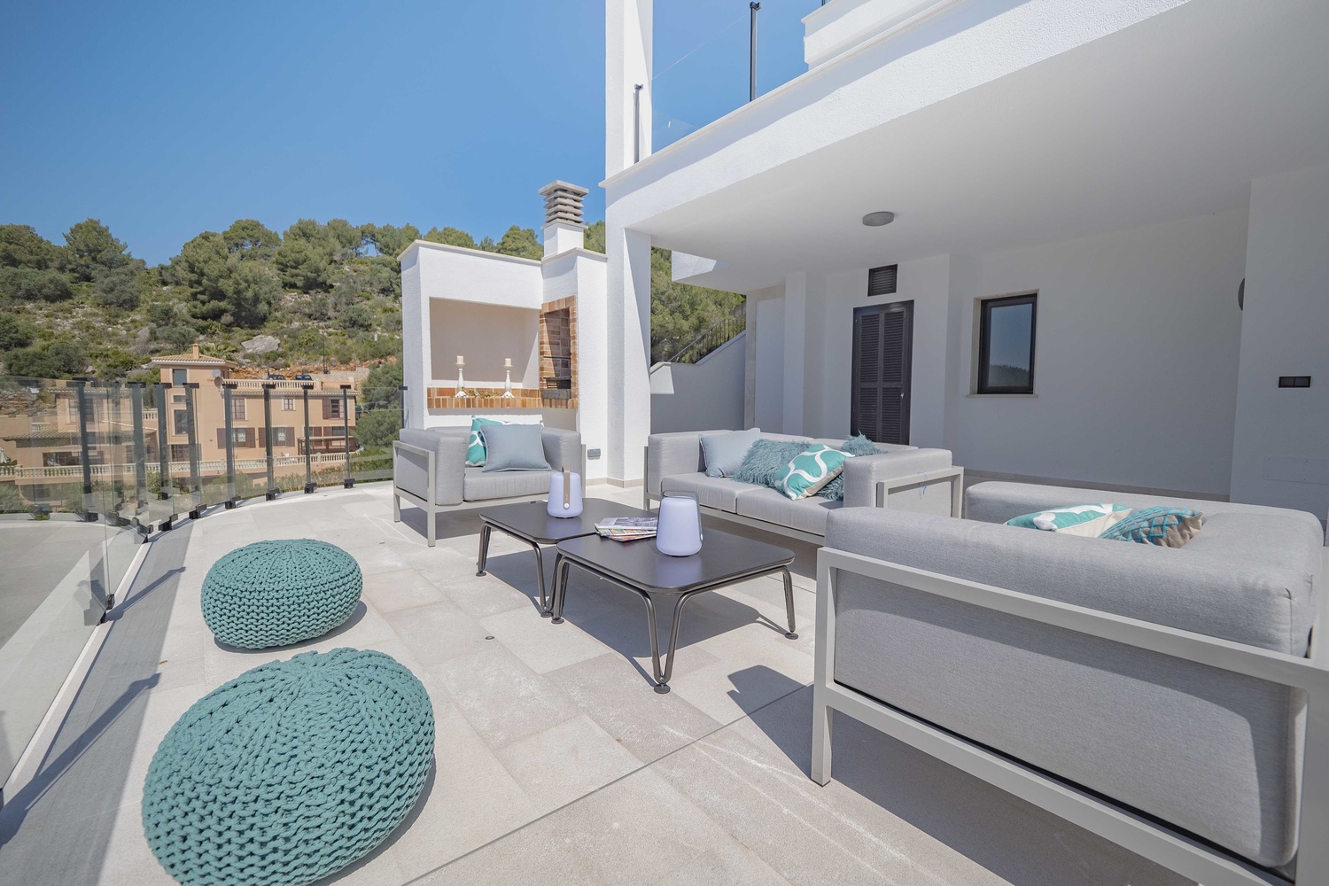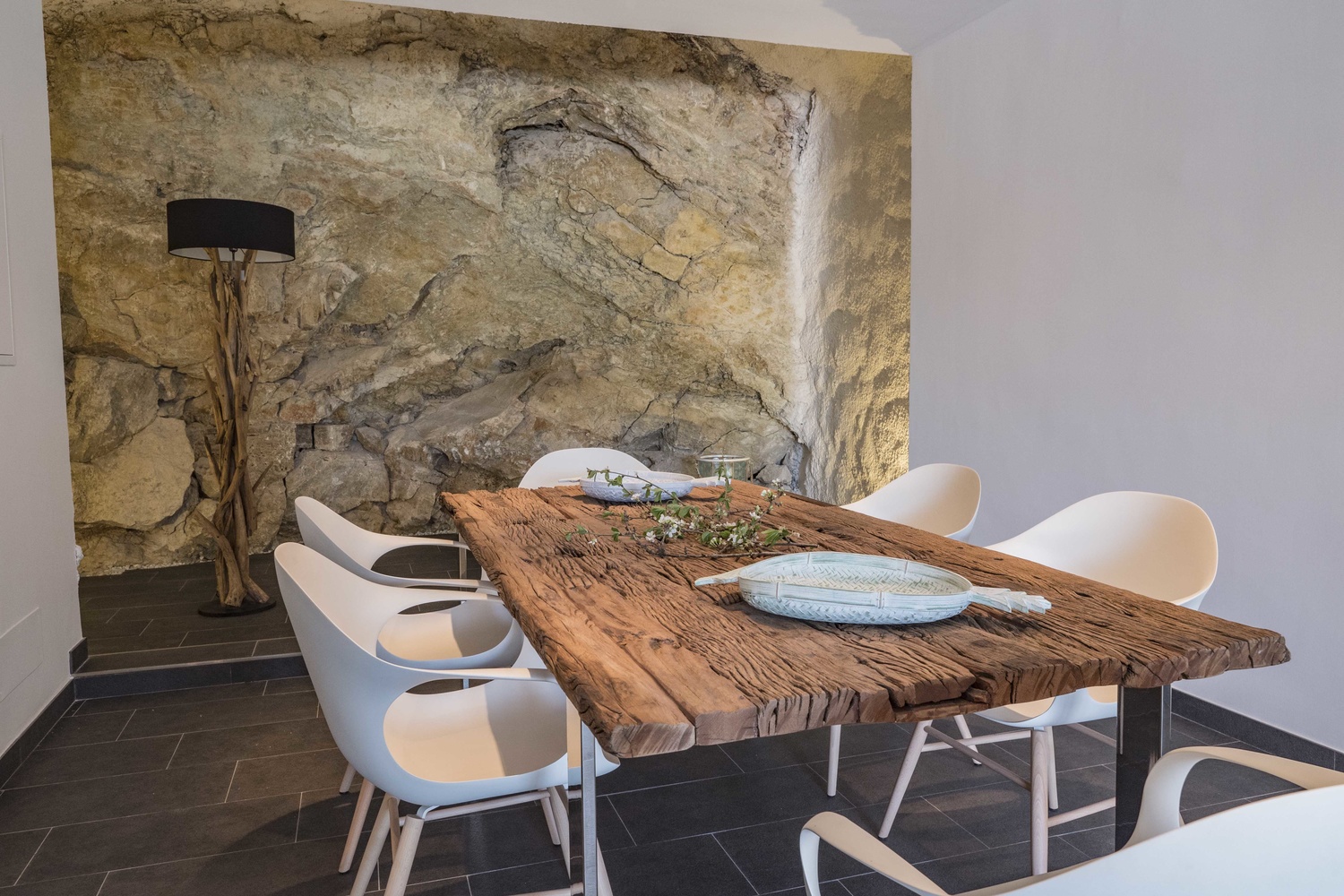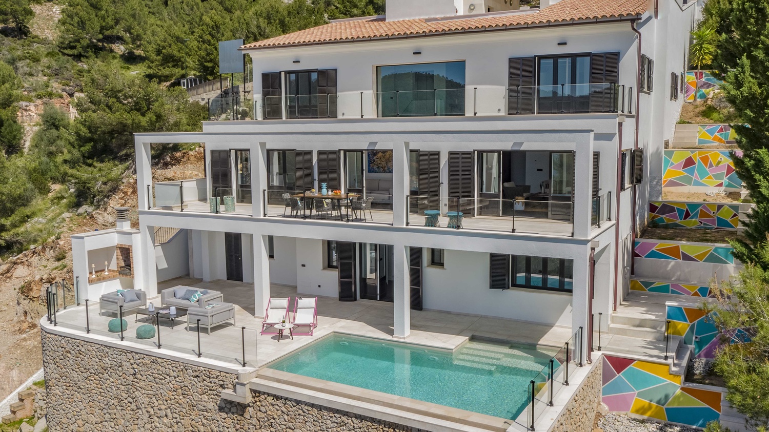 3rd basement: Lounge area incorporated in the stylish ambience in original rock face, 1 double bedroom, 1 separate bathroom, infinity pool with outdoor shower, a barbecue grill and a terraced garden. The villa has been tastefully and luxuriously furnished by the owners in collaboration with a local Mallorquín furniture store.