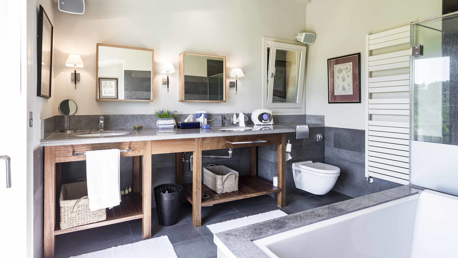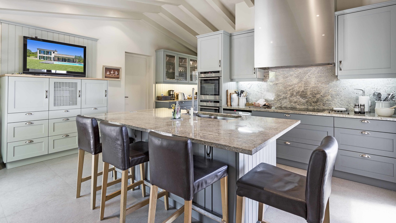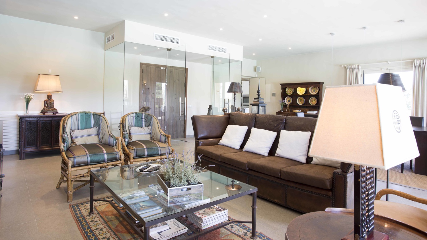 Ground floor: modern glass entrance area, ample living/ dining room, grand modern country kitchen, second living room, 3 bedrooms each with bathroom en suite, guest toilet, laundry area