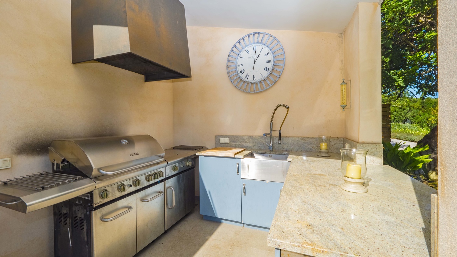 Outdoor area: ample covered terraces with completely equipped summer kitchen, flat mediterranean garden with own water well, salt chlorinate pool, garage for two cars
